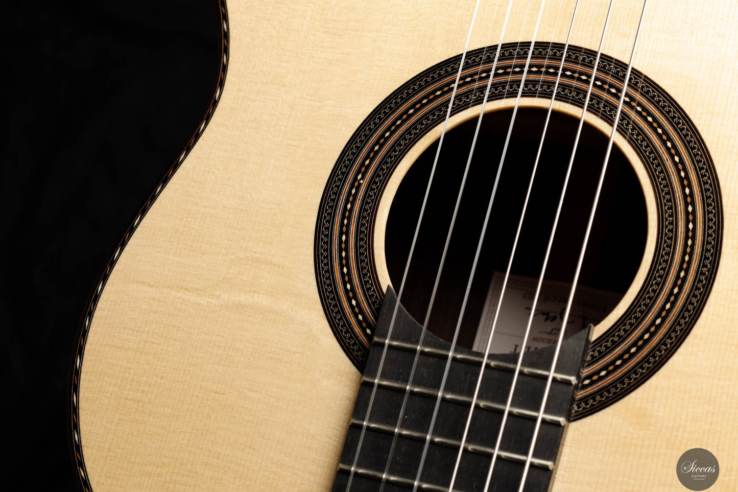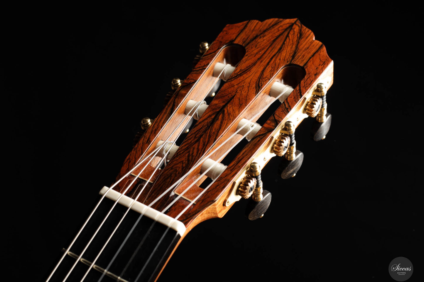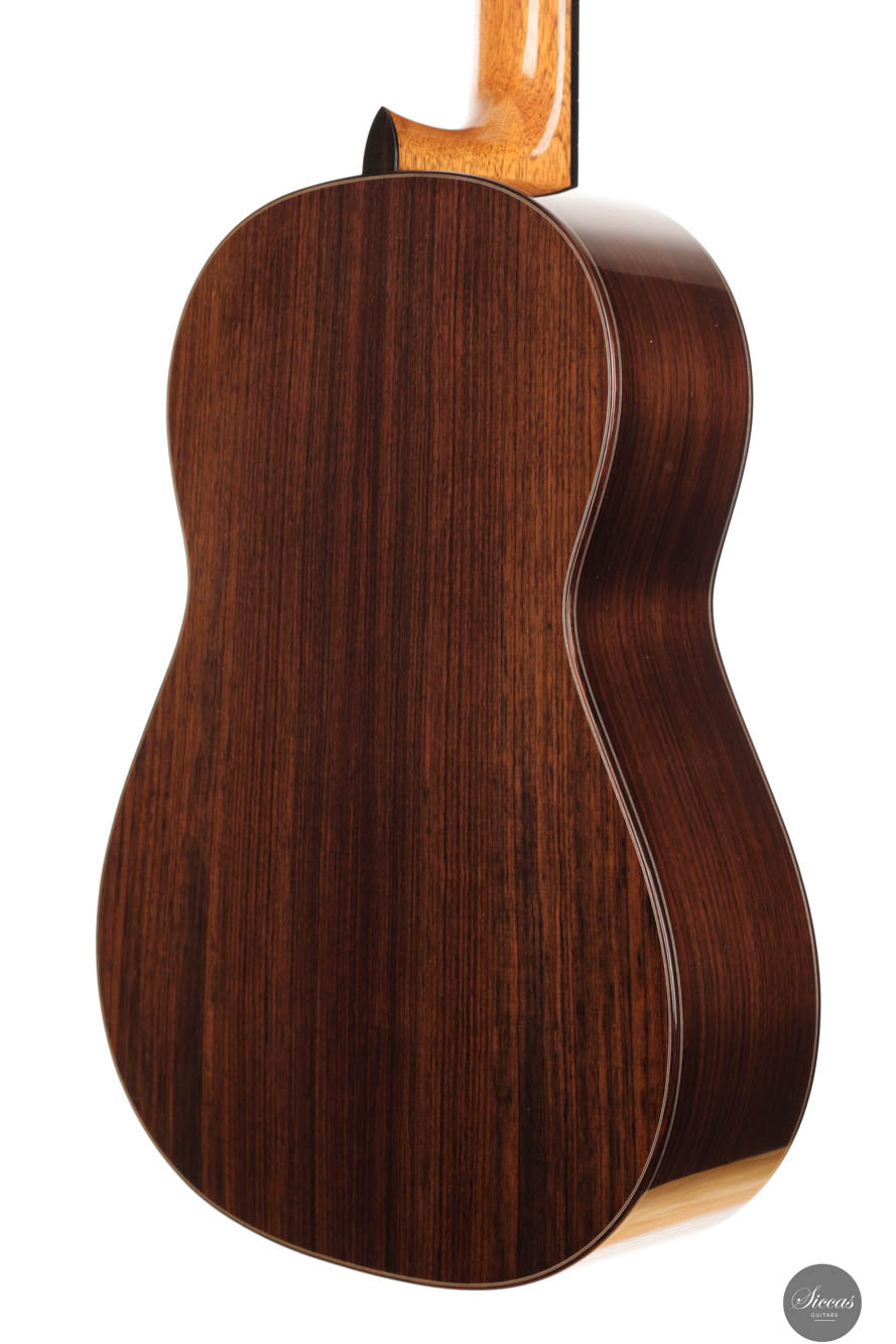 This Walter Verreydt guitar, with its lattice bracing, stands as a grandiose achievement in the realm of concert instruments, exuding sophistication and completeness in every aspect. The guitar's exceptional sonority and response set it apart, but it's the breadth of tonal colors that truly captivates and inspires. Each note played on this guitar resonates with a unique vibrancy, offering a spectrum of sound that is both vast and nuanced. The first E-string, in particular, is remarkable for its liveliness and freedom, allowing it to express its singing voice with impressive ease. This quality makes the guitar not only a joy to play but also a versatile instrument, capable of handling a wide range of musical styles and expressions with finesse. It should also be emphasized that the sides of this guitar are reinforced with a double layer of cypress, enhancing its structural integrity and significantly boosting its sound projection.