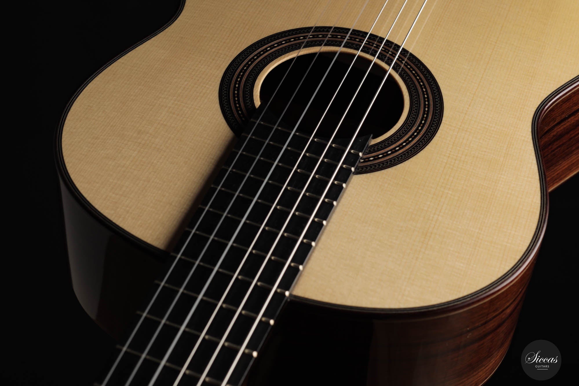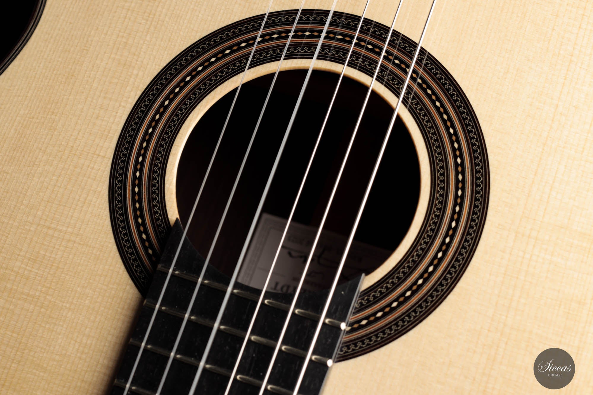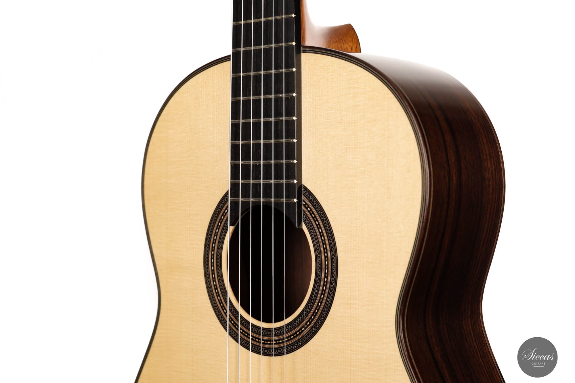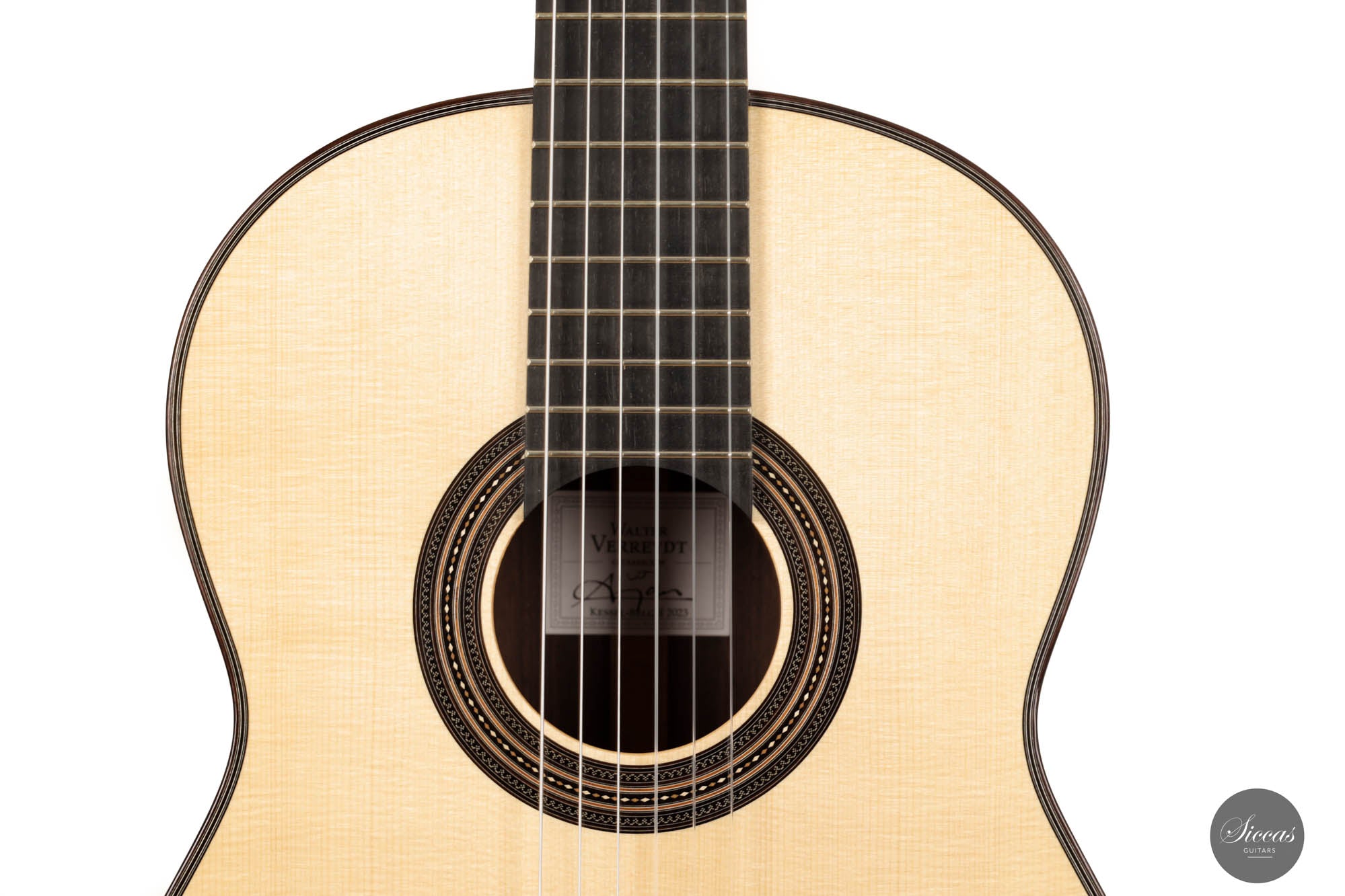 This 2023 Walter Verreydt guitar is the quintessence of a classical concert guitar, sophisticated and complete. This guitar has a spruce top and Indian rosewood back and sides. This instrument also features Walter Verreydt's latest mosaic design in the rosette, adding to the beauty of this already exceptional instrument. The intricate and subtle update to the rosette's mosaic design showcases the luthier's constant pursuit of excellence and is a stunning feat of refinement and mastery of craftsmanship.