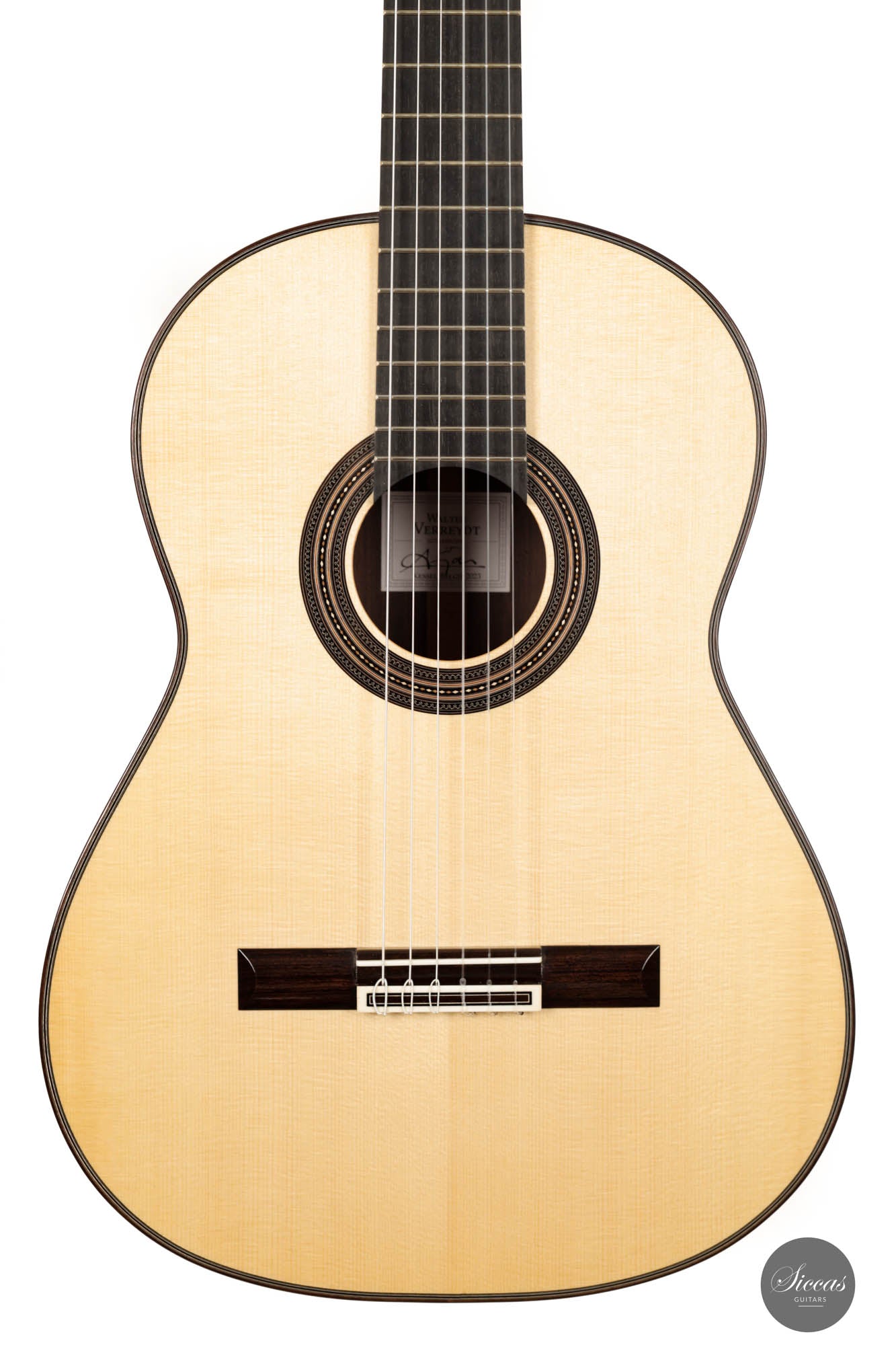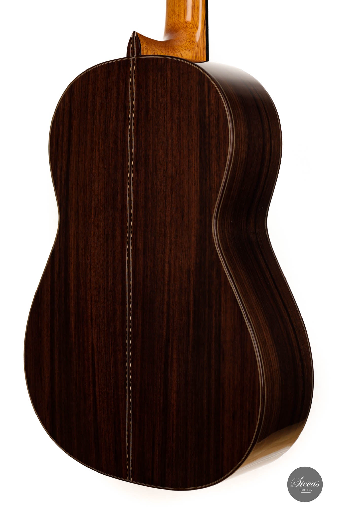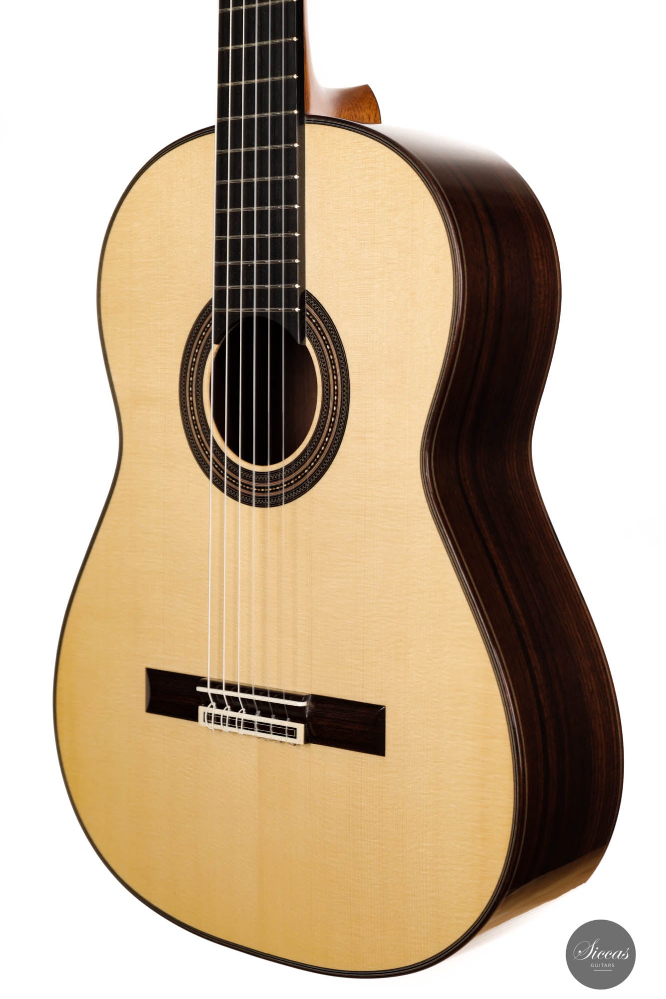 This 2023 Walter Verreydt guitar is the quintessence of a classical concert guitar, sophisticated and complete. This guitar has a spruce top and Indian rosewood back and sides. This instrument also features Walter Verreydt's latest mosaic design in the rosette, adding to the beauty of this already exceptional instrument. The intricate and subtle update to the rosette's mosaic design showcases the luthier's constant pursuit of excellence and is a stunning feat of refinement and mastery of craftsmanship.