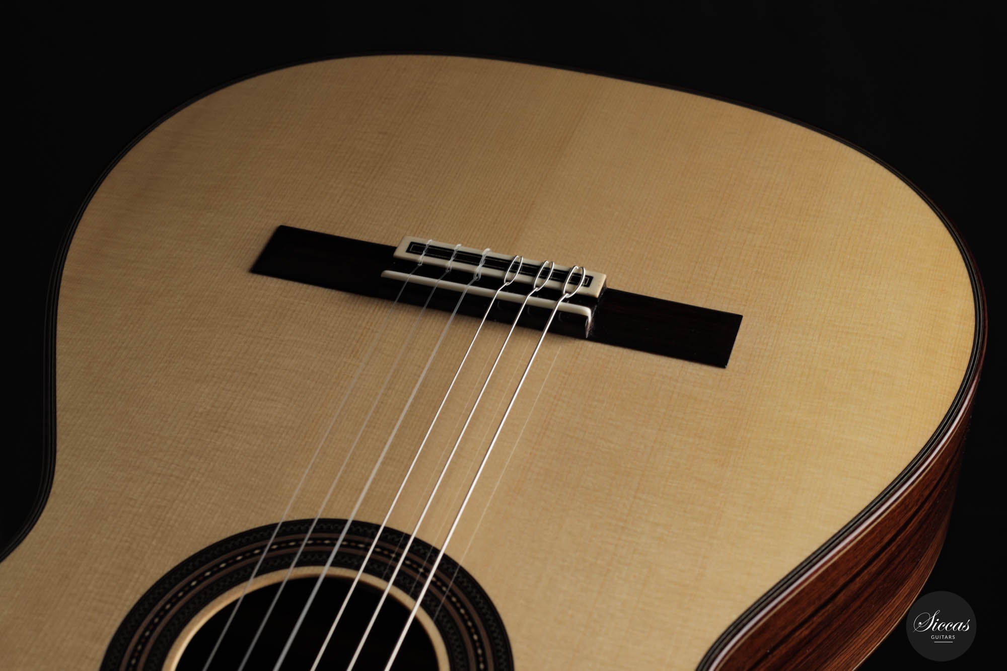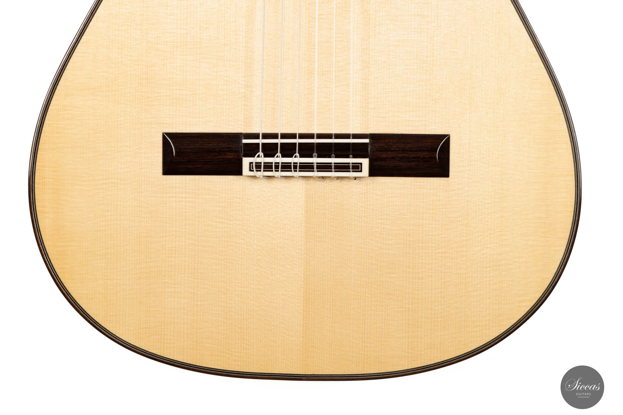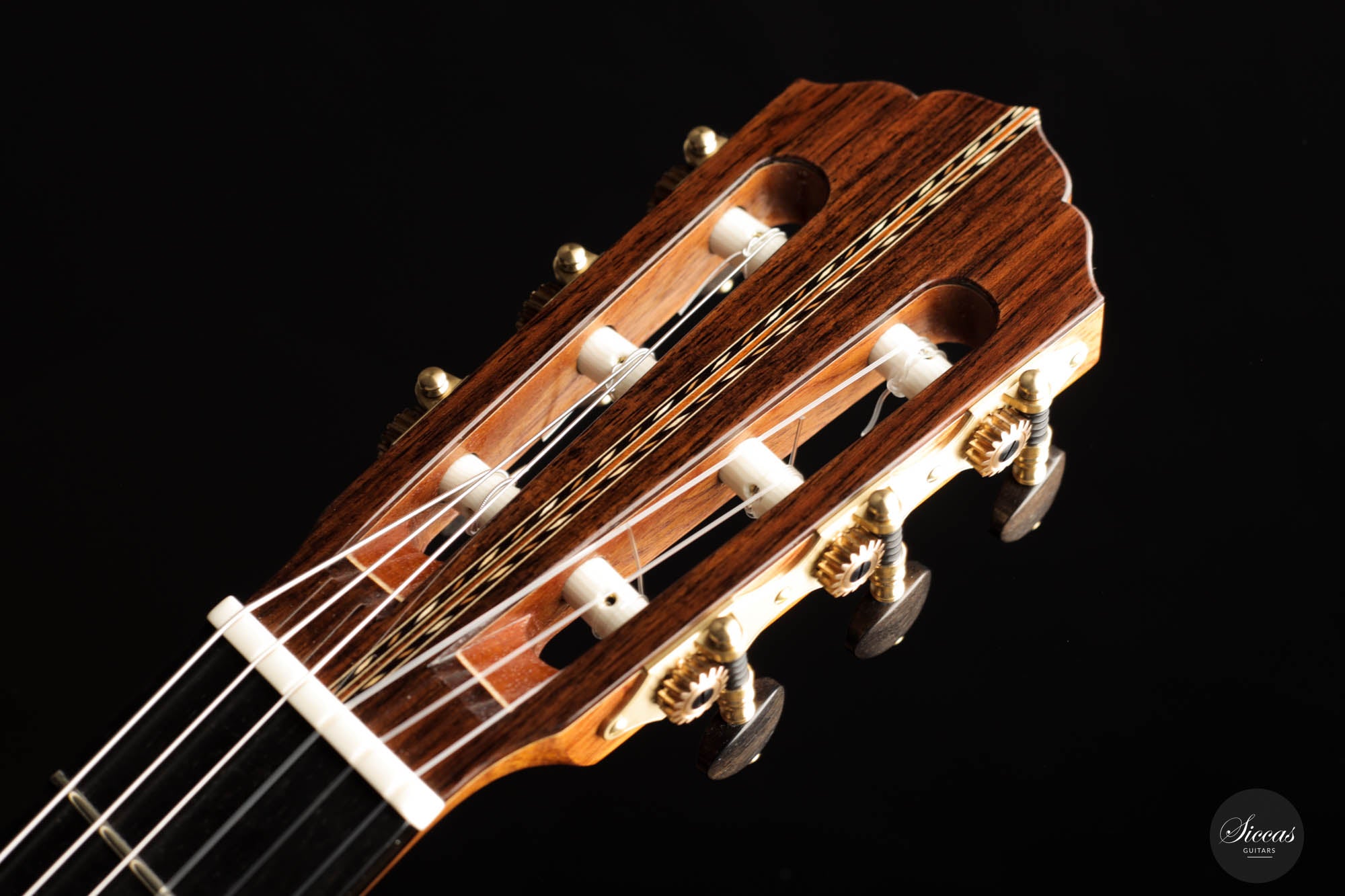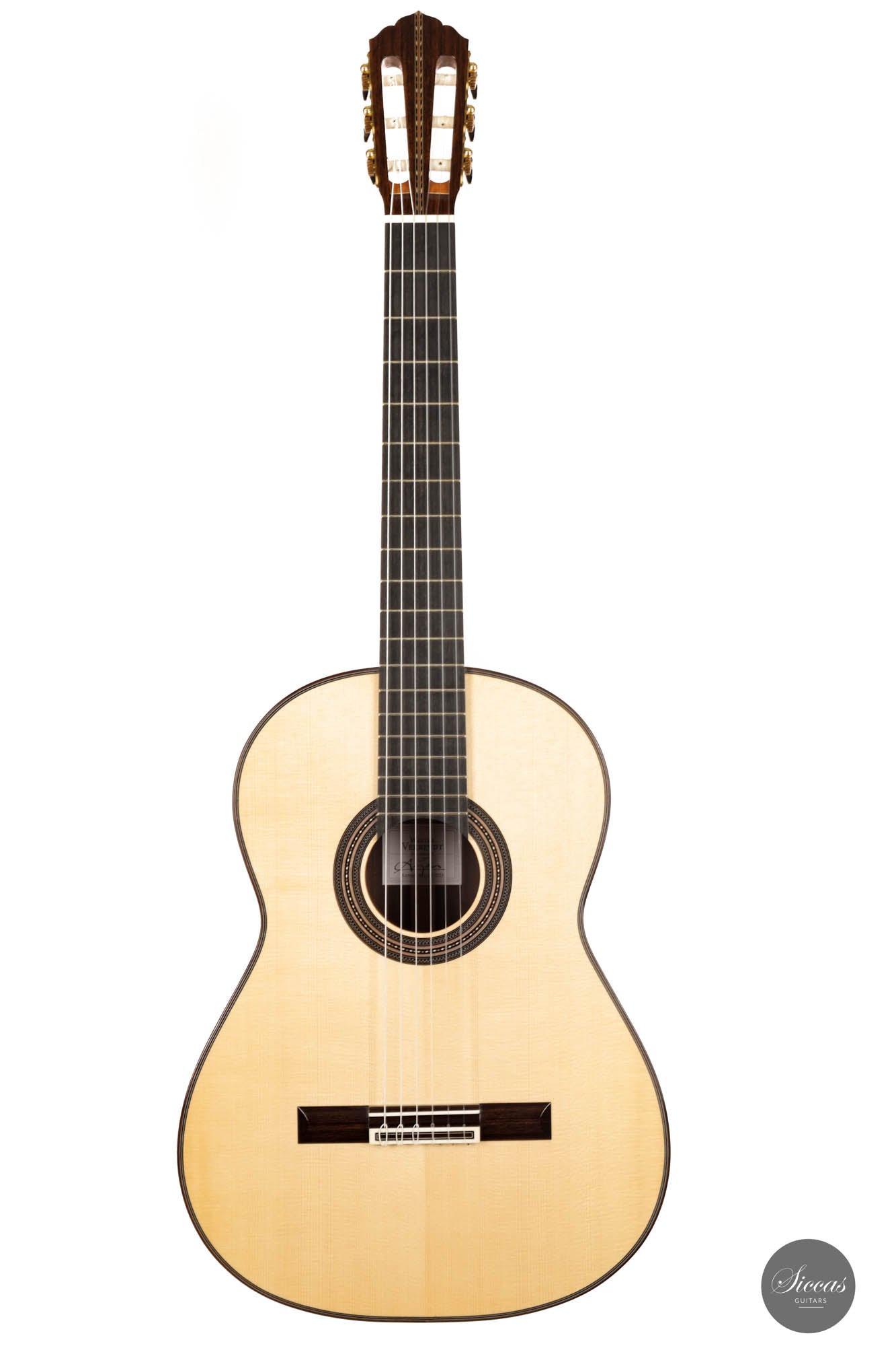 This 2023 Walter Verreydt guitar is the quintessence of a classical concert guitar, sophisticated and complete. This guitar has a spruce top and Indian rosewood back and sides. This instrument also features Walter Verreydt's latest mosaic design in the rosette, adding to the beauty of this already exceptional instrument. The intricate and subtle update to the rosette's mosaic design showcases the luthier's constant pursuit of excellence and is a stunning feat of refinement and mastery of craftsmanship.