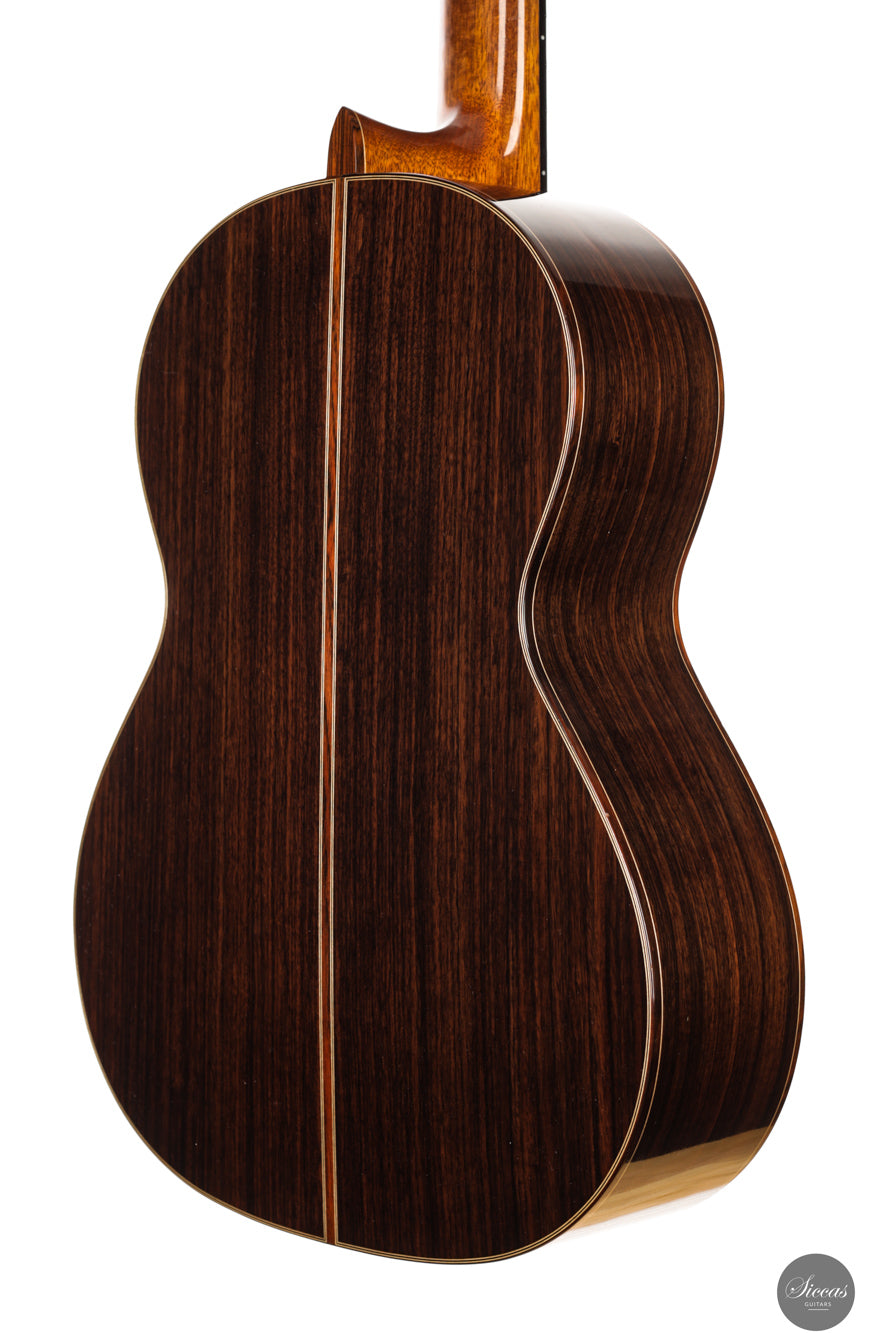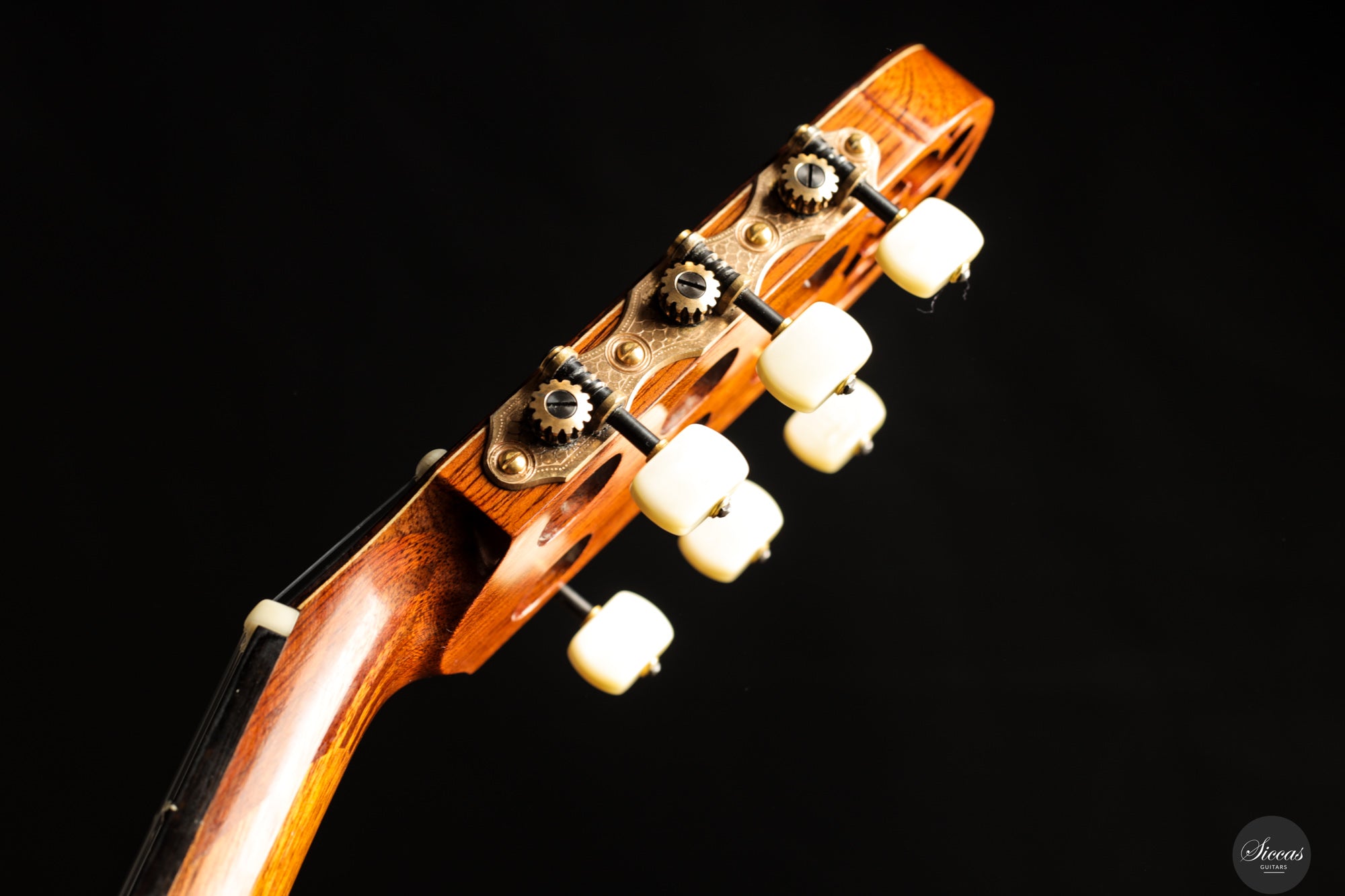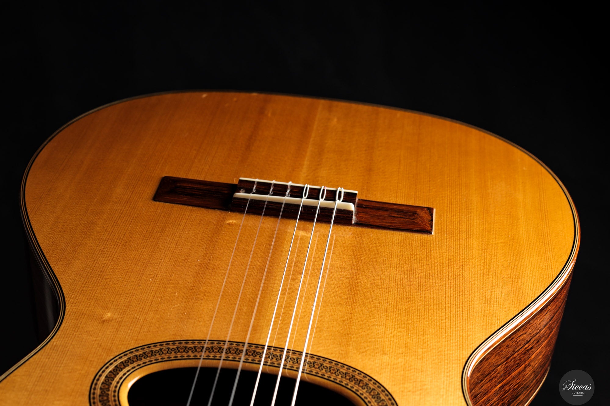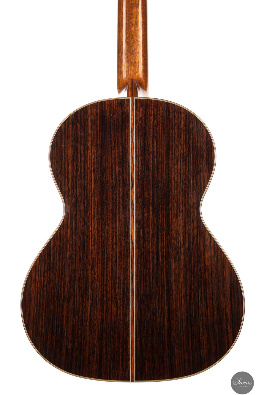 This guitar, No. 406 from 1984, is a clear example of Vogt’s independent approach. The spruce top carries an oval soundhole that is elongated in the string direction instead of being circular, which gives the instrument an immediately recognisable appearance. The outline of the body is fuller in the central section than on many standard models and creates a generous plantilla. The back and sides are made of Indian rosewood, and both the soundboard and the body are finished in a transparent polyurethane that protects the wood while keeping the natural figure visible. The headstock is richly carved and reveals the amount of careful handwork involved. Landstorfer tuners complete the set up.