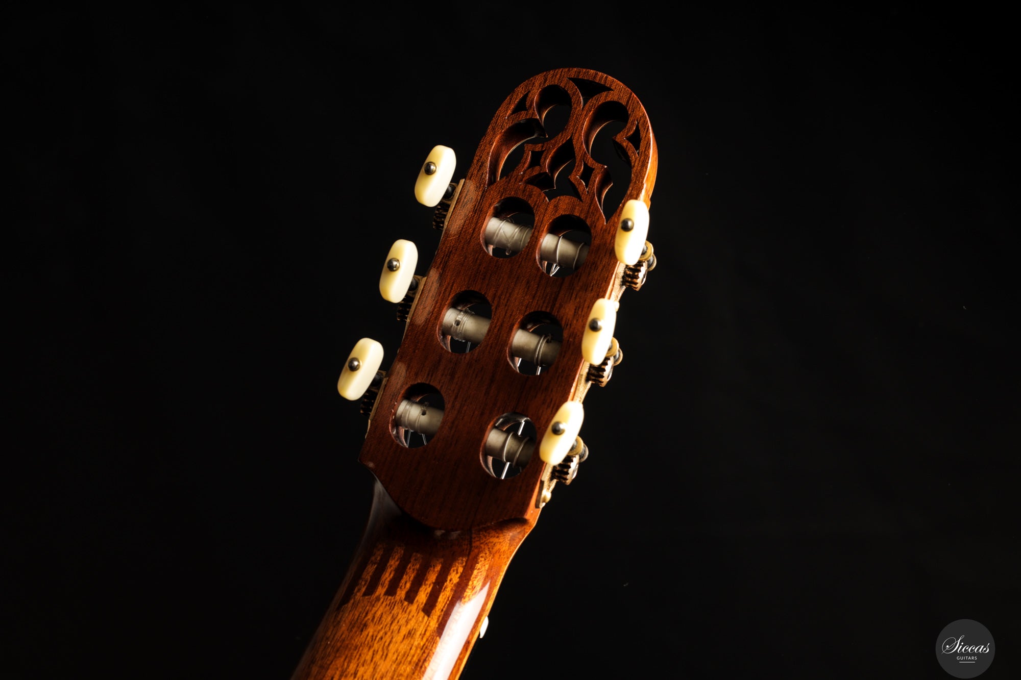 One of the most striking construction details is the neck joint. On the rear of the headstock transition a multi tenon interlocking joint is visible, with several vertical tongues fitting into corresponding recesses. This type of stepped joint is more familiar from high level furniture making than from guitar building and is executed here with great precision. It creates an extended area between the headstock and the first fret, so the left thumb finds an unusual amount of space and support in this region and the player experiences a very relaxed hand position.