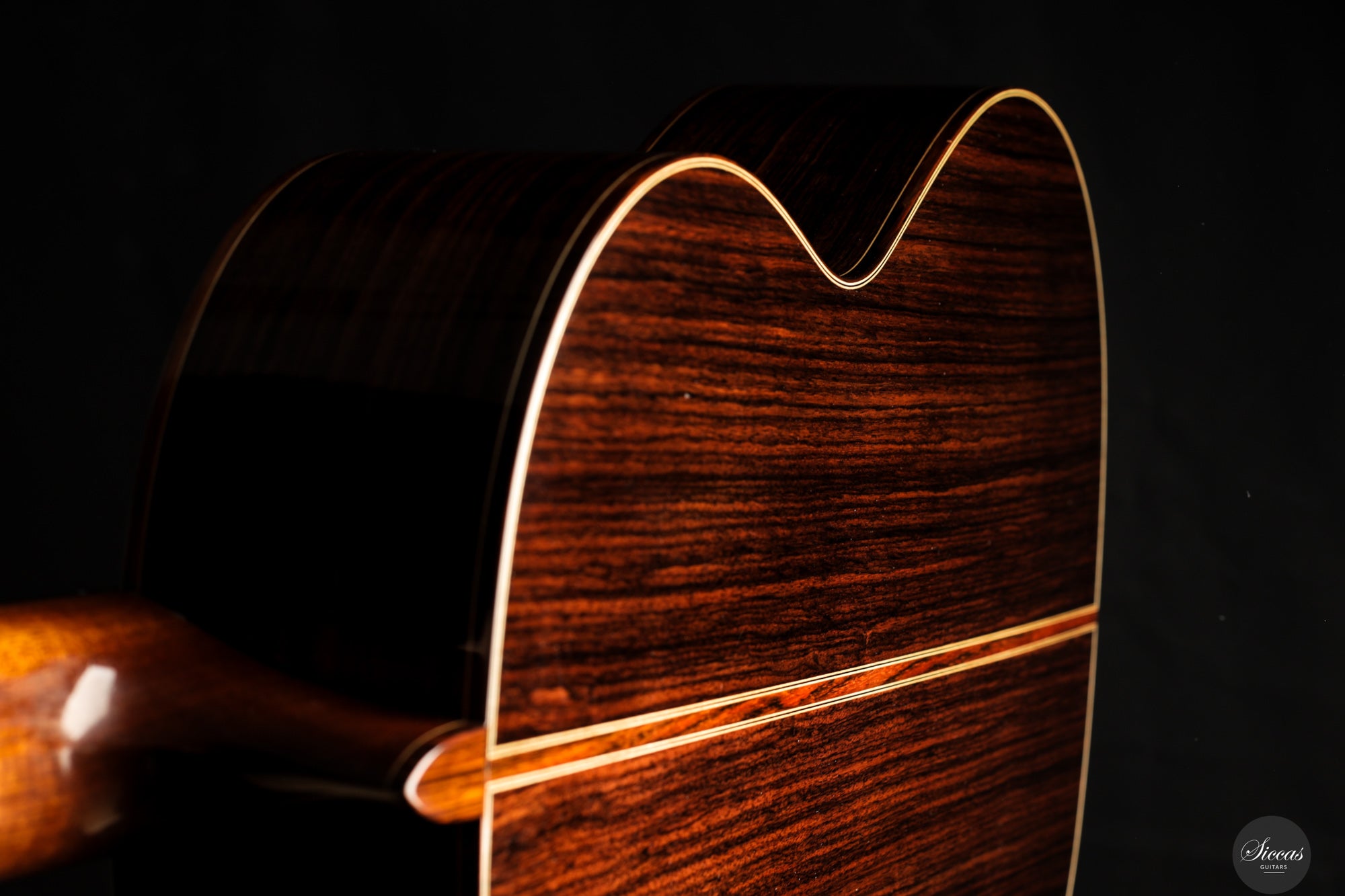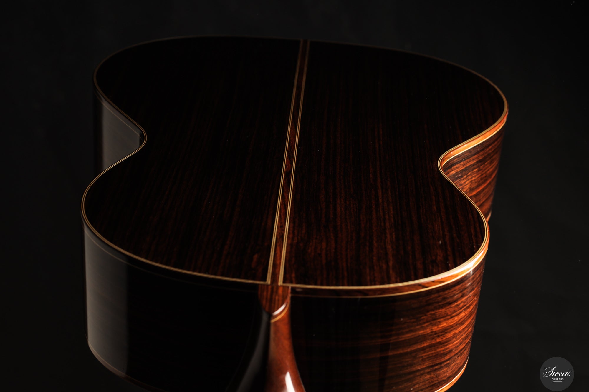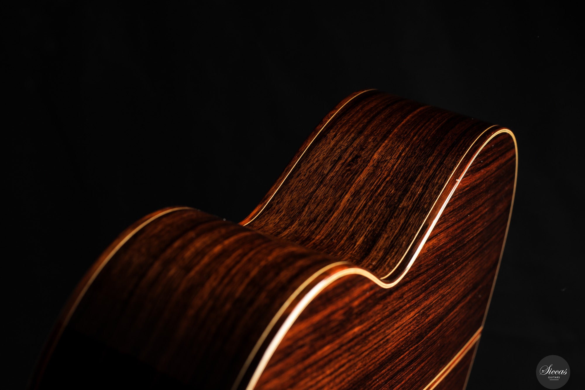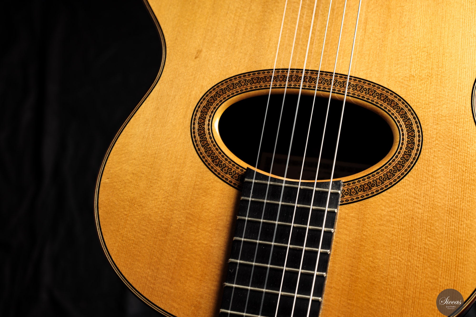 Walter Vogt’s 1984 No. 406 features a spruce top, Indian rosewood body and a rare oval soundhole, finished in clear polyurethane and fitted with Landstorfer tuners. A distinctive interlocking neck joint, visible at the back of the head transition, provides extra thumb space and remarkable comfort. The guitar has an airy, well breathing voice with soft overtones and a creamy, smooth response that makes playing feel effortless.
