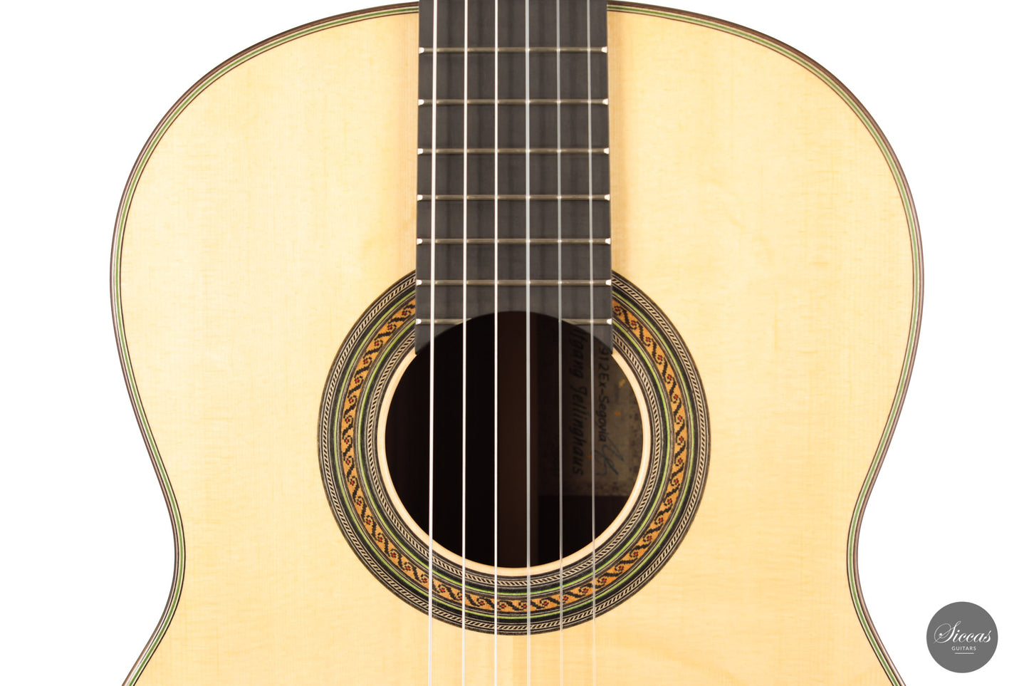 This impressive replica by Wolfgang Jellinghaus shows remarkable qualities. Inspired by the famous Manuel Ramirez guitar by Andrés Segovia from 1912, its design is faithful to the original, and its sound is also worth listening to. It develops an impressive volume of sound with a crisp and textured tonal character that supports the guitarist both in concert halls and on more intimate occasions. As is customary with Wolfgang Jellinghaus' top-of-the-line models, this guitar is fully shellac polished and built with premium solid woods.