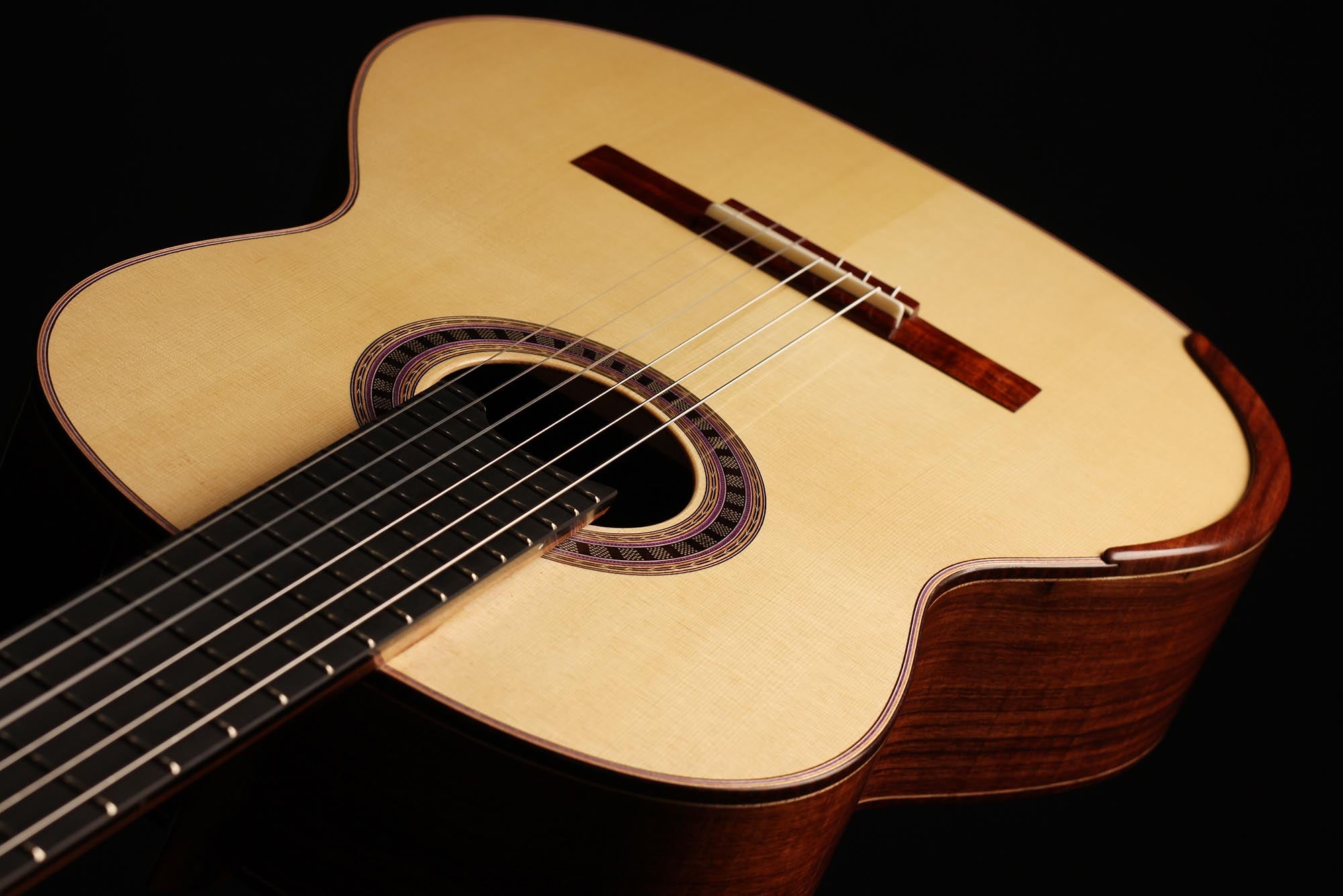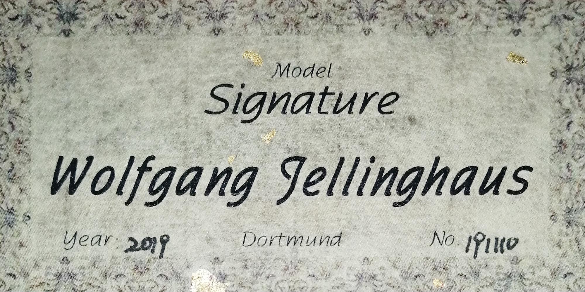 His latest series is the Wolfgang Jellinghaus Signature. This is a very modern guitar with some interesting features, such as the floating fingerboard, which is not fixed to the top, so this part of the top vibrates freely and contributes to the overall sound. The sound volume becomes very powerful, also thanks to the very light double-top construction. This makes it possible to produce a very full and room-filling tone with little effort of the right hand. Due to its 64cm scale, it is particularly easy to play, and the armrest also contributes to the overall comfort. The guitar is finished with shellac which completes the overall picture of this instrument very nicely. In this price category, the guitar is more than convincing.