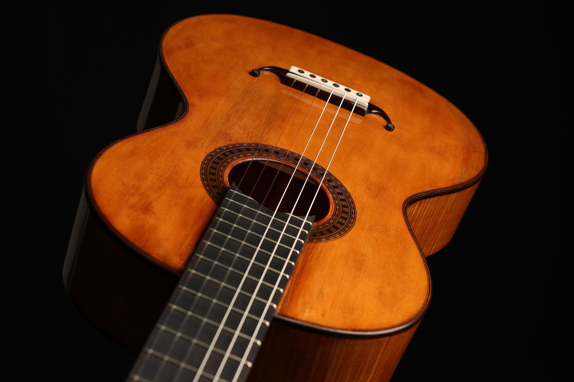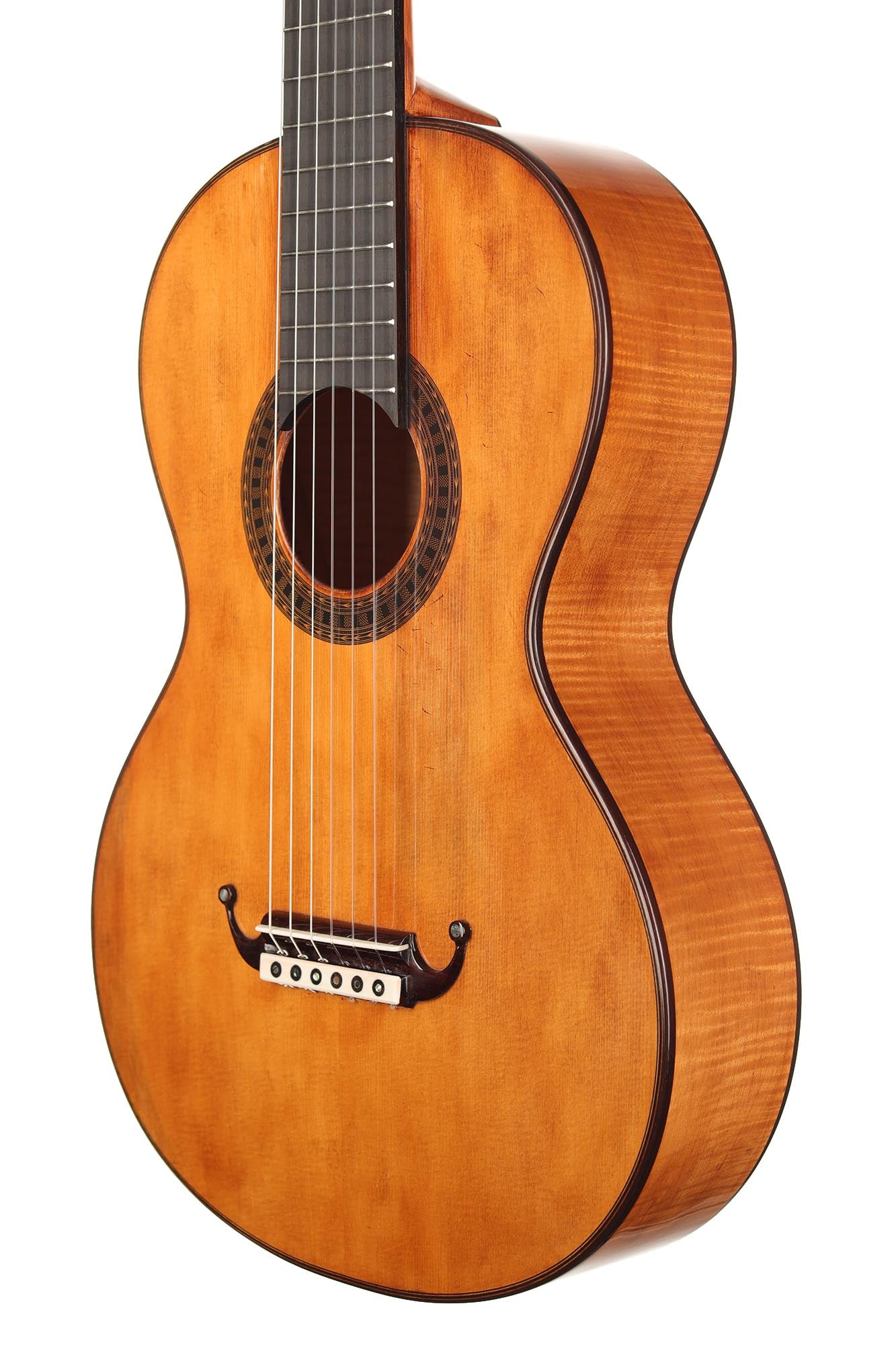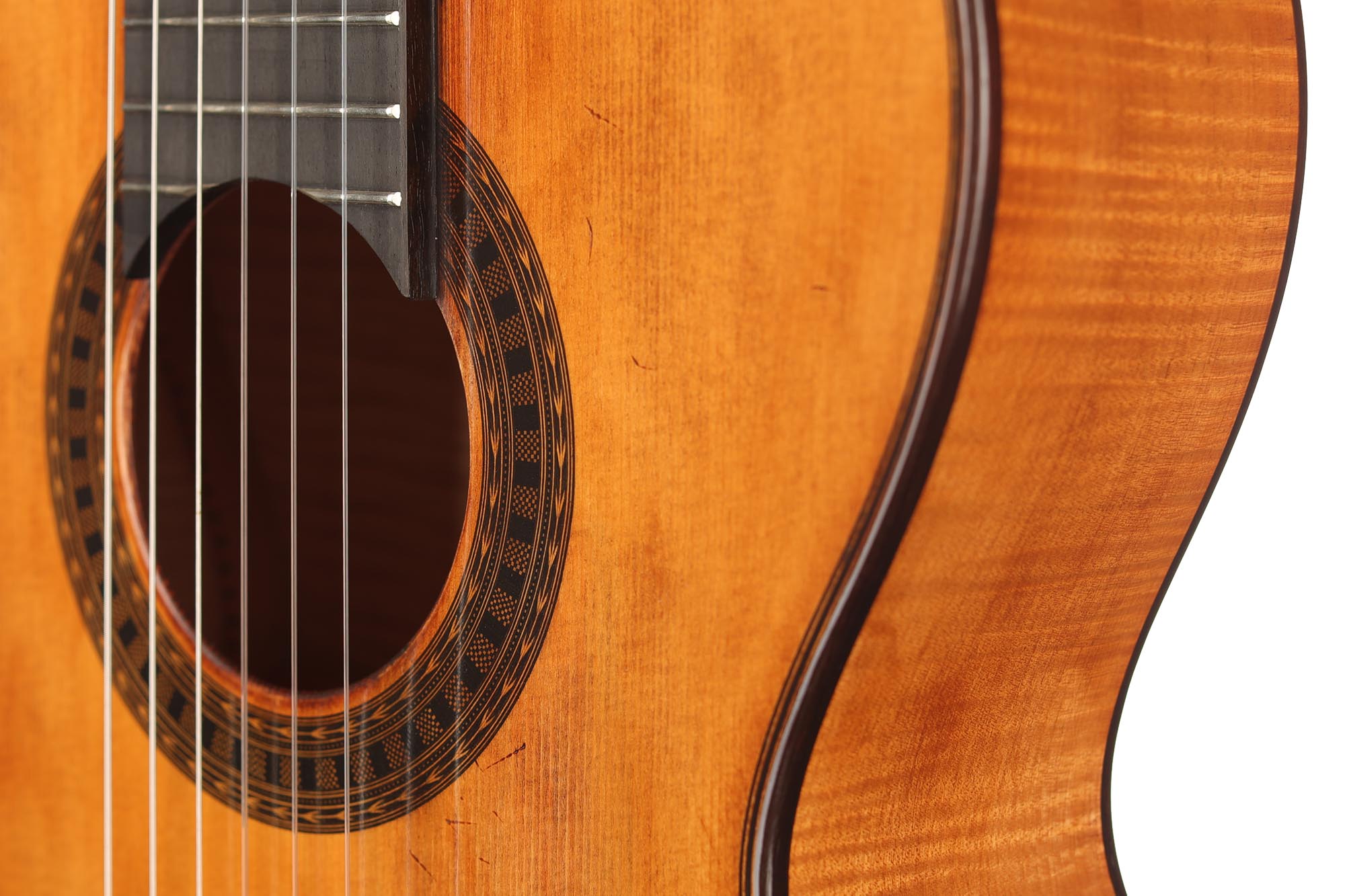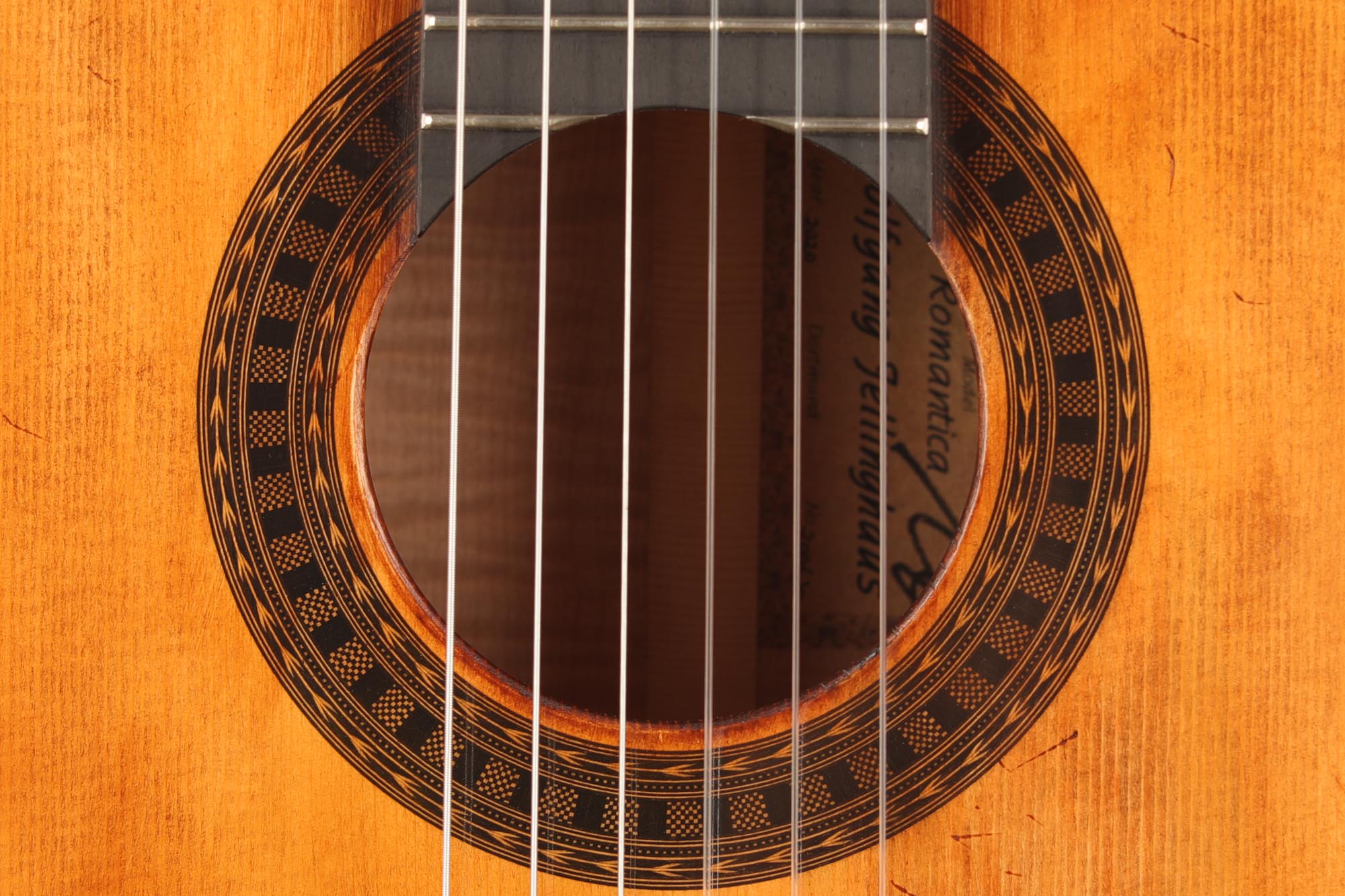 Diese Gitarre basiert auf einer Gitarre von René Lacôte, einem der bedeutendsten französischen Gitarrenbauer im 19. Jahrhundert. Dieser Nachbau wurde mit modernen Elementen kombiniert, wie etwa der moderne Kopf und die moderne Rosette. Griffbrett ist ebenso breiter als das einer romantischen Gitarren und die Gitarre dadurch leicht bespielbar. Die Decke ist aus feinster Fichte, Boden und Zargen sind aus sehr schönem geriegeltem Ahorn. Veredelt ist die Gitarre mit einem Schellackpolitur, das der Gitarre eine edle Optik verleiht. Die Mechaniken sind ebenso hochwertig und kugelgelagert, was ein sauberes und flüssiges Stimmen garantiert. Die Gitarre hat einen schönen romantischen Klang, der warm und langanhaltend ist. Auch eignet sich diese Gitarre hervorragend für Kammermusik. Hier die Vorzüge dieser Gitarre zusammengefasst: – prächtige antike Optik – ausgeglichener Klang – ideal für Kammermusik – Schellackfinish – leicht zu spielen.