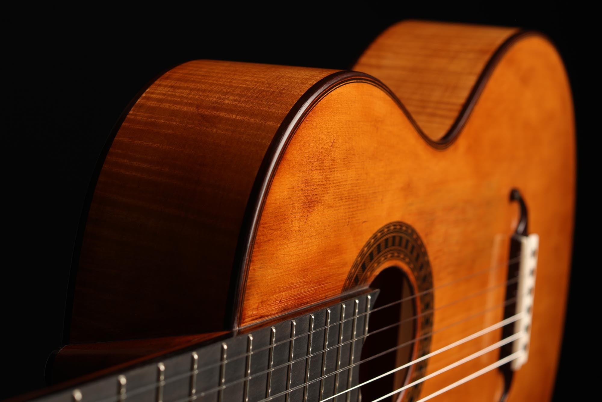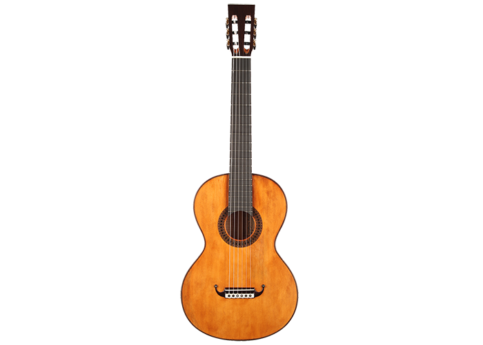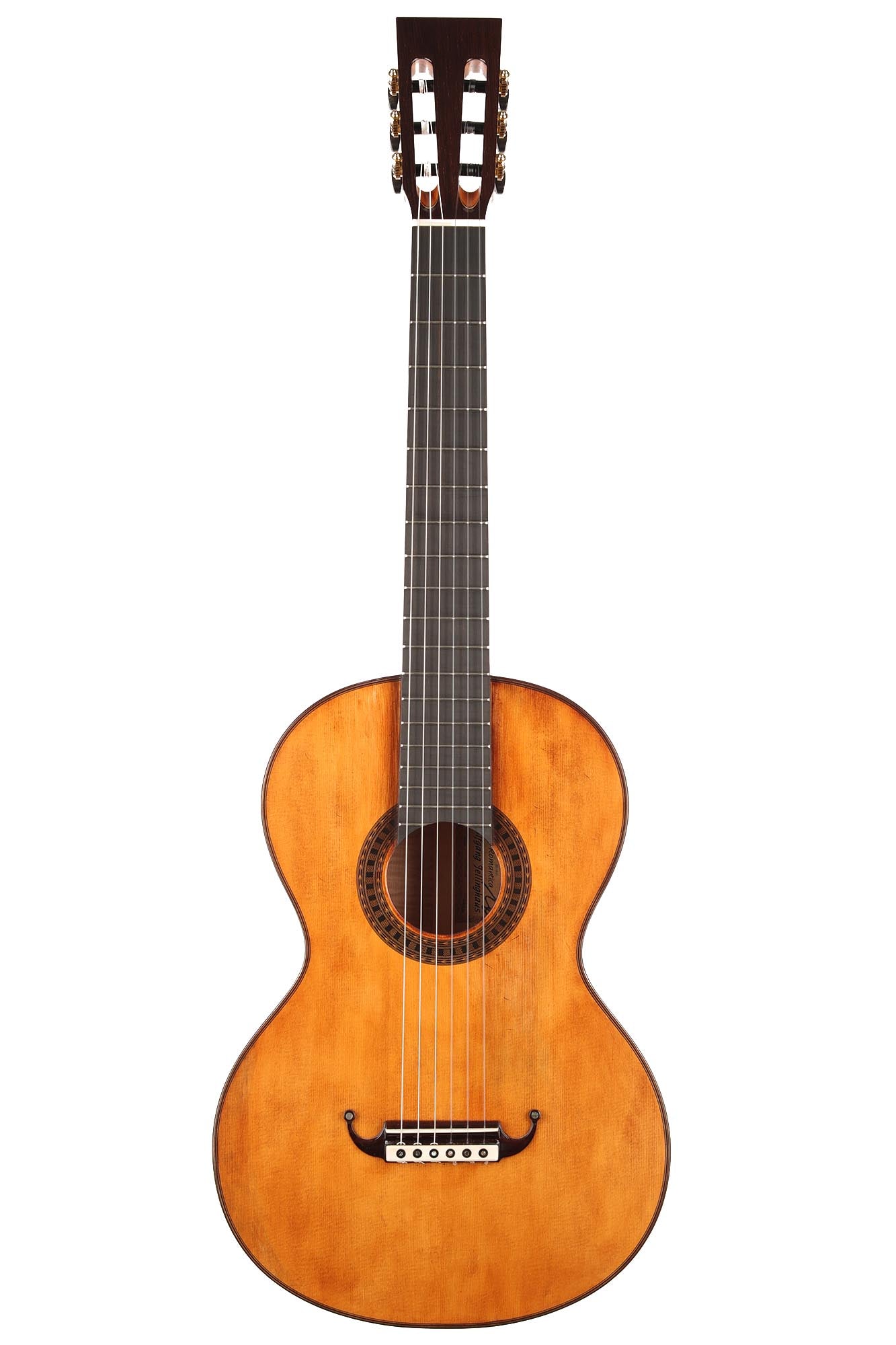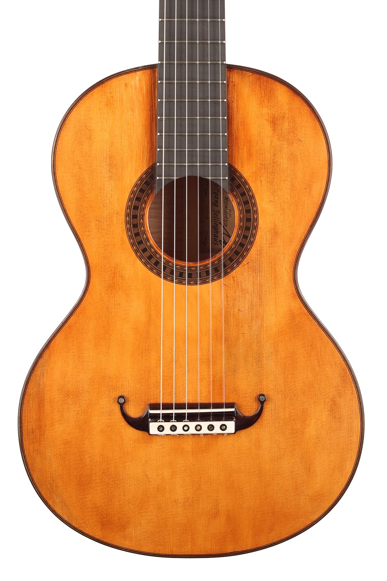 Diese Gitarre basiert auf einer Gitarre von René Lacôte, einem der bedeutendsten französischen Gitarrenbauer im 19. Jahrhundert. Dieser Nachbau wurde mit modernen Elementen kombiniert, wie etwa der moderne Kopf und die moderne Rosette. Griffbrett ist ebenso breiter als das einer romantischen Gitarren und die Gitarre dadurch leicht bespielbar. Die Decke ist aus feinster Fichte, Boden und Zargen sind aus sehr schönem geriegeltem Ahorn. Veredelt ist die Gitarre mit einem Schellackpolitur, das der Gitarre eine edle Optik verleiht. Die Mechaniken sind ebenso hochwertig und kugelgelagert, was ein sauberes und flüssiges Stimmen garantiert. Die Gitarre hat einen schönen romantischen Klang, der warm und langanhaltend ist. Auch eignet sich diese Gitarre hervorragend für Kammermusik. Hier die Vorzüge dieser Gitarre zusammengefasst: – prächtige antike Optik – ausgeglichener Klang – ideal für Kammermusik – Schellackfinish – leicht zu spielen.