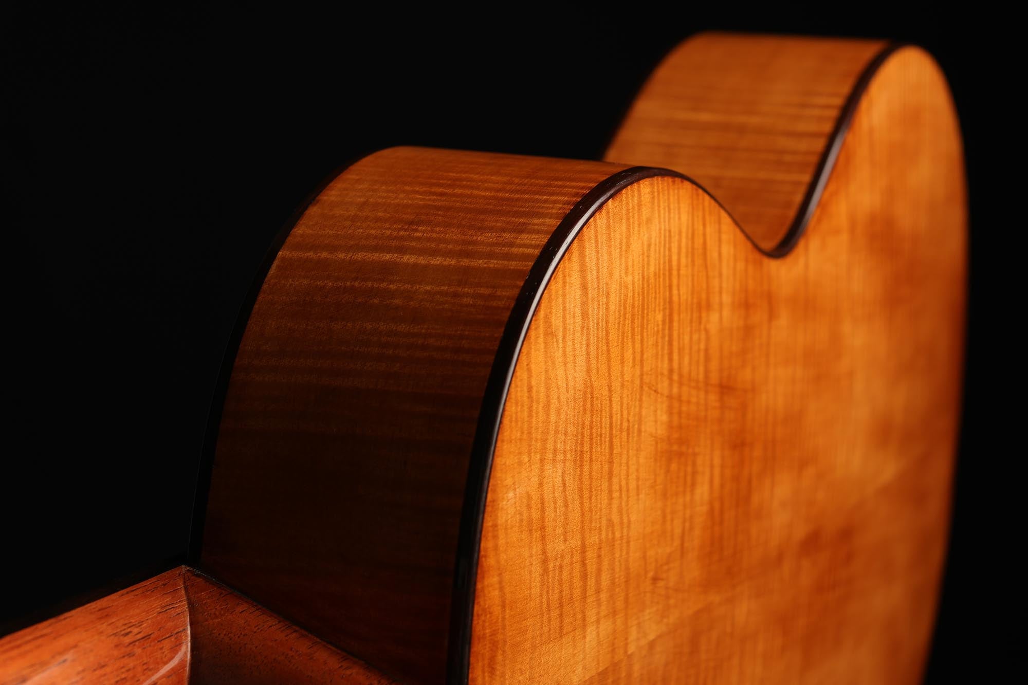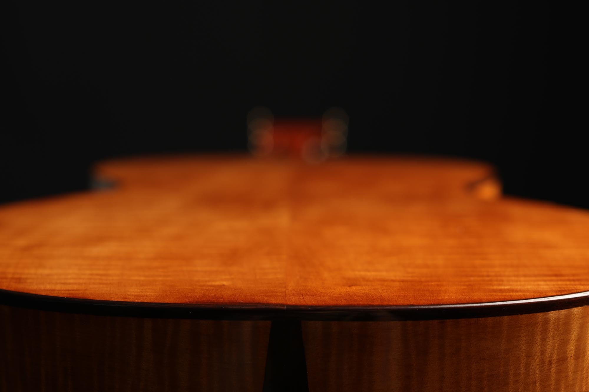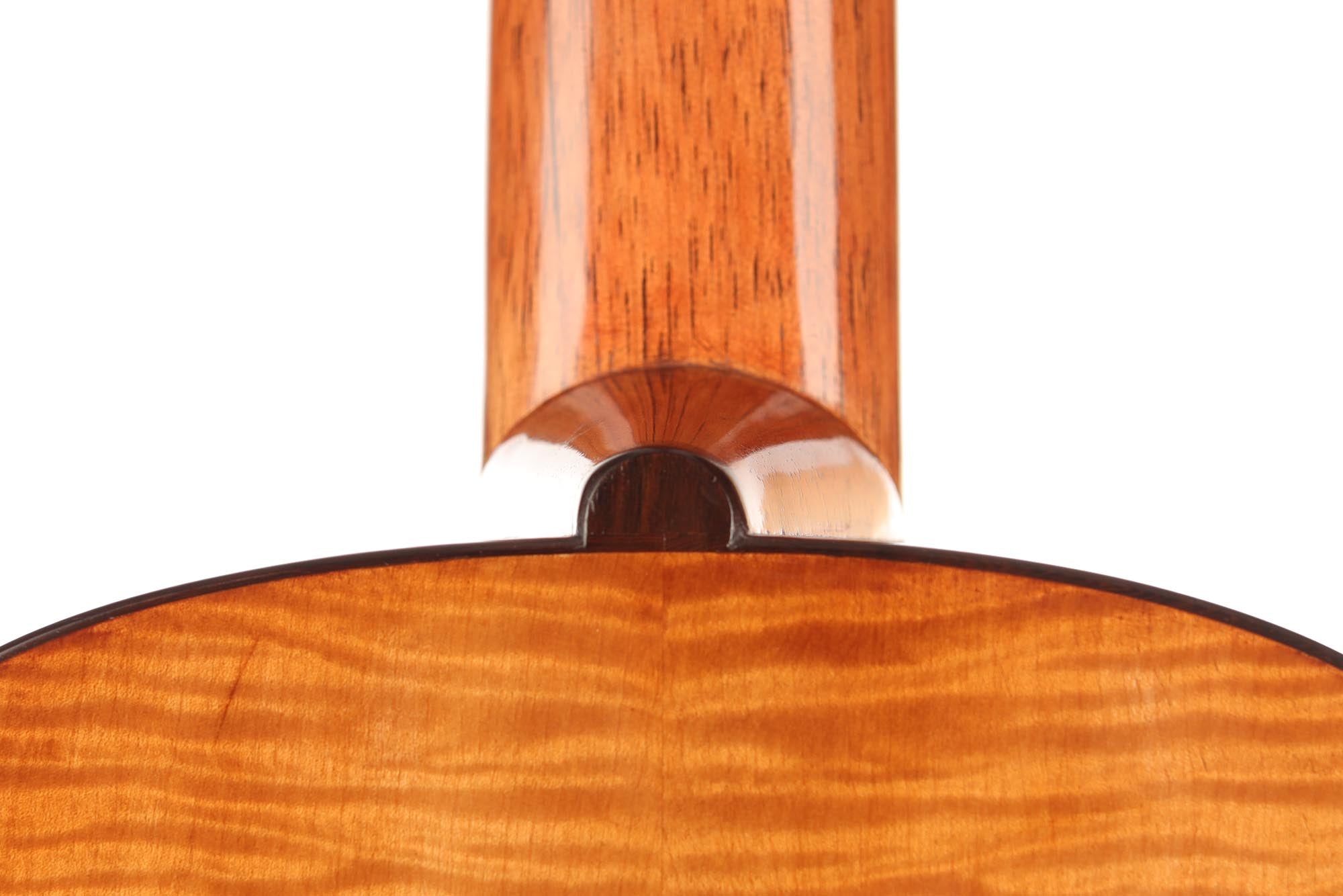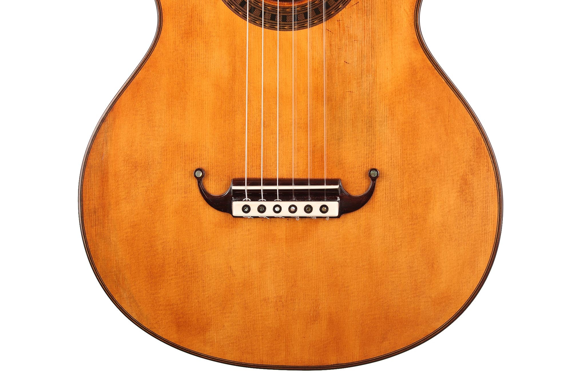 Diese Gitarre basiert auf einer Gitarre von René Lacôte, einem der bedeutendsten französischen Gitarrenbauer im 19. Jahrhundert. Dieser Nachbau wurde mit modernen Elementen kombiniert, wie etwa der moderne Kopf und die moderne Rosette. Griffbrett ist ebenso breiter als das einer romantischen Gitarren und die Gitarre dadurch leicht bespielbar. Die Decke ist aus feinster Fichte, Boden und Zargen sind aus sehr schönem geriegeltem Ahorn. Veredelt ist die Gitarre mit einem Schellackpolitur, das der Gitarre eine edle Optik verleiht. Die Mechaniken sind ebenso hochwertig und kugelgelagert, was ein sauberes und flüssiges Stimmen garantiert. Die Gitarre hat einen schönen romantischen Klang, der warm und langanhaltend ist. Auch eignet sich diese Gitarre hervorragend für Kammermusik. Hier die Vorzüge dieser Gitarre zusammengefasst: – prächtige antike Optik – ausgeglichener Klang – ideal für Kammermusik – Schellackfinish – leicht zu spielen.