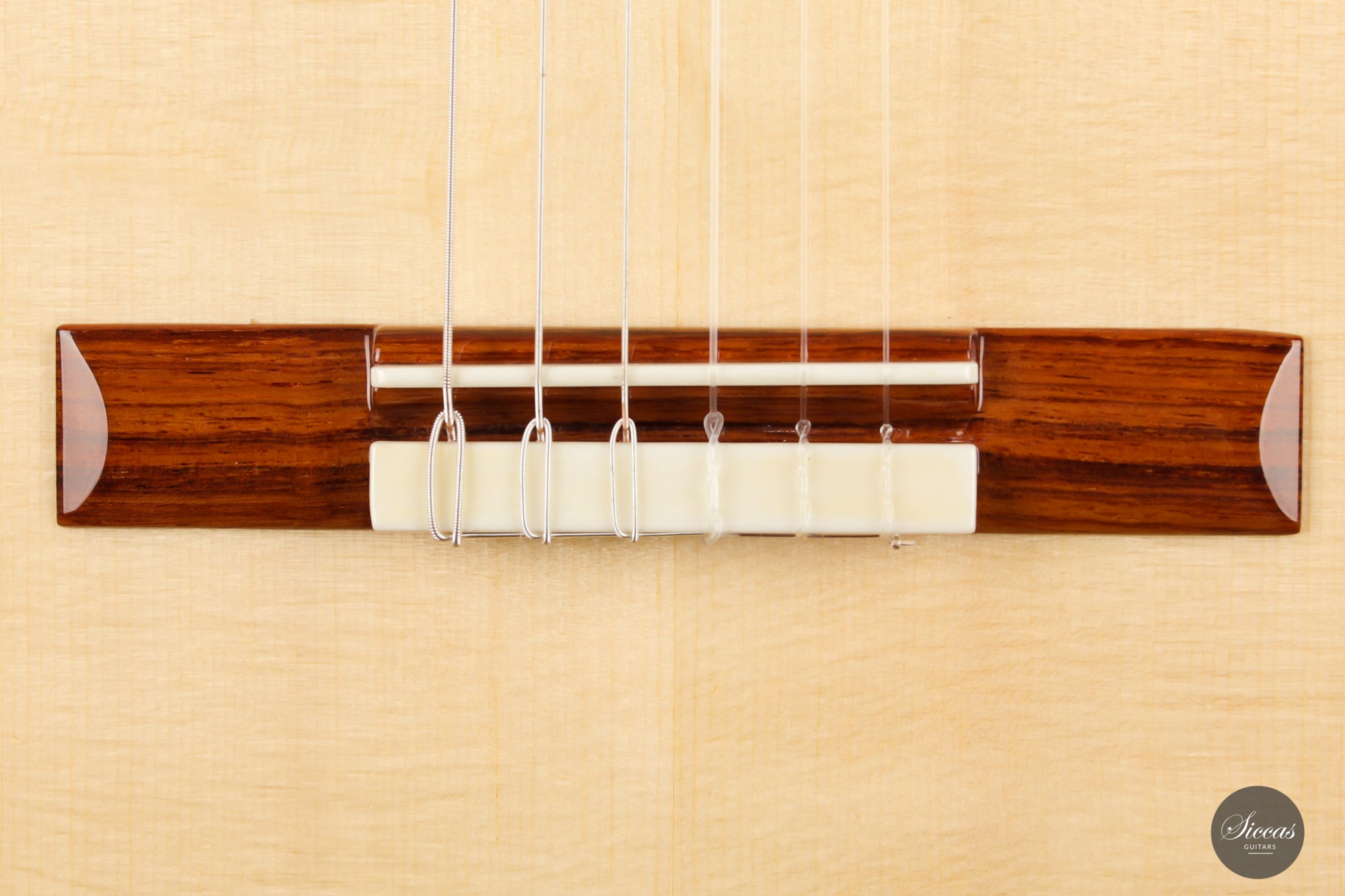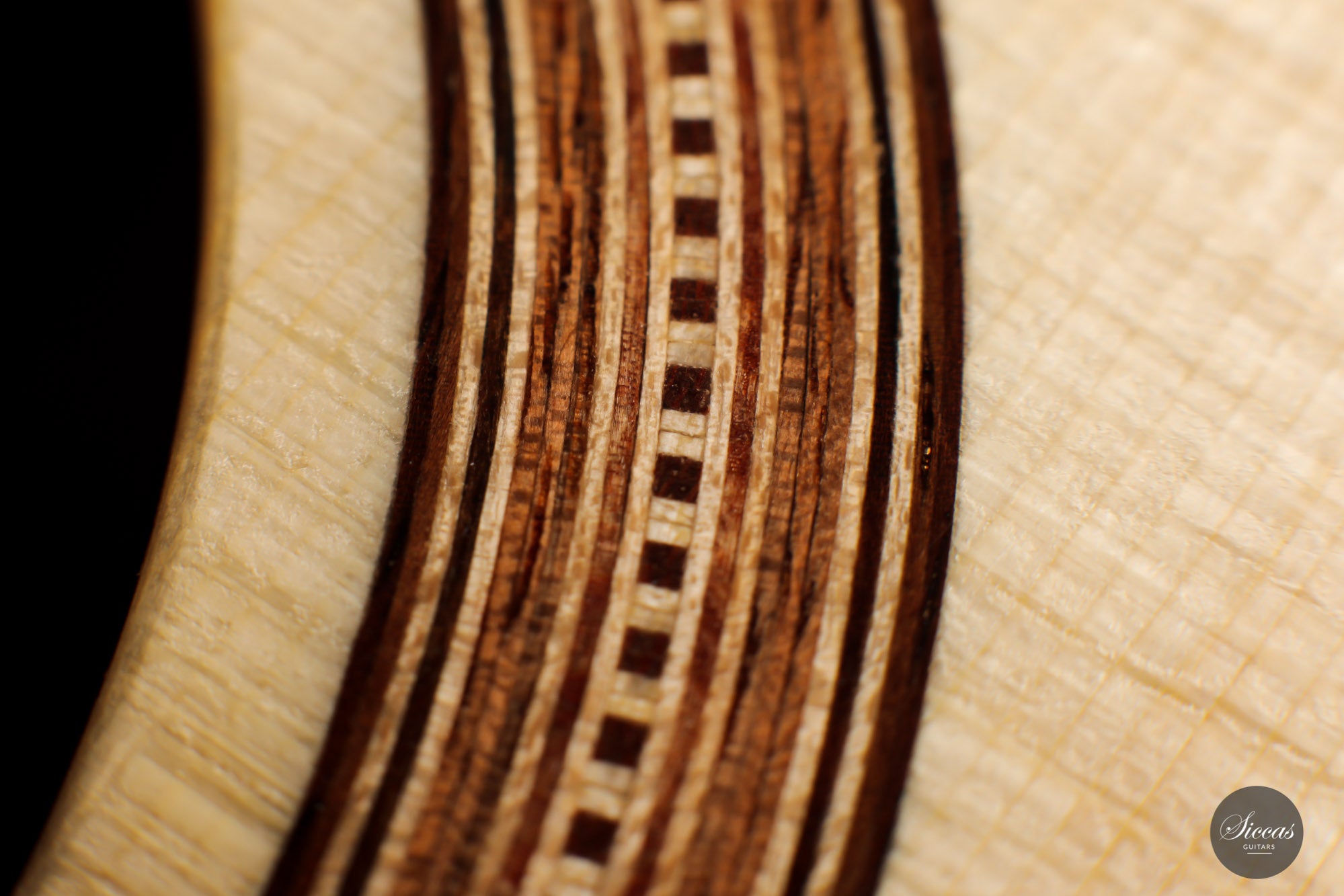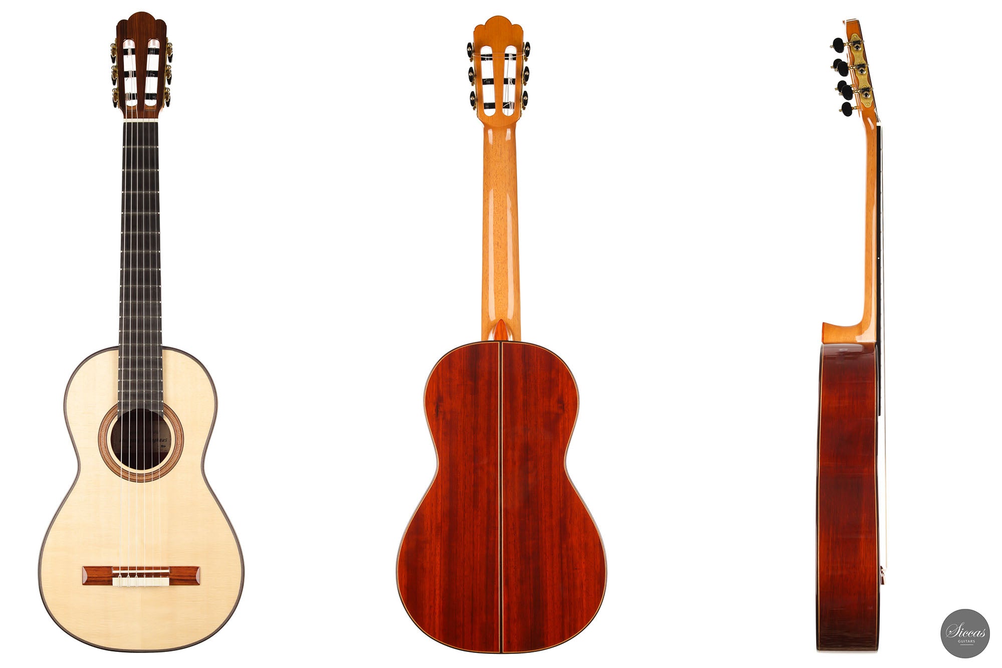 This lovely “Torres 77” model is a joy to play. Smaller bodied and offering a unique playing experience, this model is light, responsive and has a surprisingly grand volume. Padouk back and sides and shiny PU finish have been chosen for this handmade “Torres 77” opus. Moreover, the spruce top is of excellent quality, with bear claws and beautiful grain.