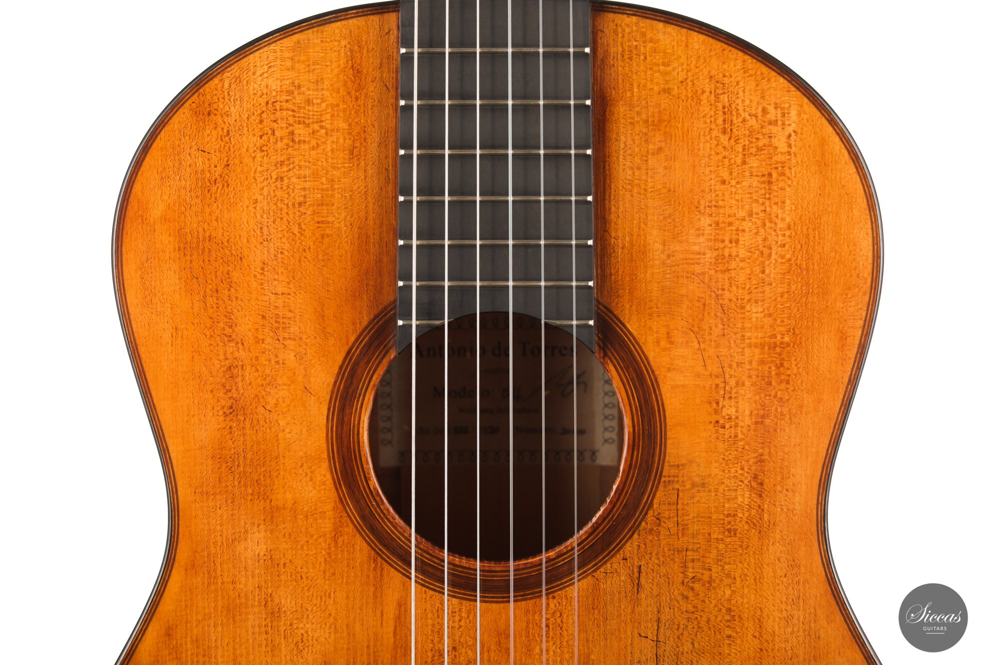 Lightweight, responsive, and visually captivating, this replica of the fourth guitar by Antonio de Torres is an absolute gem. This homage to one of Antonio de Torres' most famous instruments, also known as "La Leona", is phenomenal. One can actually feel the special charm coming from the warm tone and the singing ability of this beautiful guitar. The easy responsiveness of the instrument is a source of great pleasure, giving it a uniquely playful character and an inspiring expression.
