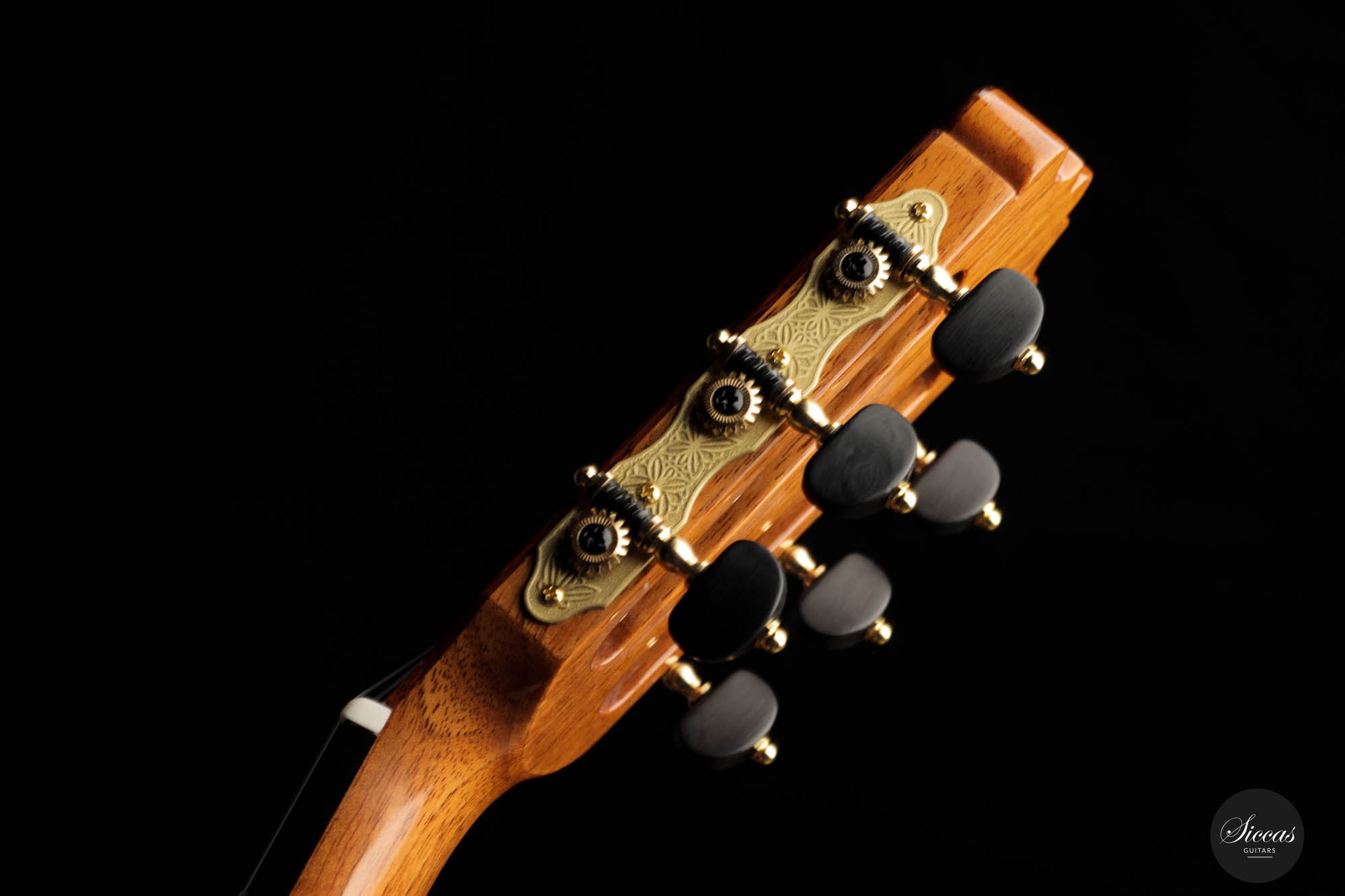 The guitar built by Wolfgang Jellinghaus is a stunning instrument, modeled after the 1912 Manuel Ramirez guitar used by renowned classical guitarist Andres Segovia. Structurally, it is an exact replica of the original, but with some modern touches. The soundboard is made from cedar, known for its rich, warm tone, and the back and sides are crafted from Granadillo, a wood known for its bright, clear sound. The French polished soundboard and lacquer back and sides not only add to the guitar's aesthetic appeal, but also contribute to its exceptional sound quality. Despite its cost-efficient price, this guitar has a powerful sound with warm tones and an array of beautiful colors. It is a truly remarkable instrument, crafted by a master guitar builder’s team with years of experience and passion for the craft.