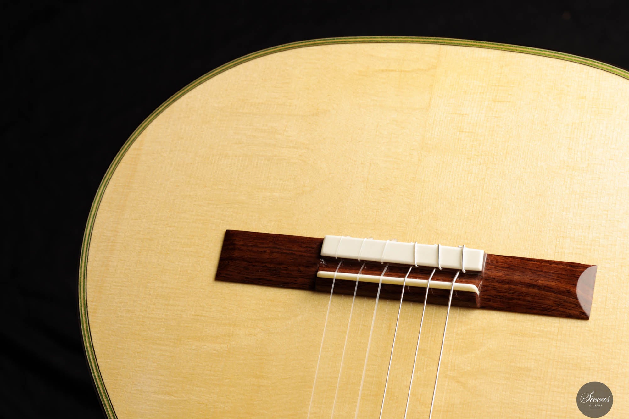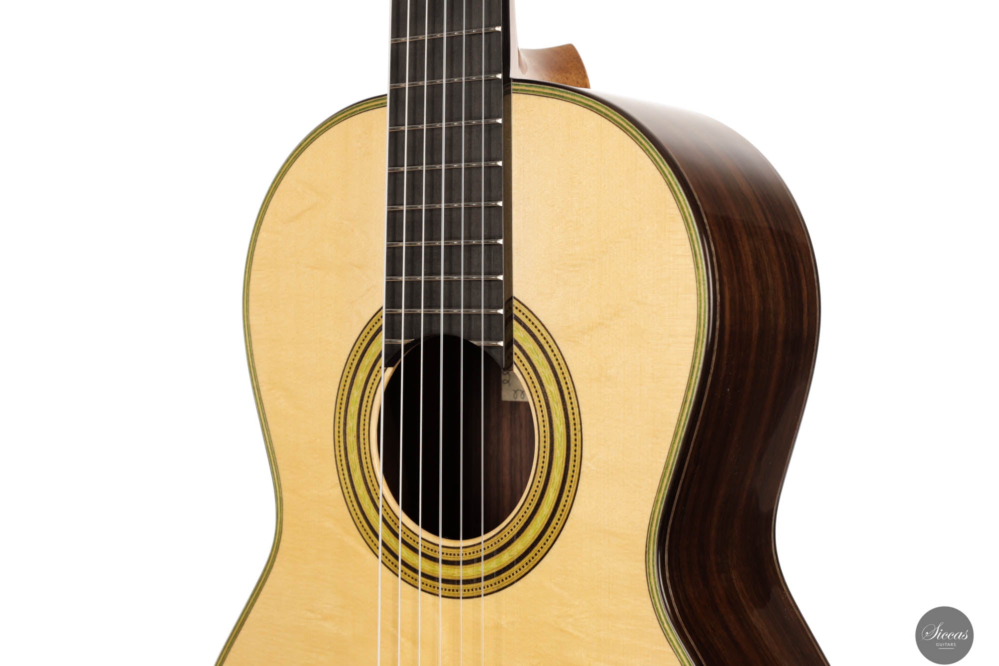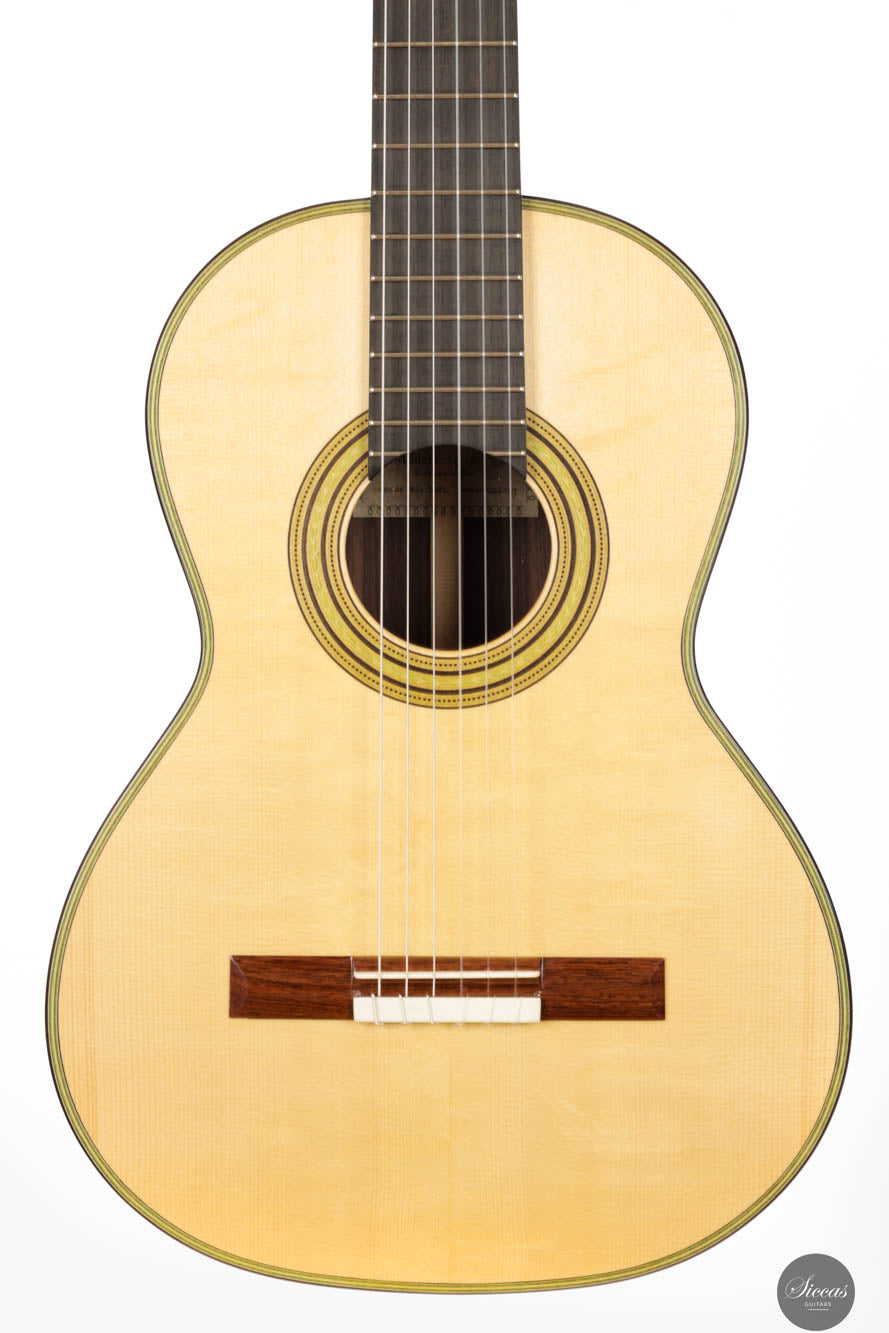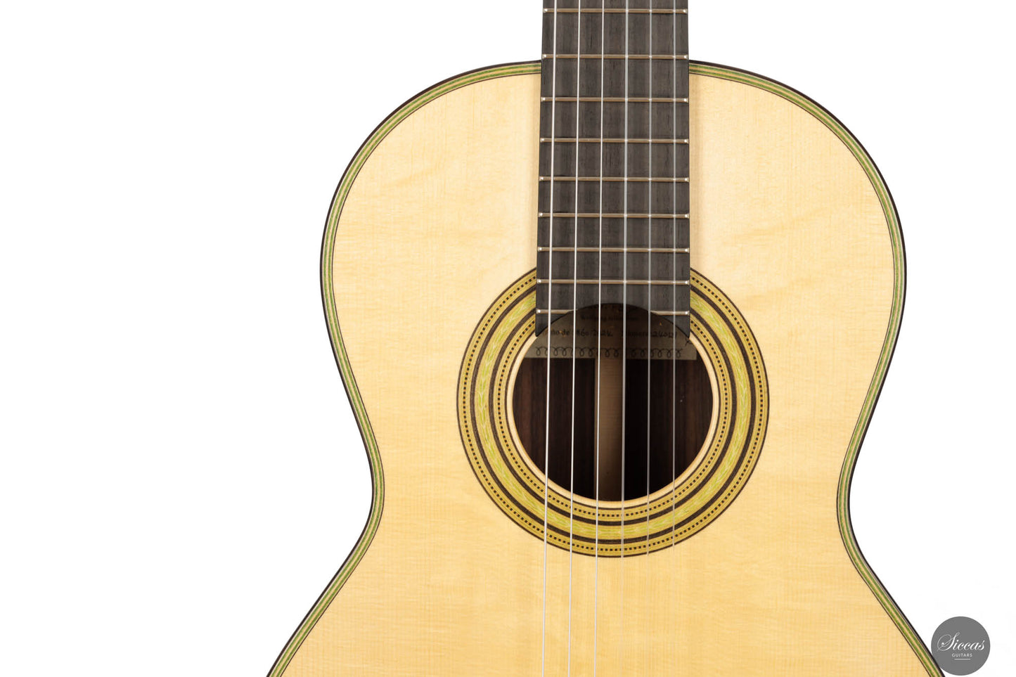 Wolfgang Jellinghaus’ meticulous study and admiration for Antonio de Torres' work have culminated in the creation of a series of high-quality yet affordable guitars, each echoing the essence of original Torres instruments from various periods. This particular model draws inspiration from an early Torres guitar, built in 1860 and cataloged as FE 13 by Jose Romanillos. The historical significance of the original instrument is profound, having passed through the hands of Miguel Llobet before being sold to Hermann Hauser I, who regarded it as a pivotal influence on his mature style. Jellinghaus' commitment to authenticity is evident in every aspect of the guitar, from the painstaking reproduction of the original's "lime green" purfling on the top, back, and rosette, to the custom-built period-style tuning machines. This dedication to detail ensures that the guitar not only embodies the spirit of the original Torres but also serves as a bridge connecting modern players to the rich heritage of classical guitar craftsmanship.