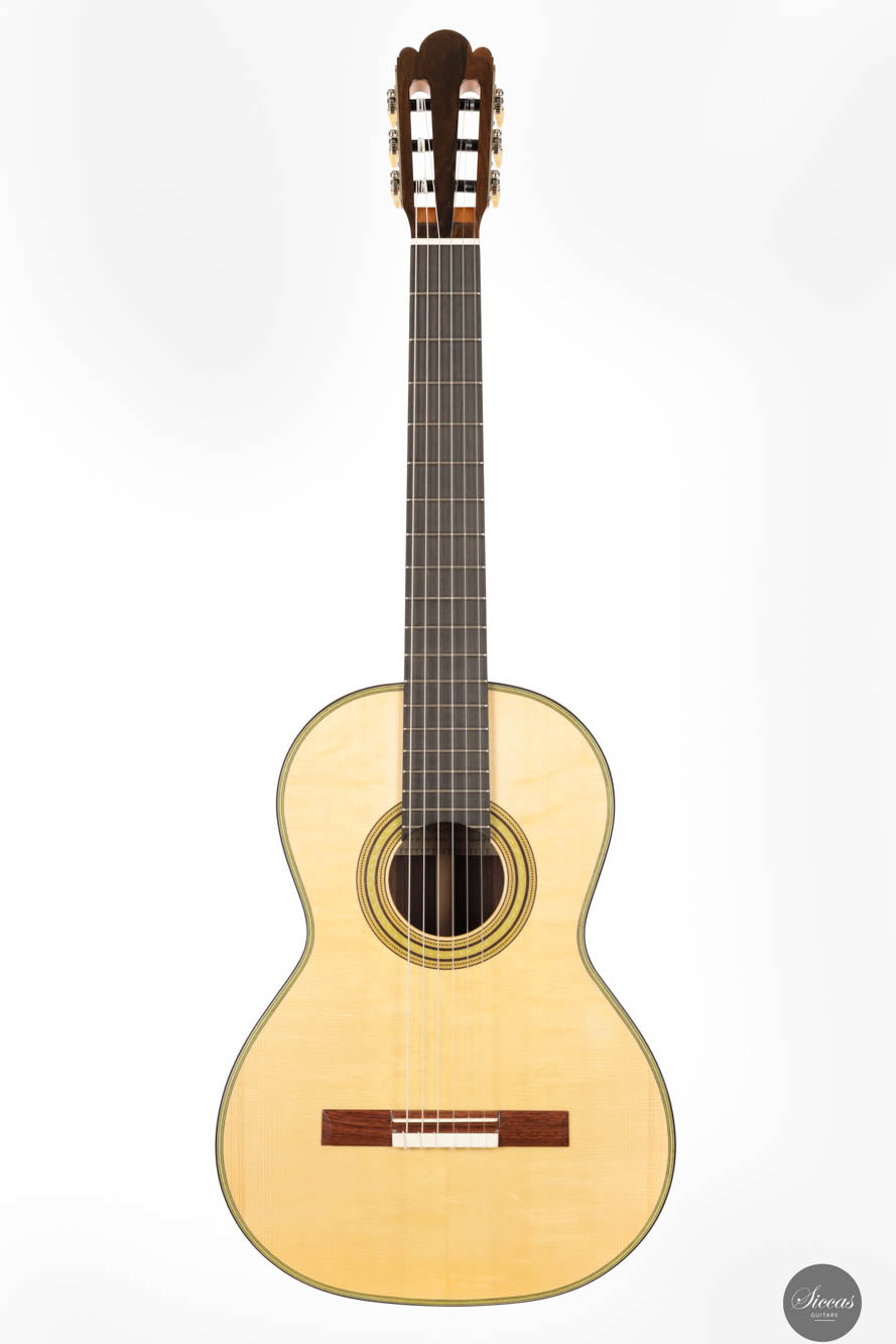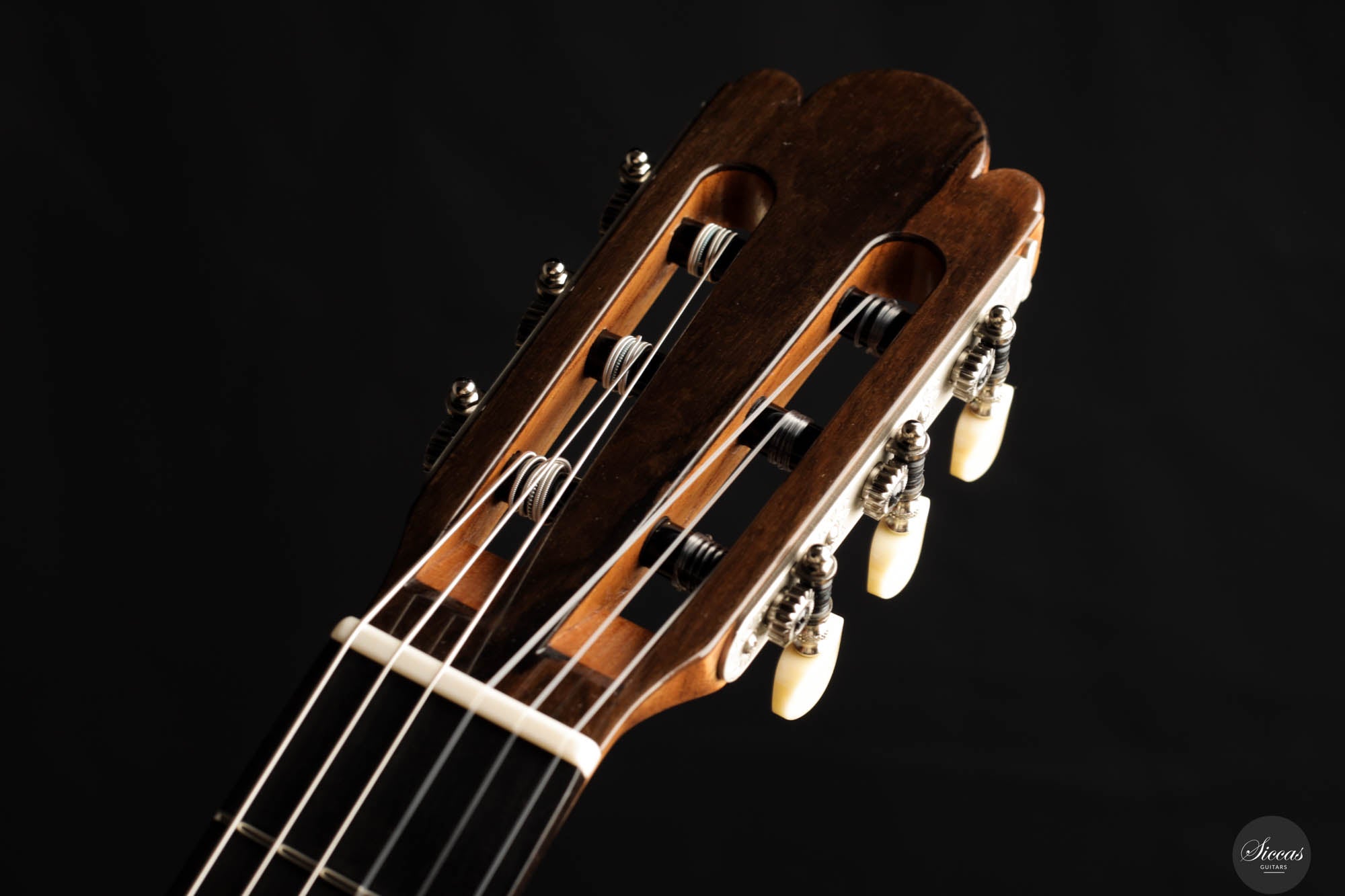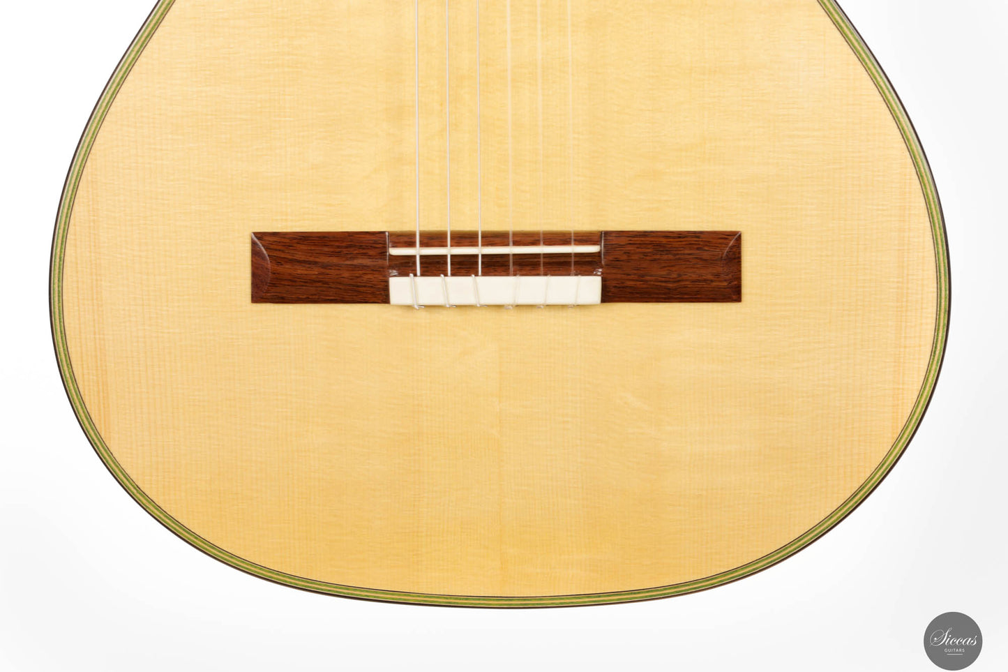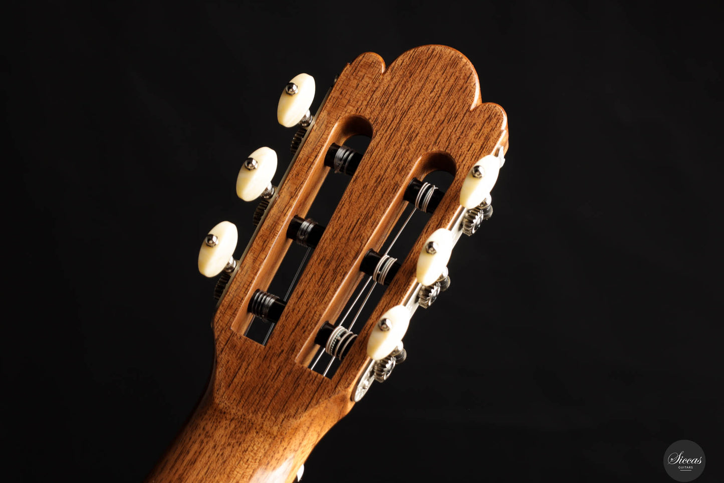 Wolfgang Jellinghaus’ meticulous study and admiration for Antonio de Torres' work have culminated in the creation of a series of high-quality yet affordable guitars, each echoing the essence of original Torres instruments from various periods. This particular model draws inspiration from an early Torres guitar, built in 1860 and cataloged as FE 13 by Jose Romanillos. The historical significance of the original instrument is profound, having passed through the hands of Miguel Llobet before being sold to Hermann Hauser I, who regarded it as a pivotal influence on his mature style. Jellinghaus' commitment to authenticity is evident in every aspect of the guitar, from the painstaking reproduction of the original's "lime green" purfling on the top, back, and rosette, to the custom-built period-style tuning machines. This dedication to detail ensures that the guitar not only embodies the spirit of the original Torres but also serves as a bridge connecting modern players to the rich heritage of classical guitar craftsmanship.