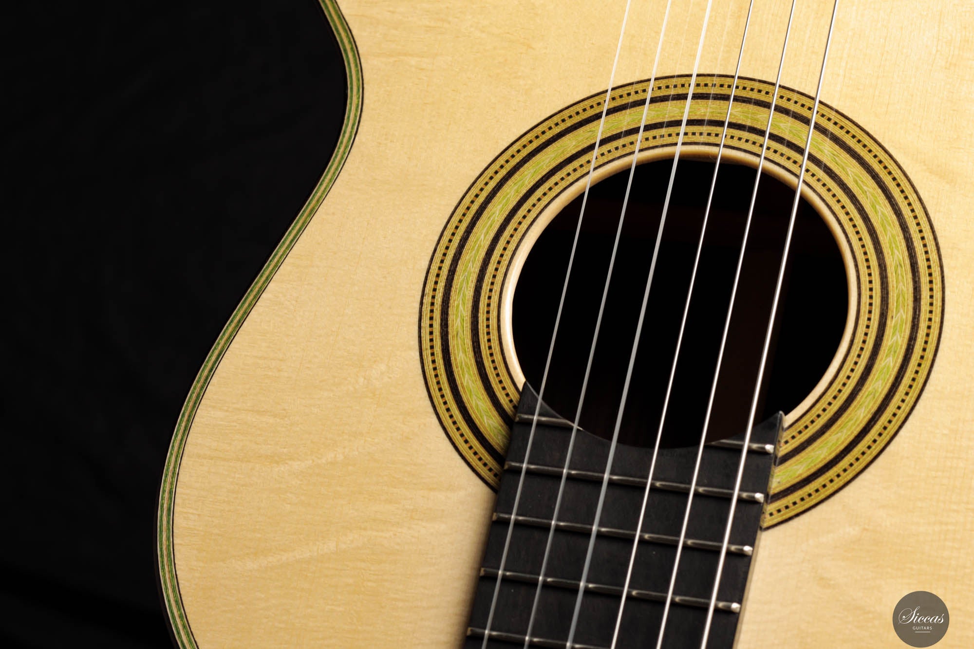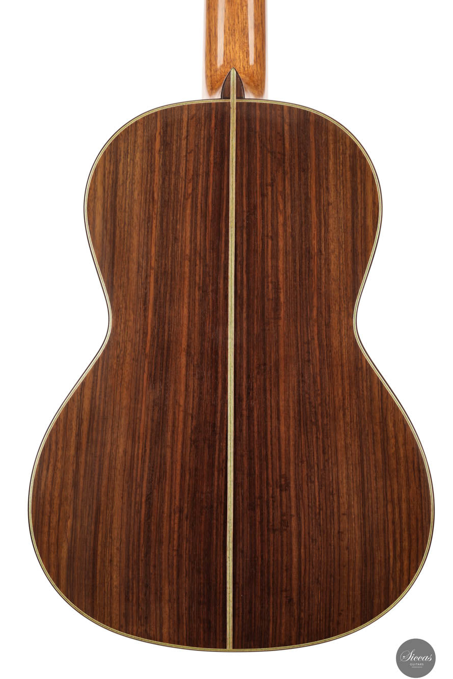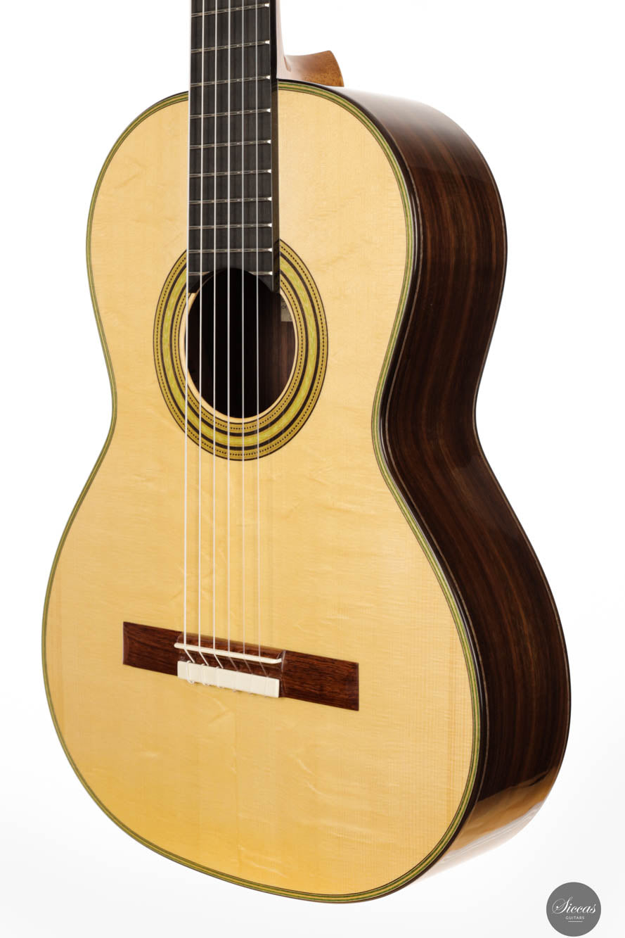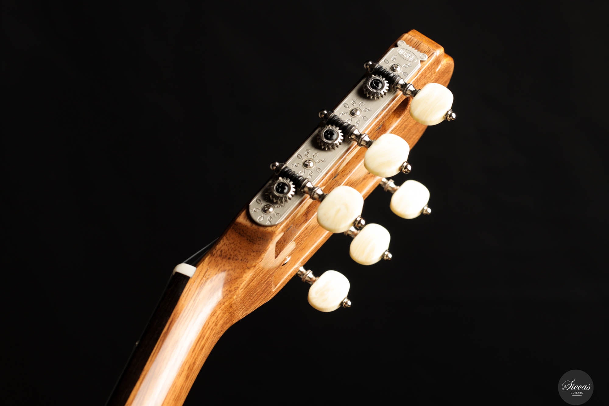 Wolfgang Jellinghaus’ meticulous study and admiration for Antonio de Torres' work have culminated in the creation of a series of high-quality yet affordable guitars, each echoing the essence of original Torres instruments from various periods. This particular model draws inspiration from an early Torres guitar, built in 1860 and cataloged as FE 13 by Jose Romanillos. The historical significance of the original instrument is profound, having passed through the hands of Miguel Llobet before being sold to Hermann Hauser I, who regarded it as a pivotal influence on his mature style. Jellinghaus' commitment to authenticity is evident in every aspect of the guitar, from the painstaking reproduction of the original's "lime green" purfling on the top, back, and rosette, to the custom-built period-style tuning machines. This dedication to detail ensures that the guitar not only embodies the spirit of the original Torres but also serves as a bridge connecting modern players to the rich heritage of classical guitar craftsmanship.