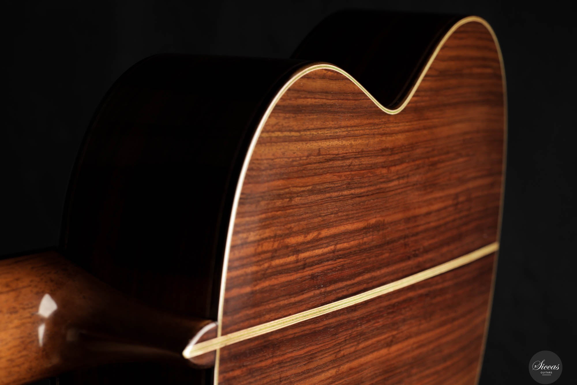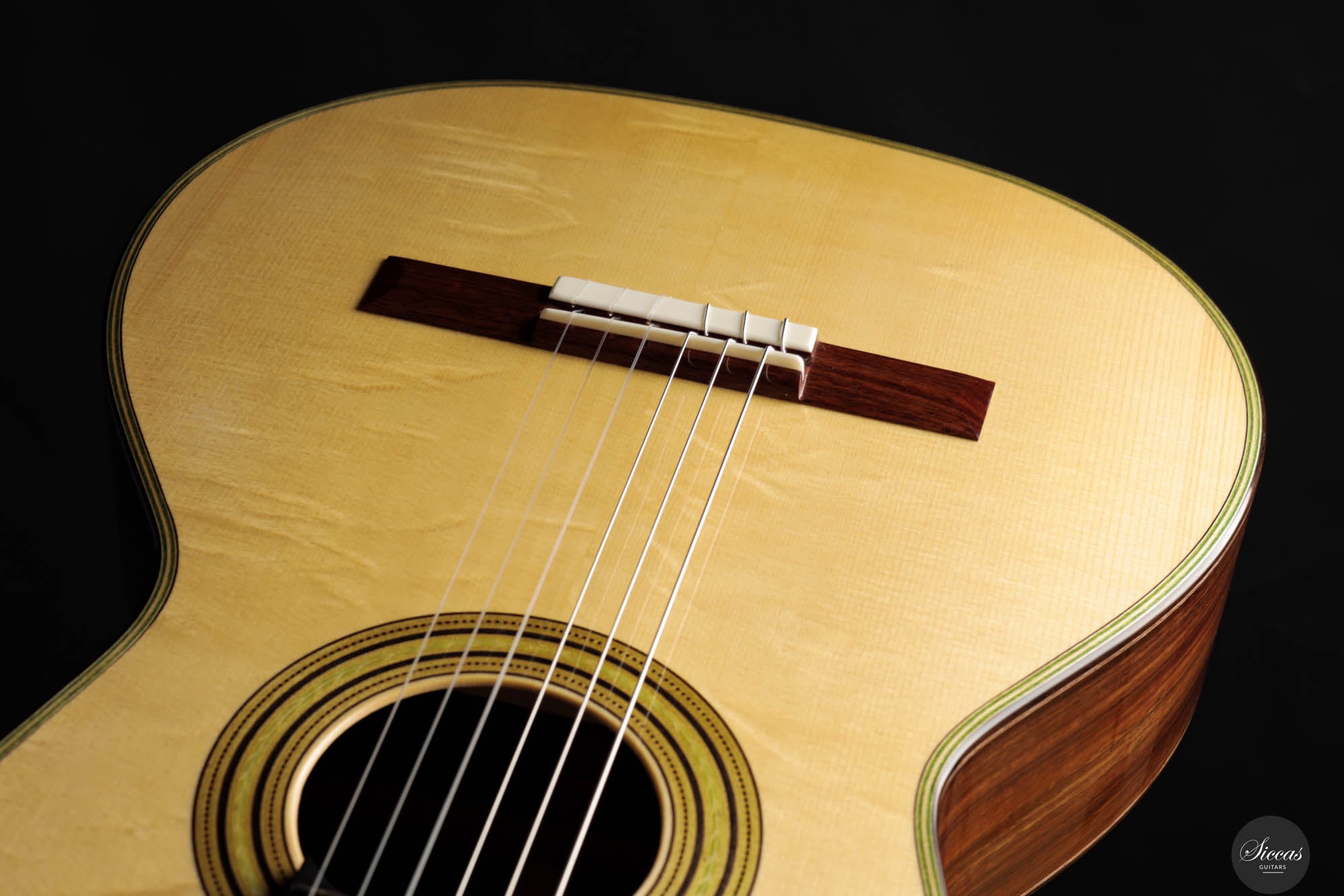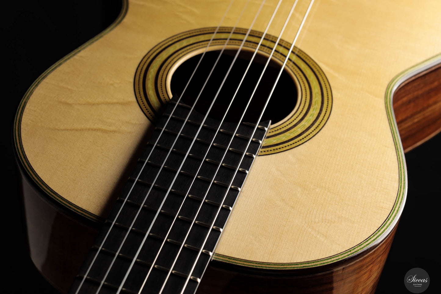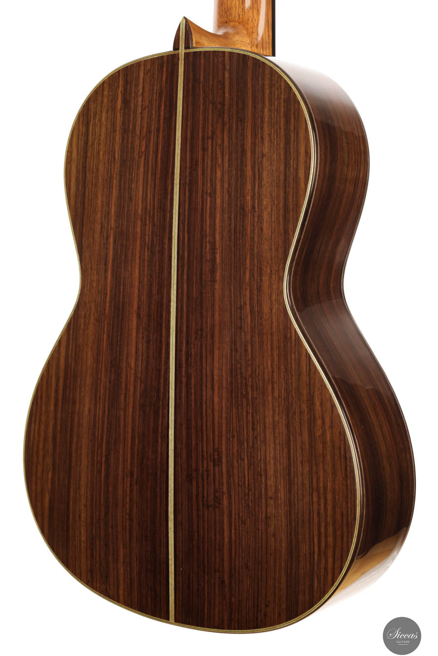 Wolfgang Jellinghaus’ meticulous study and admiration for Antonio de Torres' work have culminated in the creation of a series of high-quality yet affordable guitars, each echoing the essence of original Torres instruments from various periods. This particular model draws inspiration from an early Torres guitar, built in 1860 and cataloged as FE 13 by Jose Romanillos. The historical significance of the original instrument is profound, having passed through the hands of Miguel Llobet before being sold to Hermann Hauser I, who regarded it as a pivotal influence on his mature style. Jellinghaus' commitment to authenticity is evident in every aspect of the guitar, from the painstaking reproduction of the original's "lime green" purfling on the top, back, and rosette, to the custom-built period-style tuning machines. This dedication to detail ensures that the guitar not only embodies the spirit of the original Torres but also serves as a bridge connecting modern players to the rich heritage of classical guitar craftsmanship.