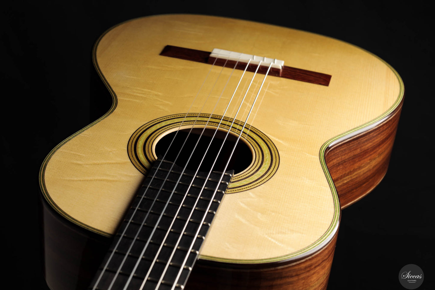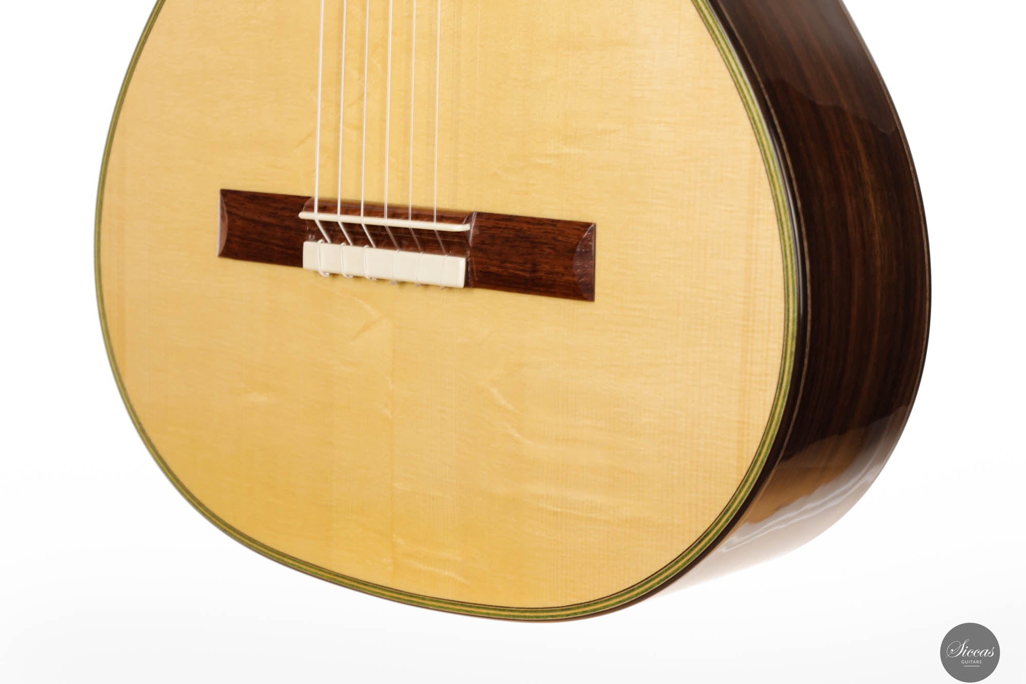 Despite its smaller size and lightweight construction, this guitar defies expectations with its powerful and full-bodied sound. The instrument’s capability to produce fat basses and lyrical trebles, rich in overtones across the entire register, is truly remarkable. Its ease of playability, courtesy of the comfortable neck shape and quick response, makes it an ideal choice for both serious students and concert players looking for a high-caliber instrument without breaking the bank. These small-production, concert-level guitars are meticulously French-polished by hand, using select materials that enhance their visual and tonal beauty. The clear finish on this model gives it a pristine appearance, reminiscent of how the original Torres would have looked in 1860, adding to its overall charm. Wolfgang Jellinghaus' replica stands as a testament to the enduring legacy of Antonio de Torres, offering exceptional value for those seeking to experience the historic sound and feel of a legendary guitar maker’s work.