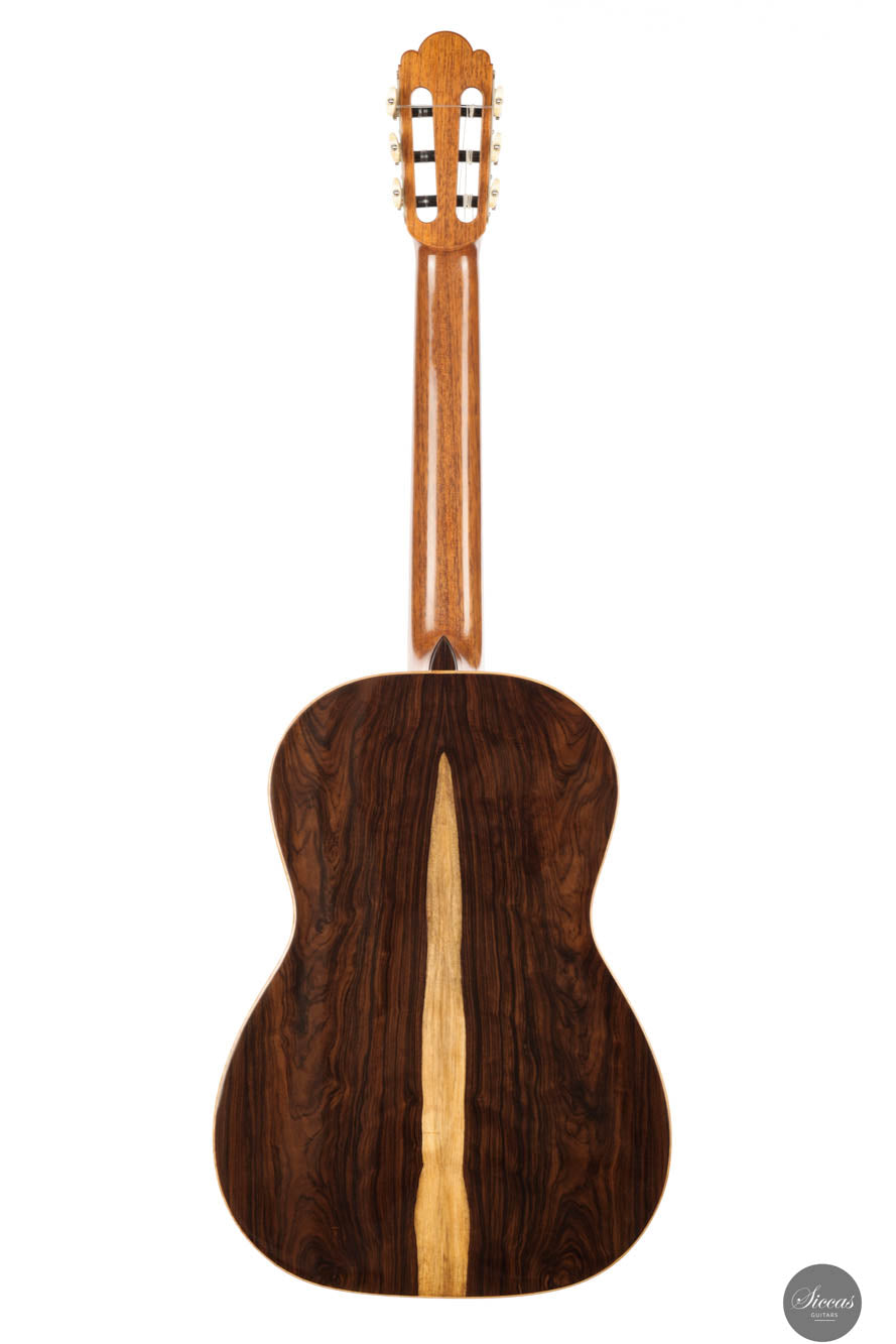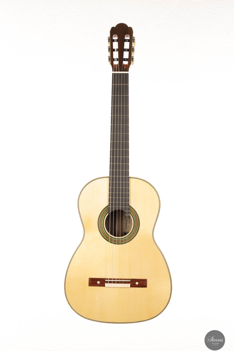 Drawing inspiration from the masterworks of Vicente Arias, Wolfgang Jellinghaus presents a guitar that seamlessly blends heritage with contemporary craftsmanship. In this exquisite model, the rich legacy of Spanish lutherie comes alive, reminiscent of the golden era of guitar-making, when artisans like Arias left their indelible mark on the world of music. The guitar boasts a spruce top, carefully selected for its tonal clarity and resonance. This choice reflects Jellinghaus’ meticulous attention to sourcing the finest materials, ensuring that each strum releases notes rich in warmth, depth, and vibrancy. The spruce top not only amplifies the sound but also matures with age, promising a tone that will only grow richer as the years pass. Complementing the spruce top, the Granadillo back and sides are classic combination that enhance the versatility of the instrument, similar to Indian Rosewood. This choice of wood not only contributes to the guitar’s versatility feel but also accentuates its sharp, bright tones and quick response, characteristics often sought after in flamenco music. Every detail of this Wolfgang Jellinghaus guitar echoes the precision and artistry that Vicente Arias was celebrated for. The craftsmanship, from the guitar’s intricate rosette to its refined neck profile, is a testament to Jellinghaus’ dedication to preserving the essence of historical guitar-making while infusing it with modern innovations. In essence, this guitar is not just an instrument but a celebration of lutherie’s grand traditions. It invites both the player and the listener on a journey back in time, to the workshops of great maestros like Vicente Arias, while ensuring a playing experience that meets the demands of today’s discerning musicians. With this creation, Wolfgang Jellinghaus pays a fitting tribute to the past while crafting a legacy for the future. The photographs of this guitar are general product images that may differ from the actual instrument.