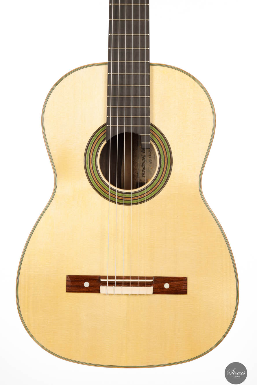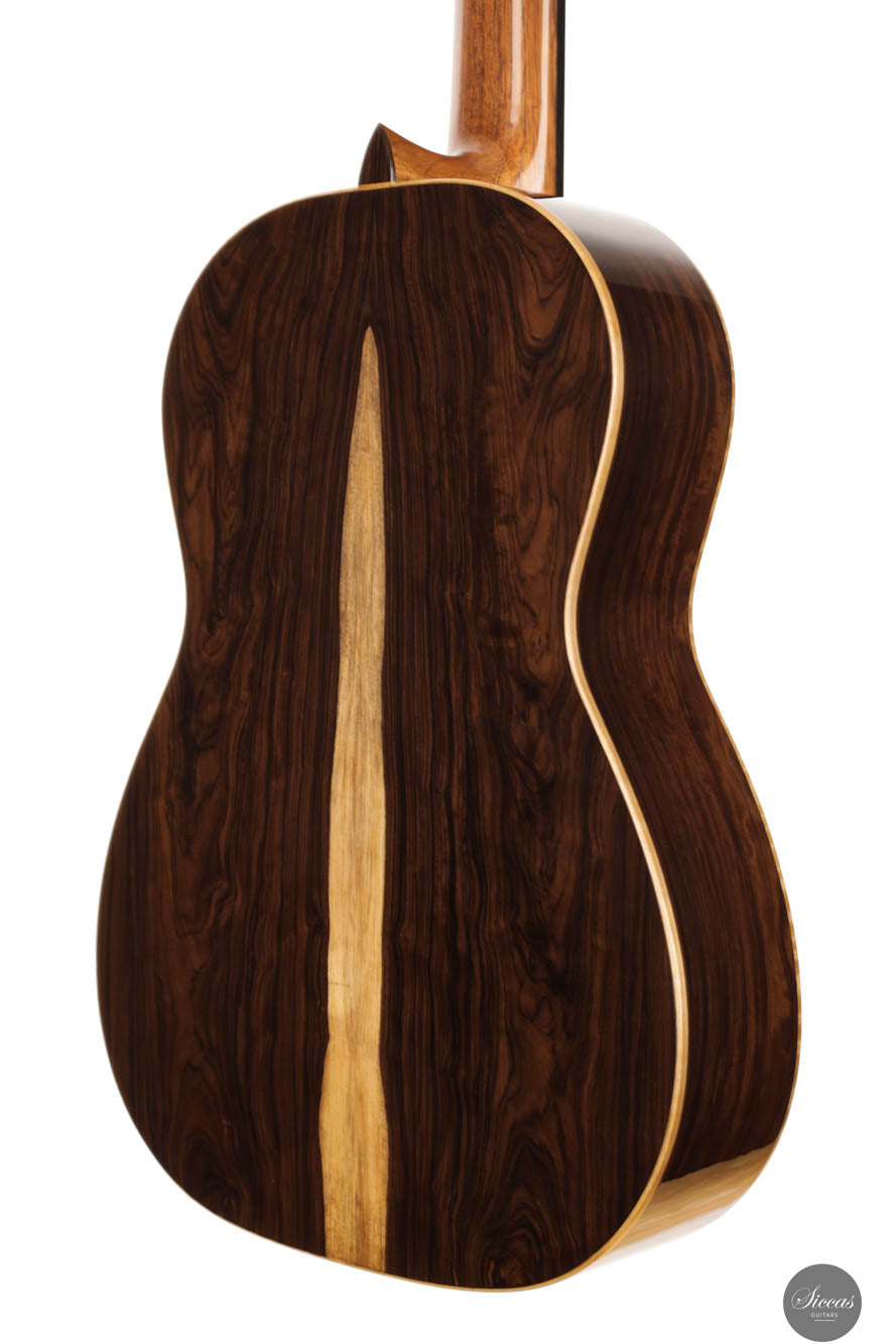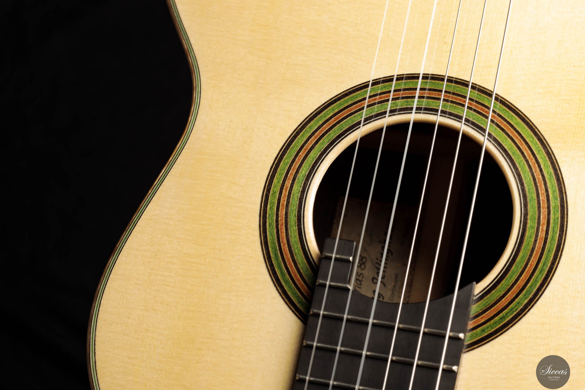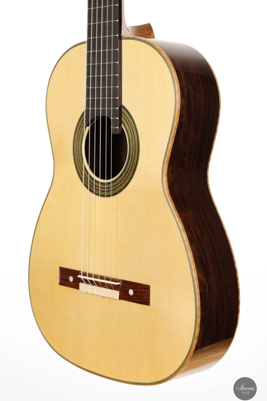 Drawing inspiration from the masterworks of Vicente Arias, Wolfgang Jellinghaus presents a guitar that seamlessly blends heritage with contemporary craftsmanship. In this exquisite model, the rich legacy of Spanish lutherie comes alive, reminiscent of the golden era of guitar-making, when artisans like Arias left their indelible mark on the world of music. The guitar boasts a spruce top, carefully selected for its tonal clarity and resonance. This choice reflects Jellinghaus’ meticulous attention to sourcing the finest materials, ensuring that each strum releases notes rich in warmth, depth, and vibrancy. The spruce top not only amplifies the sound but also matures with age, promising a tone that will only grow richer as the years pass. Complementing the spruce top, the Granadillo back and sides are classic combination that enhance the versatility of the instrument, similar to Indian Rosewood. This choice of wood not only contributes to the guitar’s versatility feel but also accentuates its sharp, bright tones and quick response, characteristics often sought after in flamenco music. Every detail of this Wolfgang Jellinghaus guitar echoes the precision and artistry that Vicente Arias was celebrated for. The craftsmanship, from the guitar’s intricate rosette to its refined neck profile, is a testament to Jellinghaus’ dedication to preserving the essence of historical guitar-making while infusing it with modern innovations. In essence, this guitar is not just an instrument but a celebration of lutherie’s grand traditions. It invites both the player and the listener on a journey back in time, to the workshops of great maestros like Vicente Arias, while ensuring a playing experience that meets the demands of today’s discerning musicians. With this creation, Wolfgang Jellinghaus pays a fitting tribute to the past while crafting a legacy for the future. The photographs of this guitar are general product images that may differ from the actual instrument.
