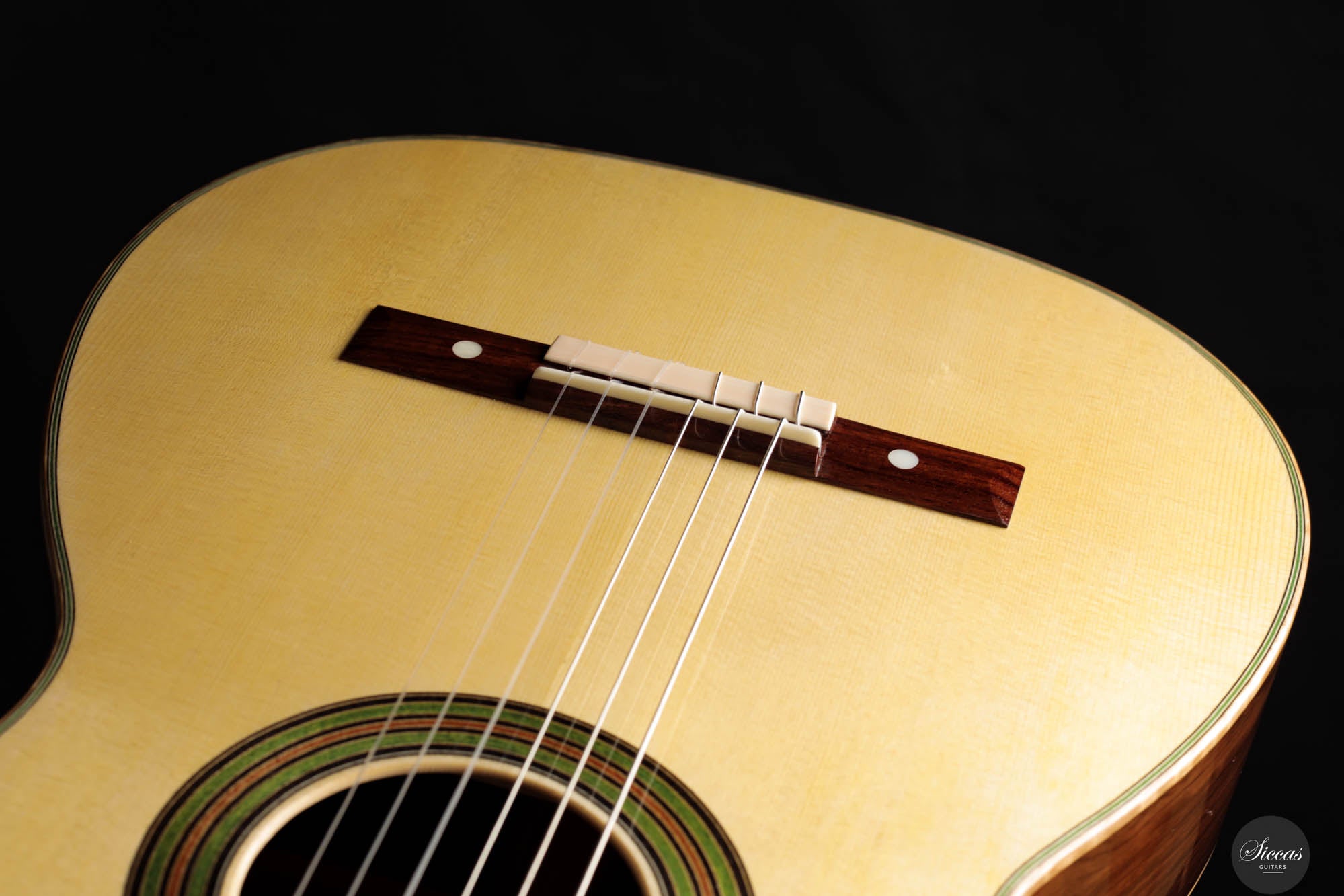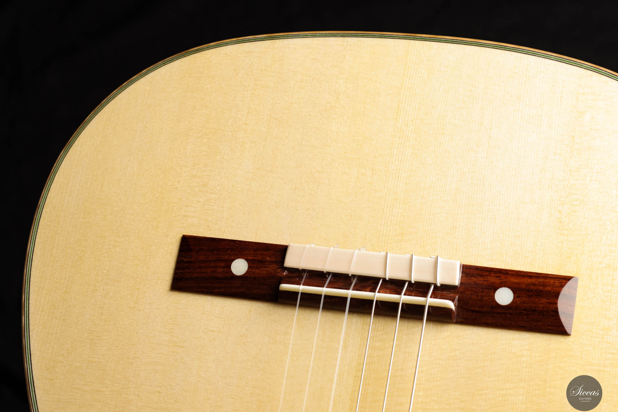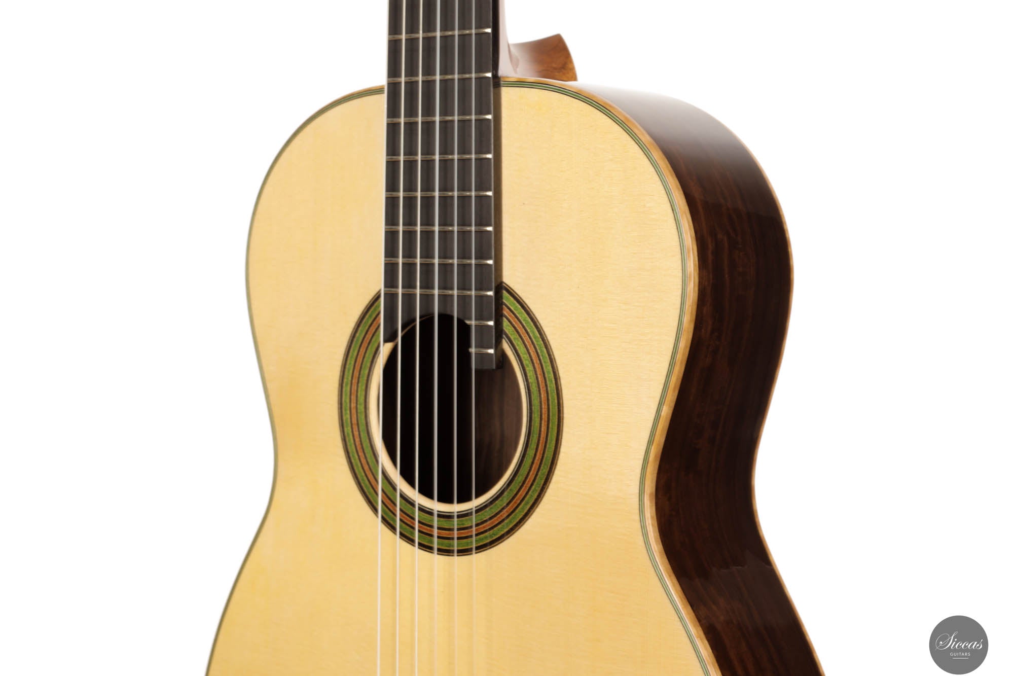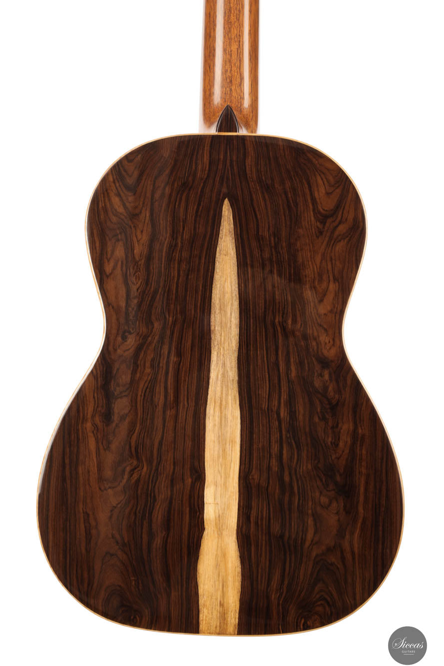 Drawing inspiration from the masterworks of Vicente Arias, Wolfgang Jellinghaus presents a guitar that seamlessly blends heritage with contemporary craftsmanship. In this exquisite model, the rich legacy of Spanish lutherie comes alive, reminiscent of the golden era of guitar-making, when artisans like Arias left their indelible mark on the world of music. The guitar boasts a spruce top, carefully selected for its tonal clarity and resonance. This choice reflects Jellinghaus’ meticulous attention to sourcing the finest materials, ensuring that each strum releases notes rich in warmth, depth, and vibrancy. The spruce top not only amplifies the sound but also matures with age, promising a tone that will only grow richer as the years pass. Complementing the spruce top, the Granadillo back and sides are classic combination that enhance the versatility of the instrument, similar to Indian Rosewood. This choice of wood not only contributes to the guitar’s versatility feel but also accentuates its sharp, bright tones and quick response, characteristics often sought after in flamenco music. Every detail of this Wolfgang Jellinghaus guitar echoes the precision and artistry that Vicente Arias was celebrated for. The craftsmanship, from the guitar’s intricate rosette to its refined neck profile, is a testament to Jellinghaus’ dedication to preserving the essence of historical guitar-making while infusing it with modern innovations. In essence, this guitar is not just an instrument but a celebration of lutherie’s grand traditions. It invites both the player and the listener on a journey back in time, to the workshops of great maestros like Vicente Arias, while ensuring a playing experience that meets the demands of today’s discerning musicians. With this creation, Wolfgang Jellinghaus pays a fitting tribute to the past while crafting a legacy for the future. The photographs of this guitar are general product images that may differ from the actual instrument.