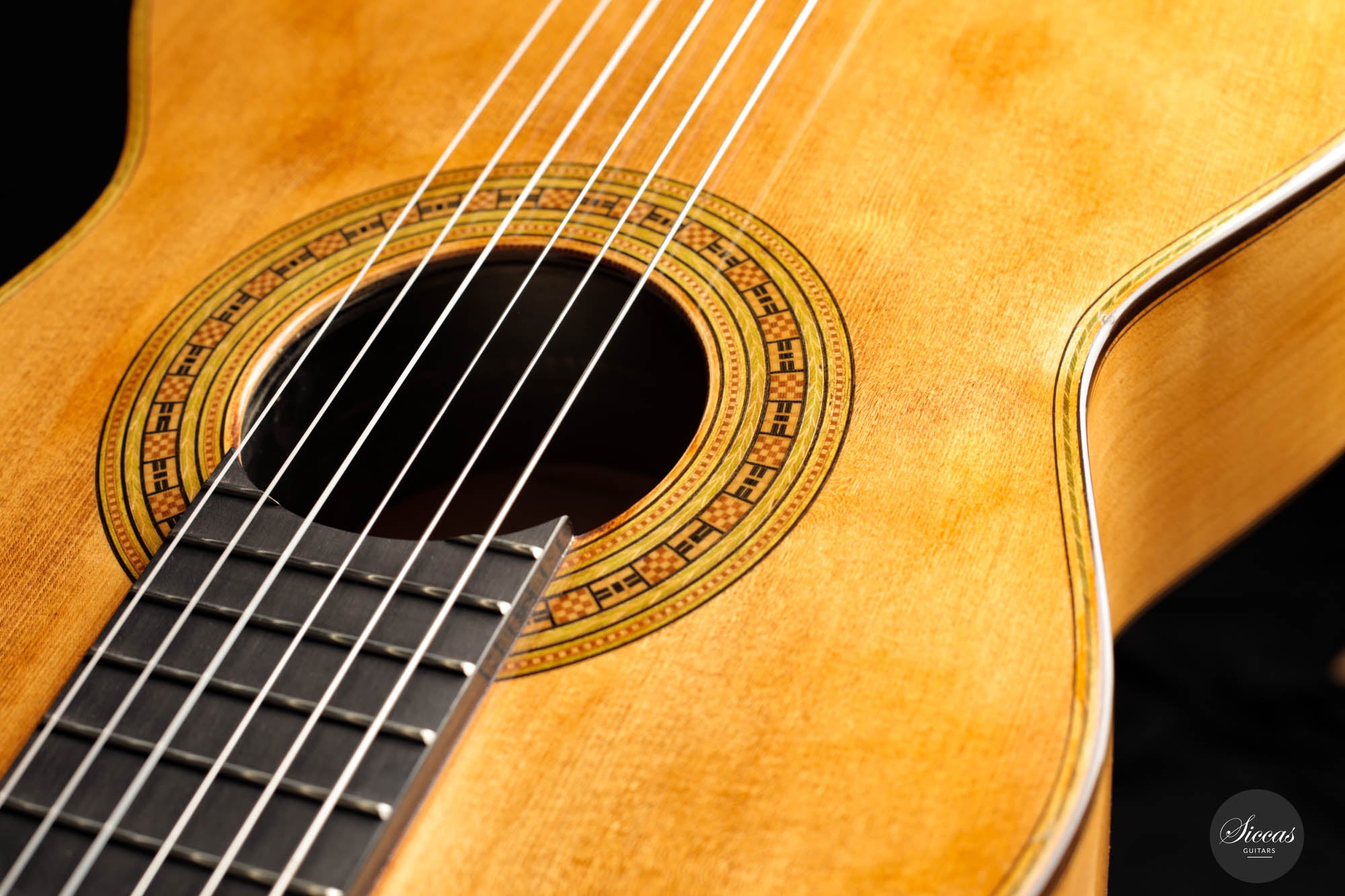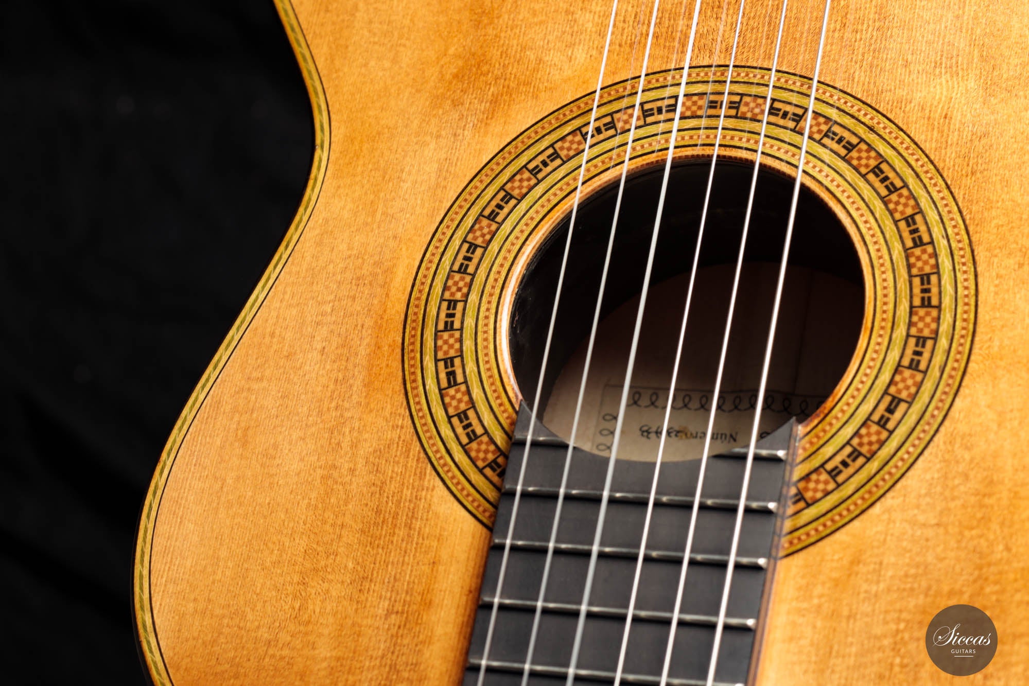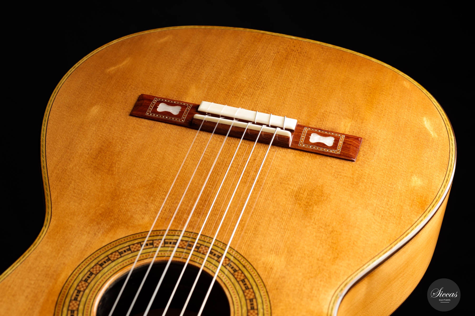 The impressive, artful embellishments, present both on the back and the top, attest to Torres' exceptional craftsmanship. Especially, the handmade inlays, showcasing the herringbone and ancient meander patterns, add an extra layer of elegance to the instrument.