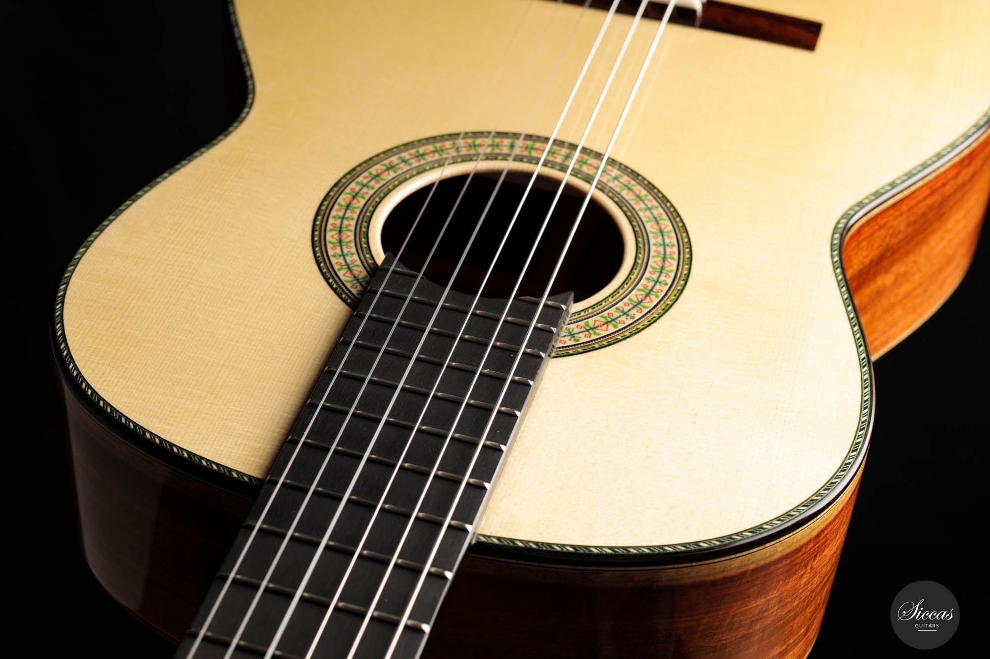 The guitar built by Wolfgang Jellinghaus is a stunning instrument modeled after the 1912 Manuel Ramirez guitar used by renowned classical guitarist Andres Segovia. Structurally, it is a replica of the original but with some modern touches. The soundboard is made from spruce, known for its rich, warm tone, and the back and sides are crafted from pau ferro, a wood known for its bright, clear sound. The French polished soundboard and lacquer back and sides add to the guitar's aesthetic appeal and contribute to its exceptional sound quality. Despite its cost-efficient price, this guitar has a powerful sound with warm tones and an array of beautiful colors. It is a truly remarkable instrument, crafted by a master guitar builder’s team with years of experience and passion for the craft.
