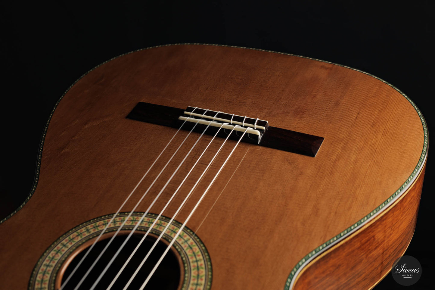 The guitar built by Wolfgang Jellinghaus is a stunning instrument, modeled after the 1912 Manuel Ramirez guitar used by renowned classical guitarist Andres Segovia. Structurally, it is an exact replica of the original, but with some modern touches. The soundboard is made from cedar, known for its rich, warm tone, and the back and sides are crafted from Granadillo, a wood known for its bright, clear sound. The French polished soundboard and lacquer back and sides not only add to the guitar's aesthetic appeal, but also contribute to its exceptional sound quality. Despite its cost-efficient price, this guitar has a powerful sound with warm tones and an array of beautiful colors. It is a truly remarkable instrument, crafted by a master guitar builder’s team with years of experience and passion for the craft.