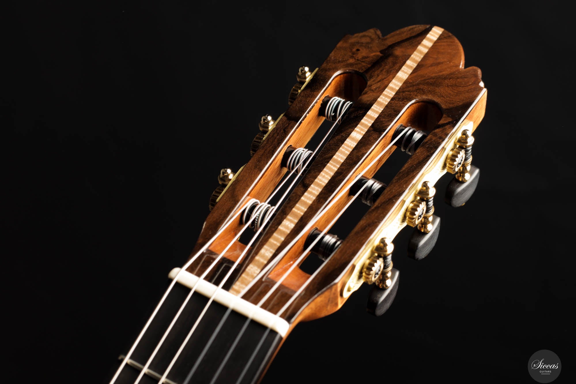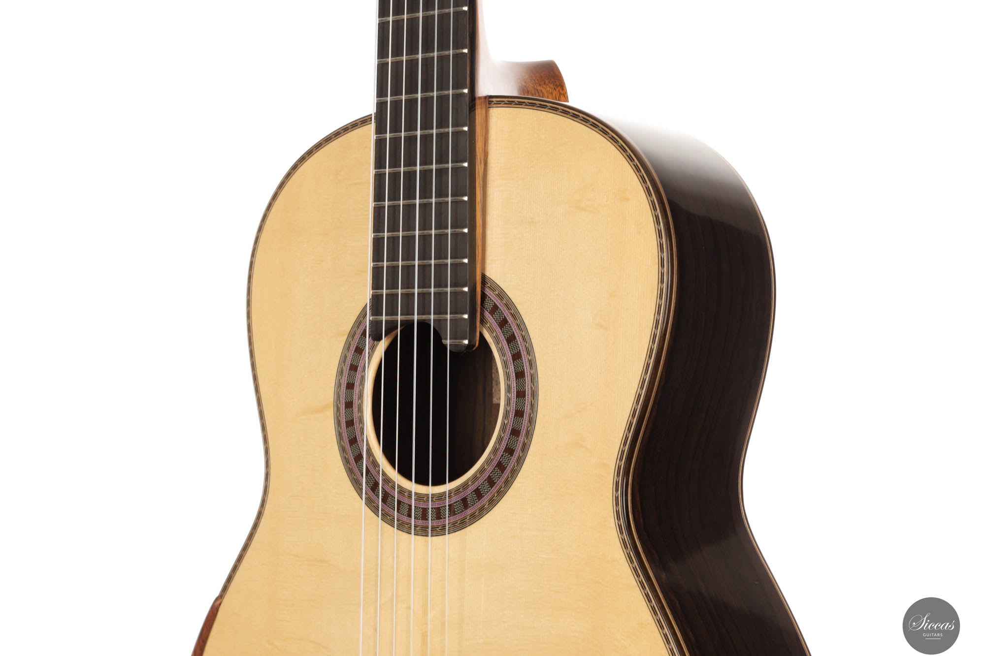 The Wolfgang Jellinghaus Signature series represents a modern approach to classical guitar design, incorporating innovative features like a floating fingerboard. This design allows the top under the fingerboard to vibrate freely, enhancing the overall sound quality. Coupled with a very light double-top construction, the guitar produces a powerful sound volume that fills the room effortlessly, making it exceptionally player-friendly for the right hand. Additionally, the inclusion of an armrest increases the overall comfort for the player, making extended sessions less taxing. Finished with shellac, the guitar not only sounds impressive but also presents a visually appealing aesthetic.