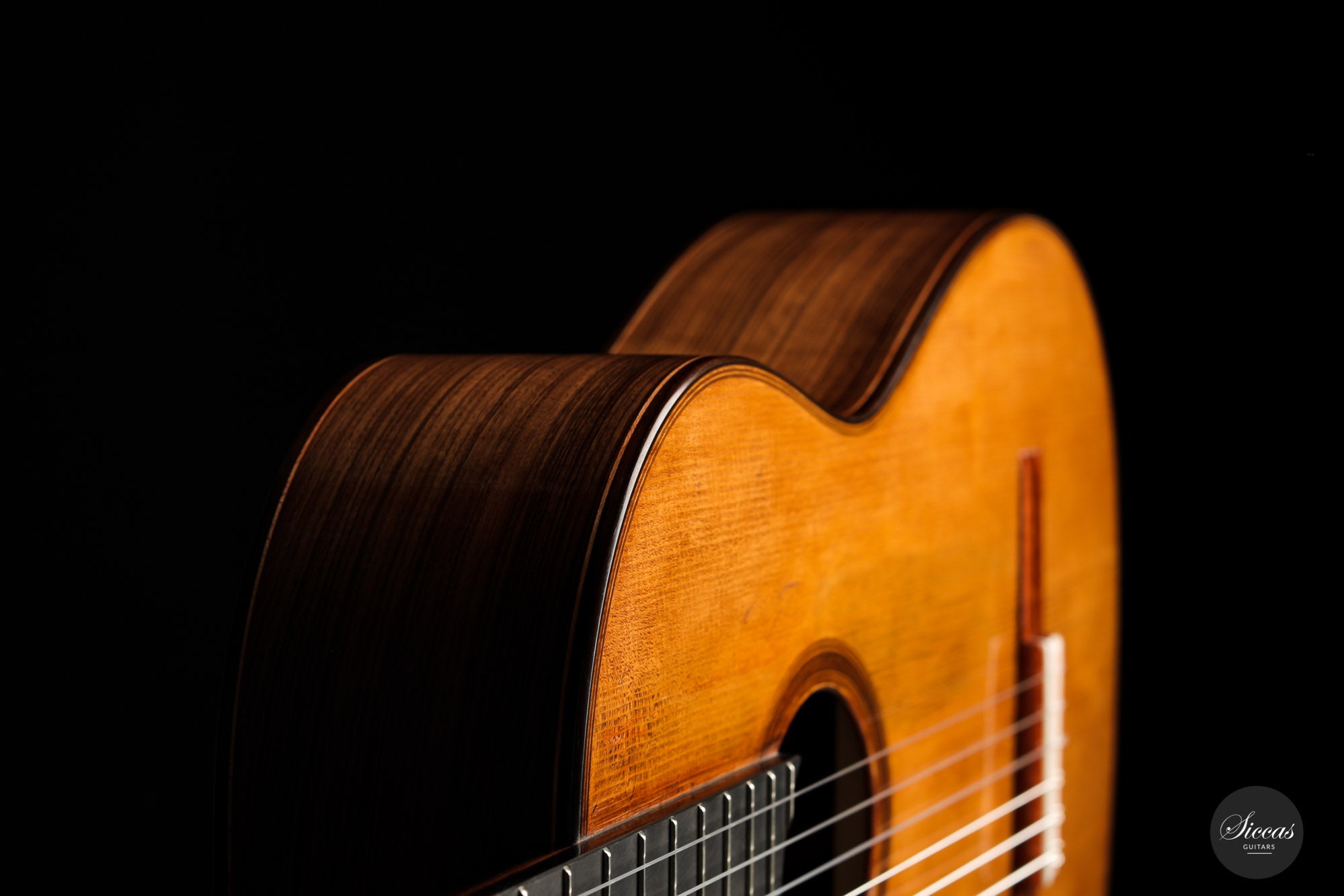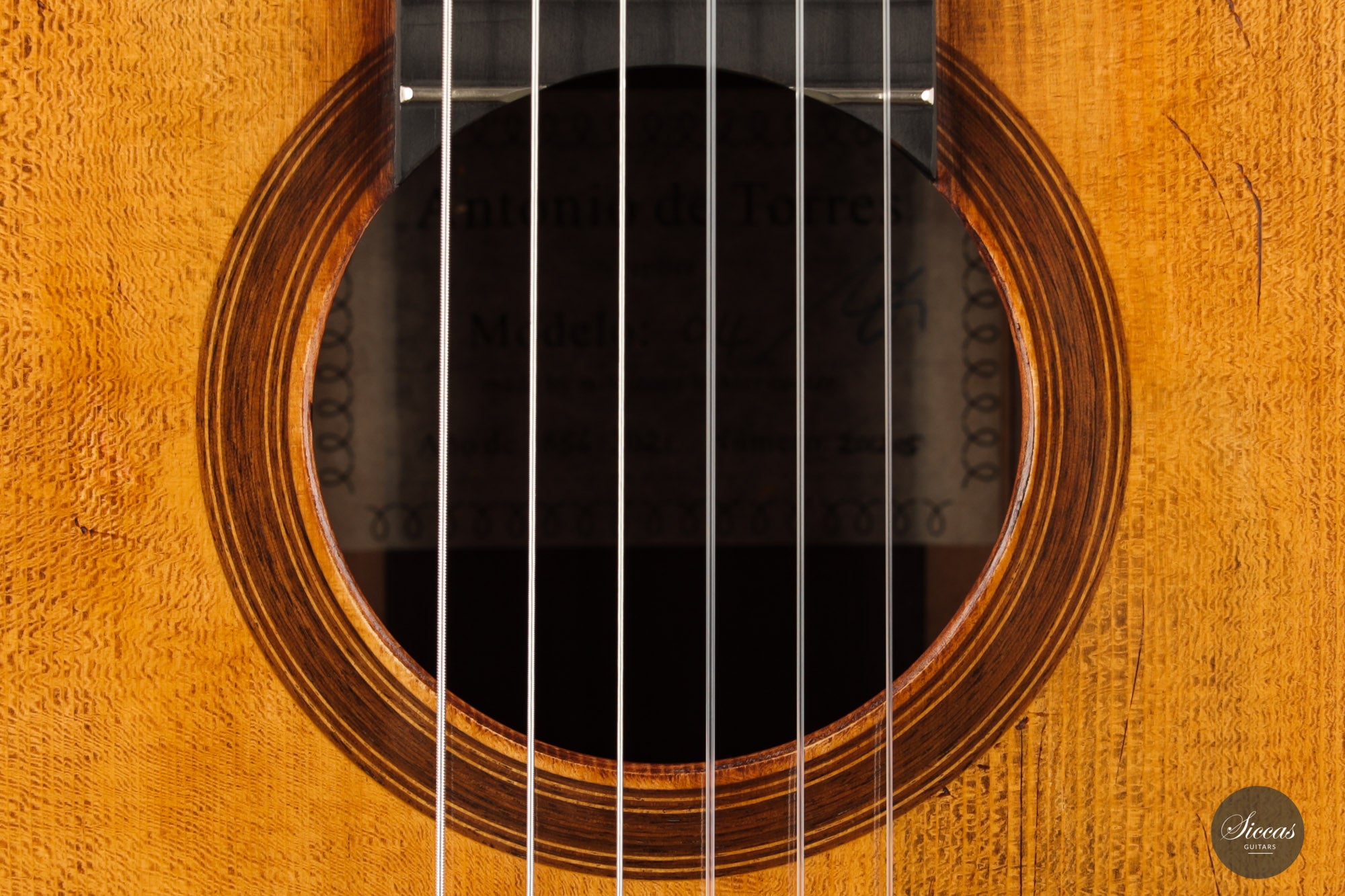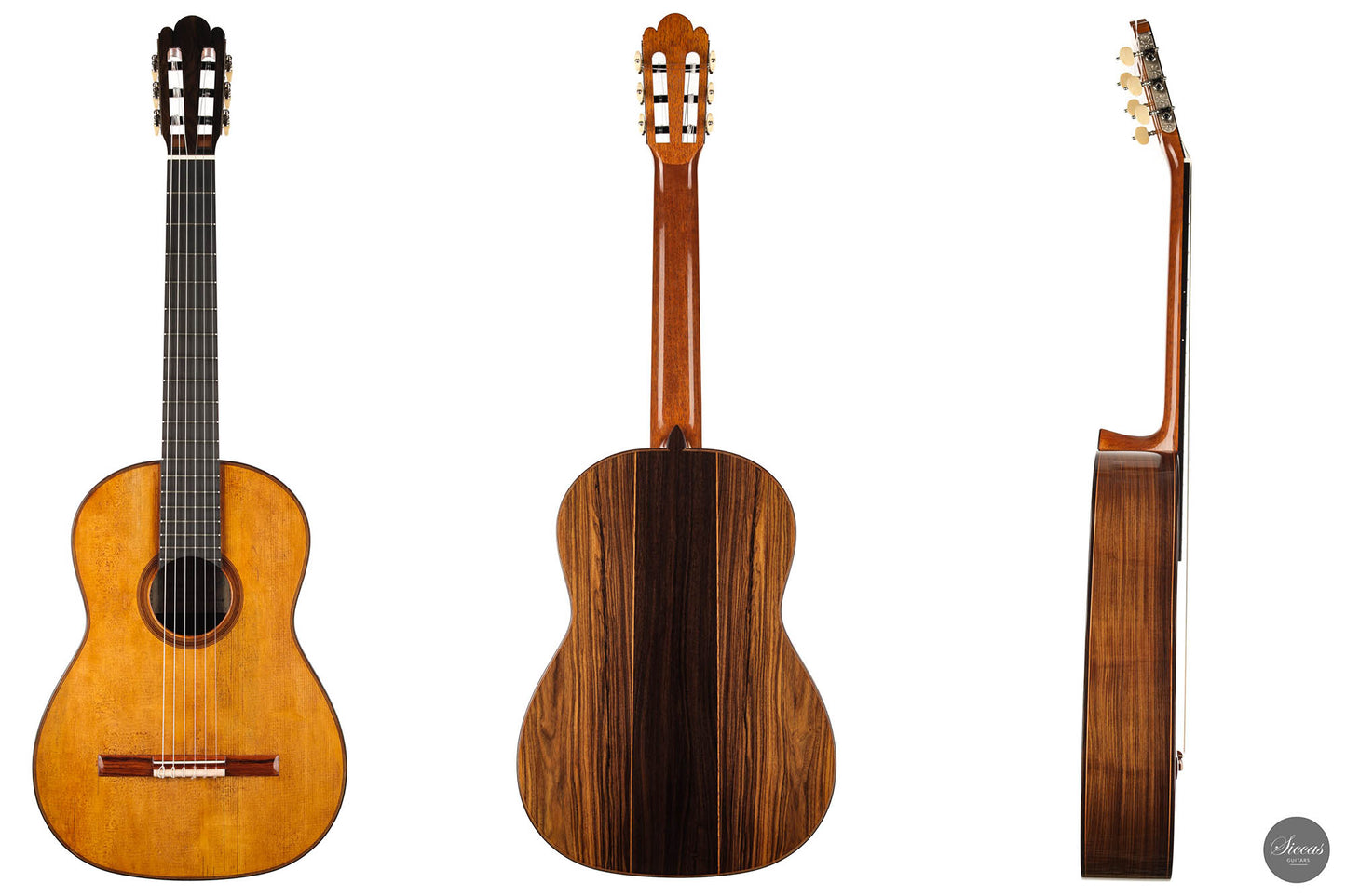 Lightweight, responsive, and visually captivating, this replica of the fourth guitar by Antonio de Torres is an absolute gem. This homage to one of Antonio de Torres’ most famous instruments, also known as “La Leona”, is phenomenal. One can actually feel the special charm coming from the warm tone and the singing ability of this beautiful guitar. The easy responsiveness of the instrument is a source of great pleasure, giving it a uniquely playful character and an inspiring expression.