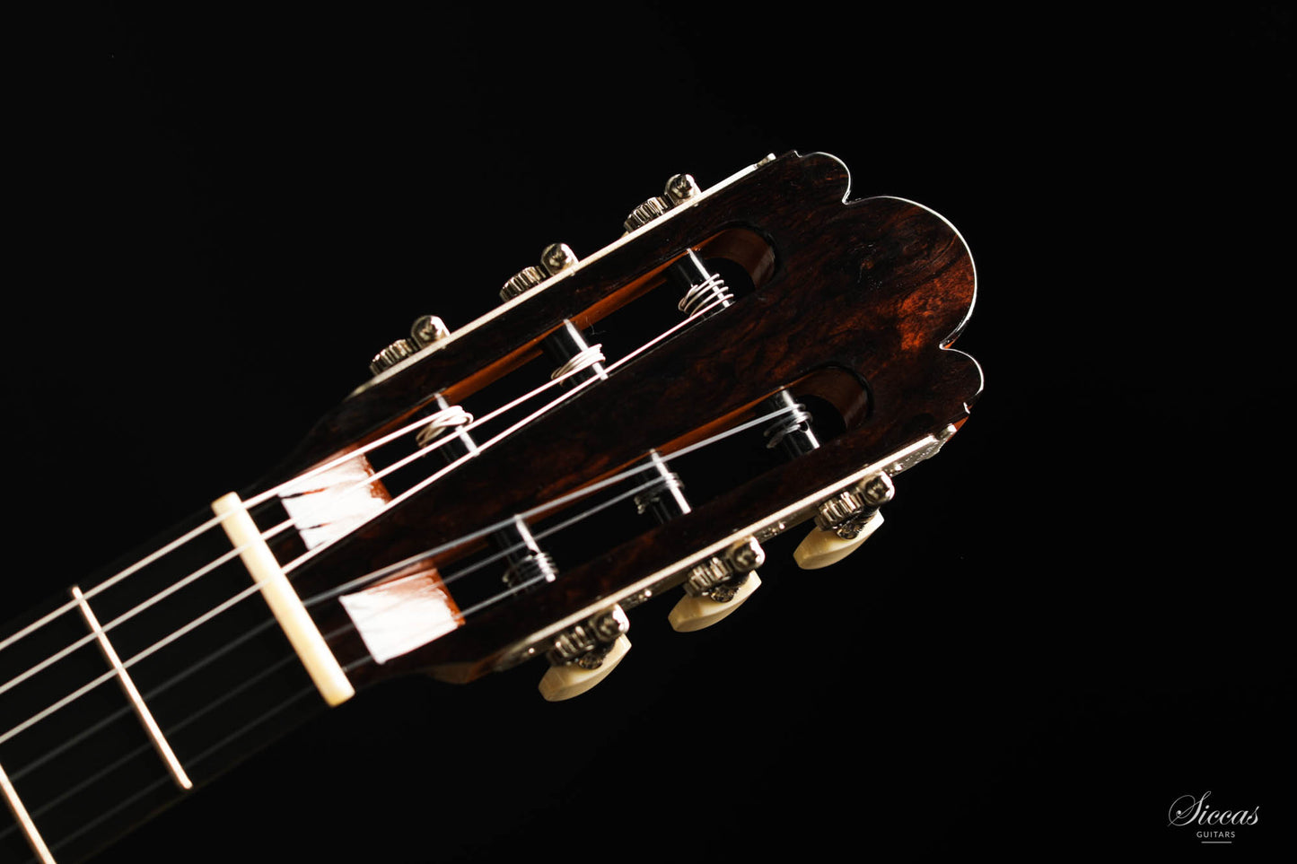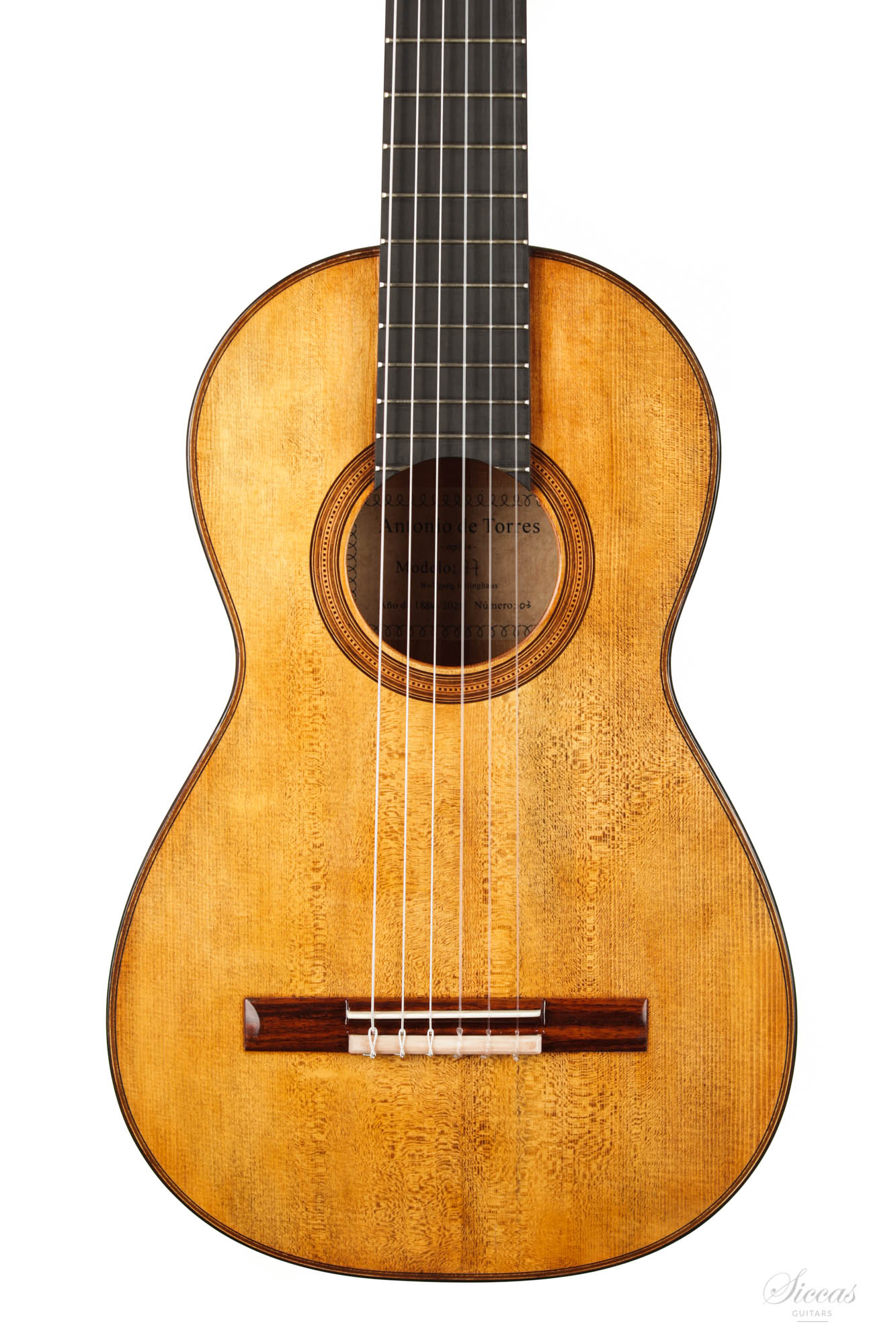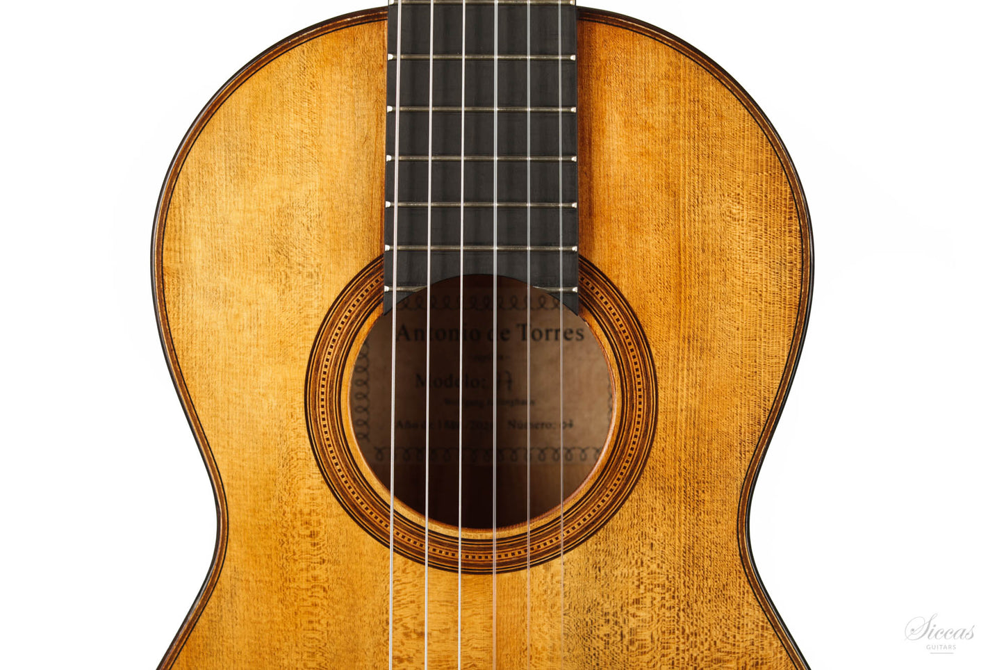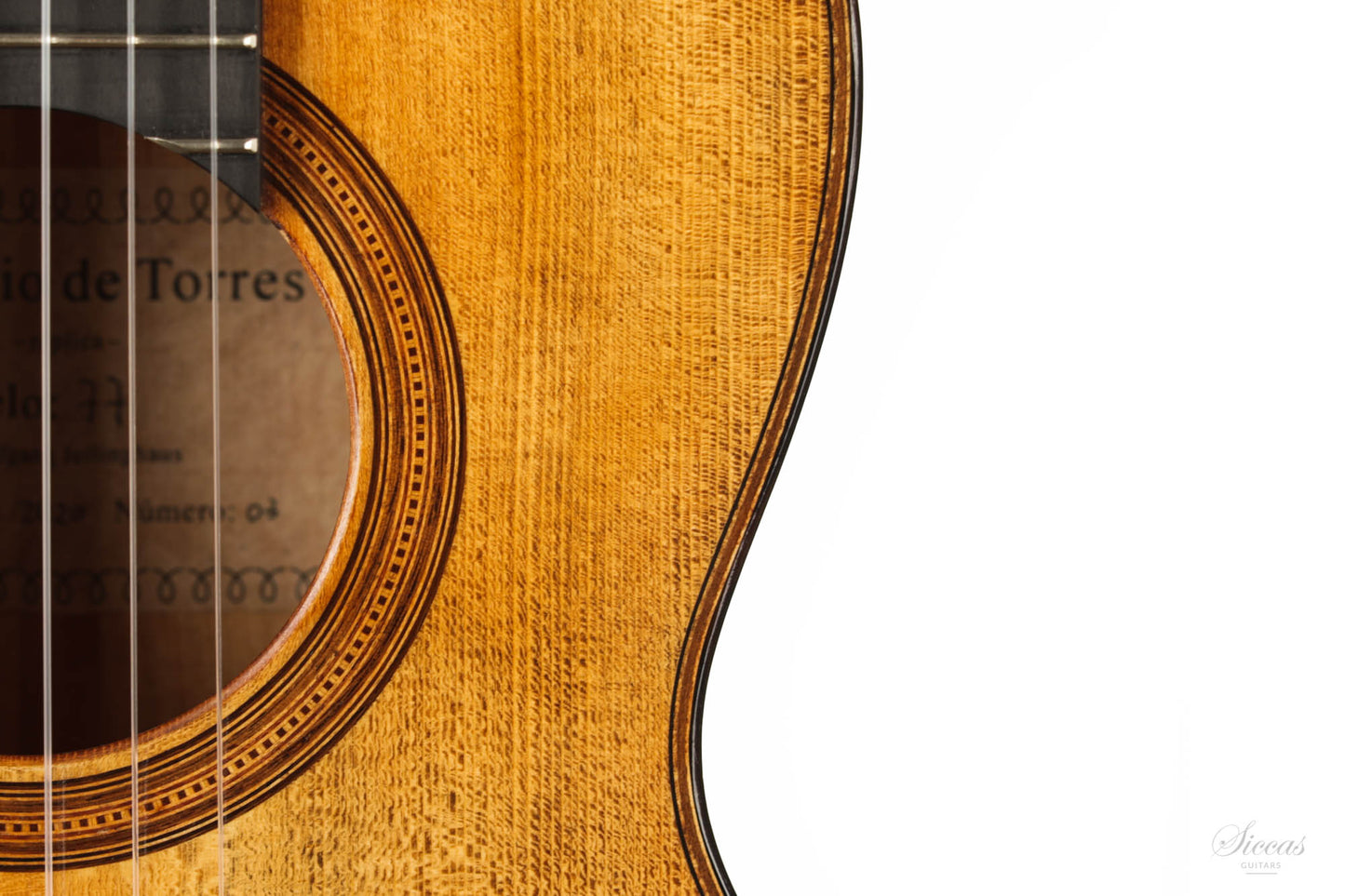 It is a real joy to play this guitar, what an exciting and inspiring instrument. When we took the guitar in our hands for the first time, we were all more than amazed about the full and appealing sound that emerges from a guitar with such a relatively small body. Crystal clear trebles with responsive basses produce a smooth, sweet sound with a reminiscence of historical instruments. Cypress back and sides paired with an aesthetically aged top make for a responsive instrument where the player can actually sense the feedback. This magnificent Torres model is equipped with modern machine heads instead of pegs, which makes it much easier to tune, but still fits into the overall picture