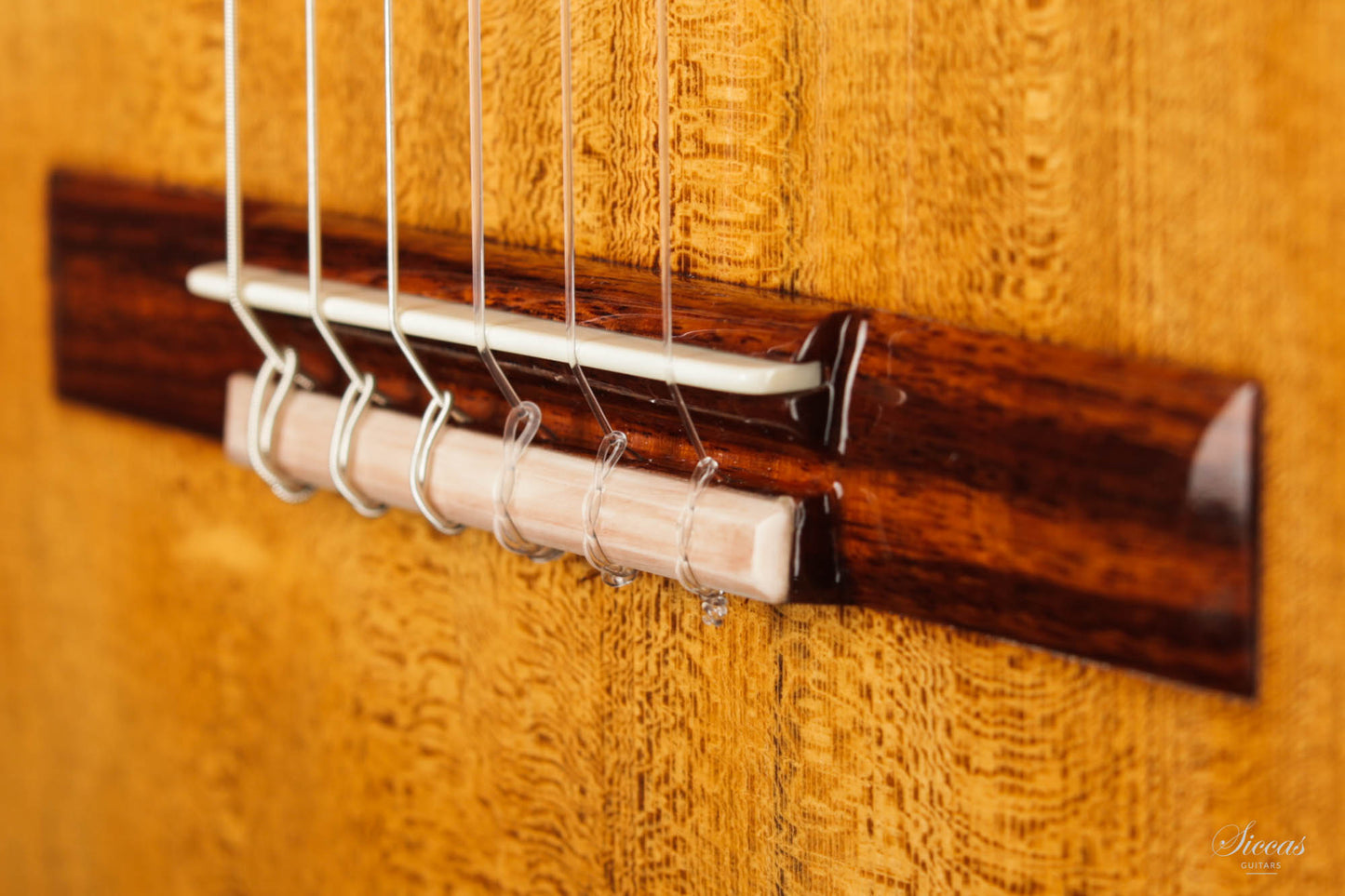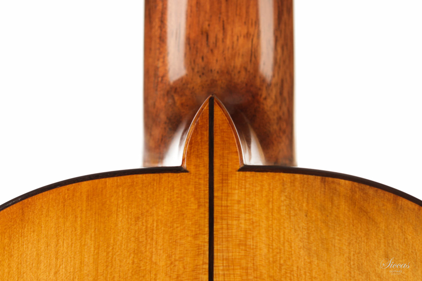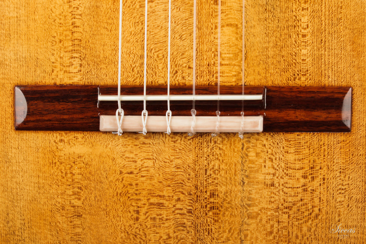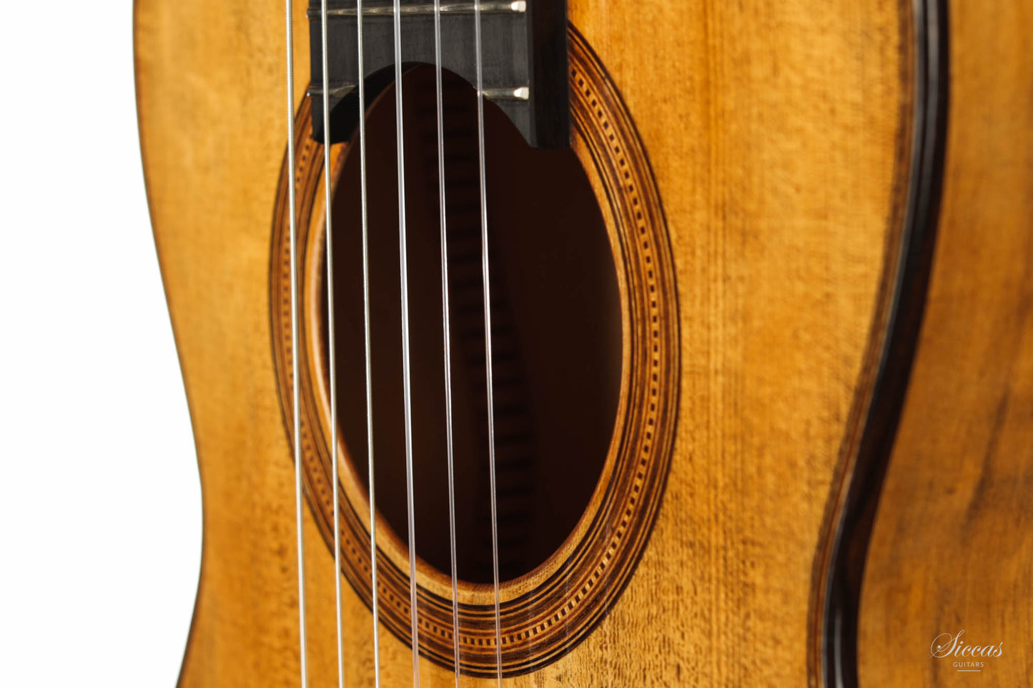 It is a real joy to play this guitar, what an exciting and inspiring instrument. When we took the guitar in our hands for the first time, we were all more than amazed about the full and appealing sound that emerges from a guitar with such a relatively small body. Crystal clear trebles with responsive basses produce a smooth, sweet sound with a reminiscence of historical instruments. Cypress back and sides paired with an aesthetically aged top make for a responsive instrument where the player can actually sense the feedback. This magnificent Torres model is equipped with modern machine heads instead of pegs, which makes it much easier to tune, but still fits into the overall picture