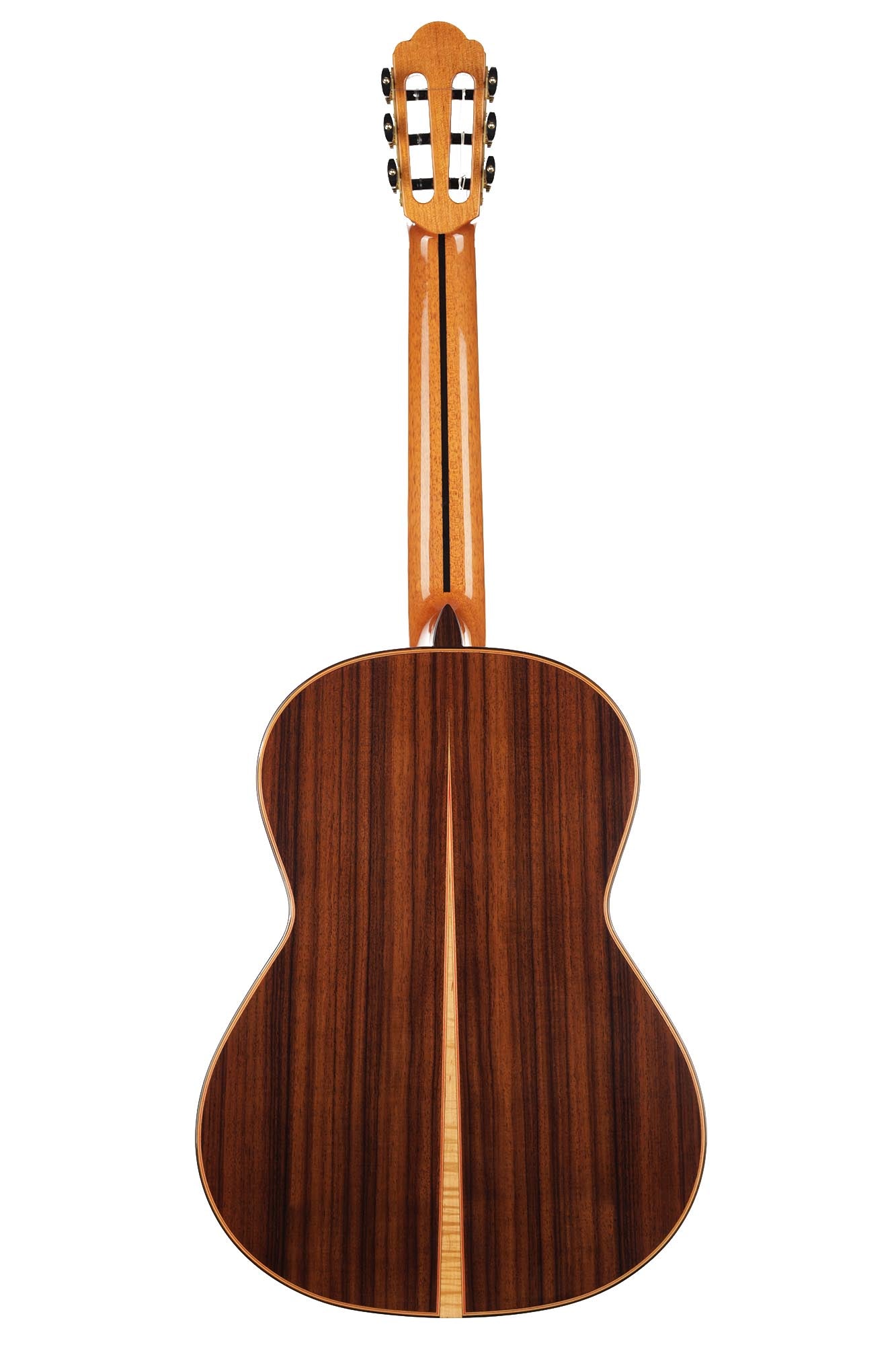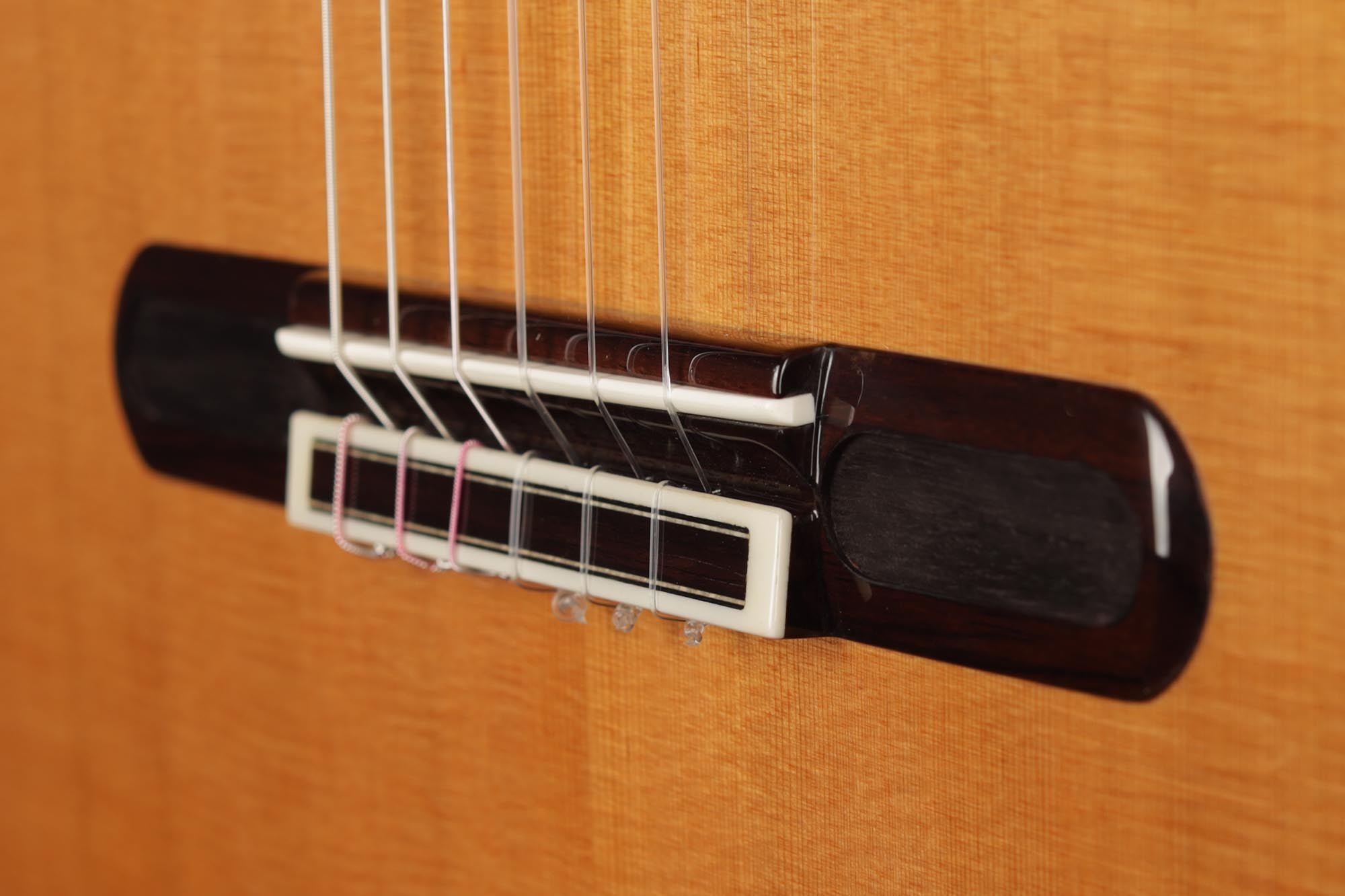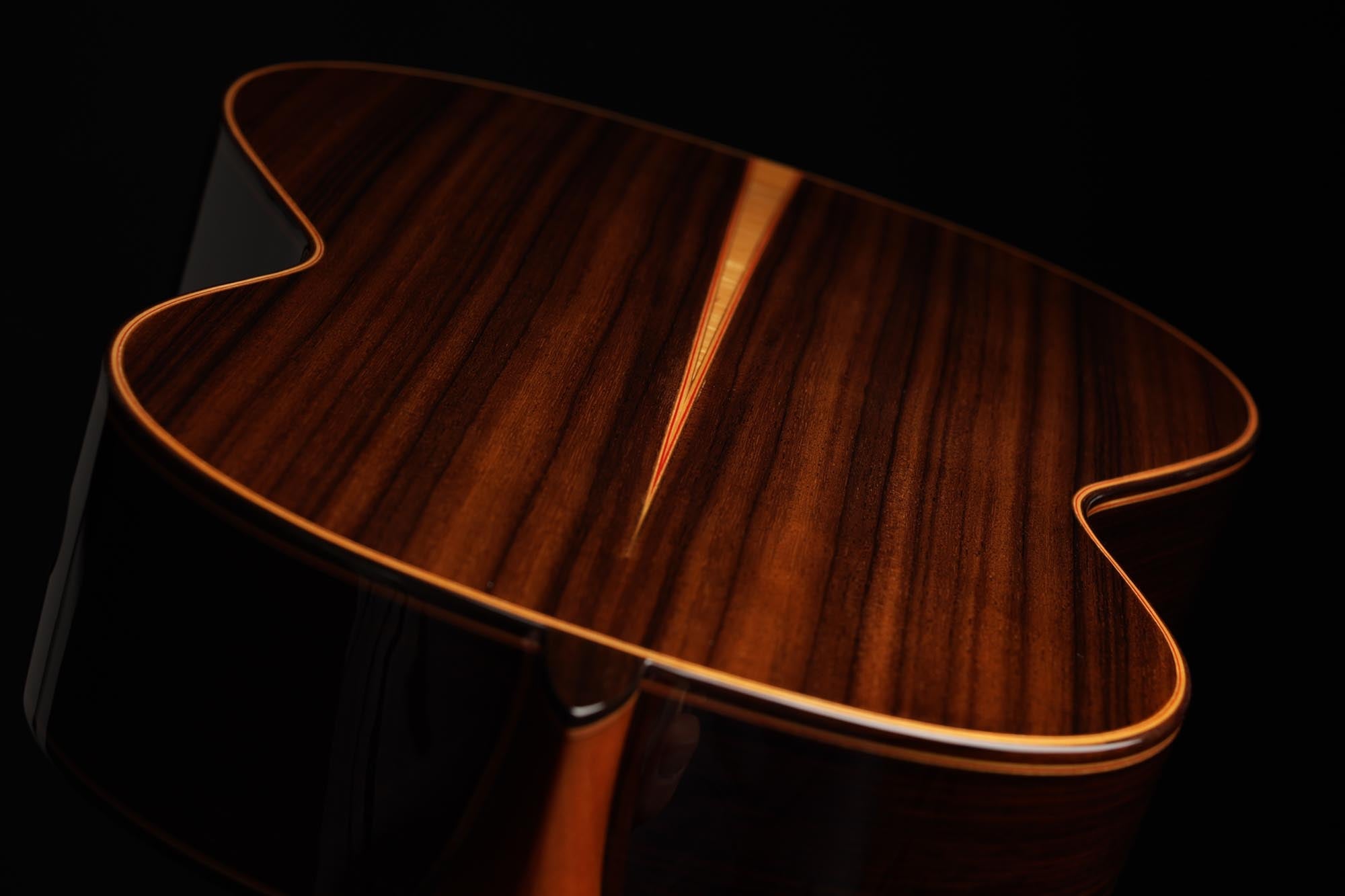 Für dieses Chamber-Concert-Modell wurde die neueste Gitarrenbautechnologie verwendet: eine Doppeldecke aus zwei ultradünnen Schichten von erstklassigem Zedernholz auf beiden Seiten einer Nomex-Schicht, um die für die Haltbarkeit der Decke erforderliche Festigkeit zu gewährleisten. Durch den Einsatz dieser Technik wird auch das Gewicht der Decke reduziert und damit das Klangvolumen und die Ansprache der Gitarre deutlich verbessert. Boden und Zargen sind aus indischen Palisanderholz gefertigt, gewölbt wie bei einer Geige. Diese Technik verleiht der Gitarre eine erstaunliche Klangprojektion und ein beeindruckendes Klangvolumen, was sie ideal für Konzertauftritte macht. Darüber hinaus ist der obere Teil des Korpus abgesenkt, um ein "erhöhtes Griffbrett" im Stil von Humphrey-Gitarren zu erhalten. Dank dieser leichten Anpassung der Höhe des Griffbretts wird die Bespielbarkeit in hohen Lagen stark verbessert.