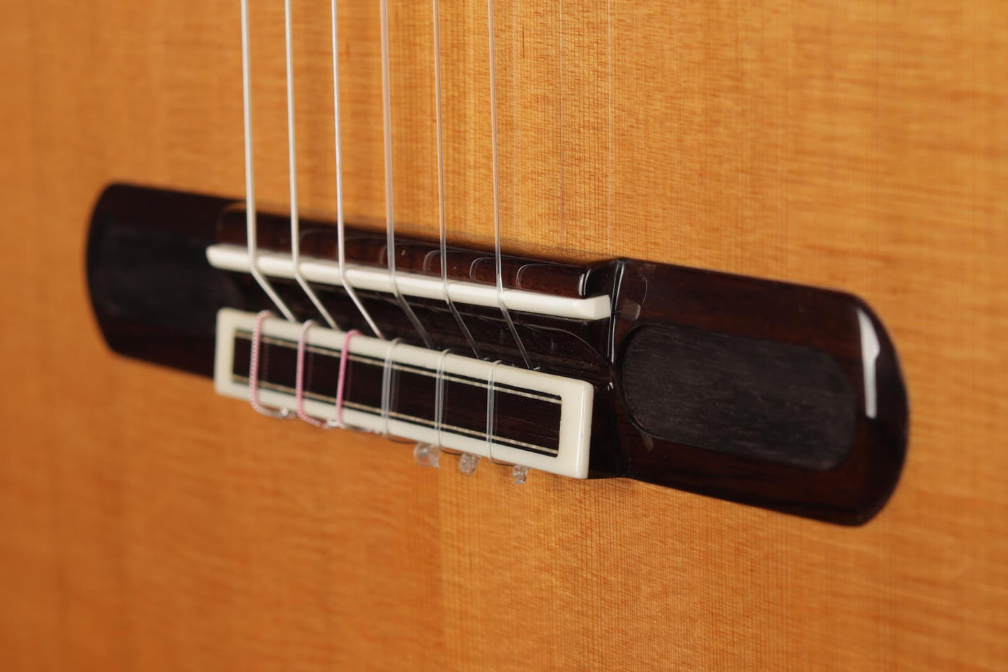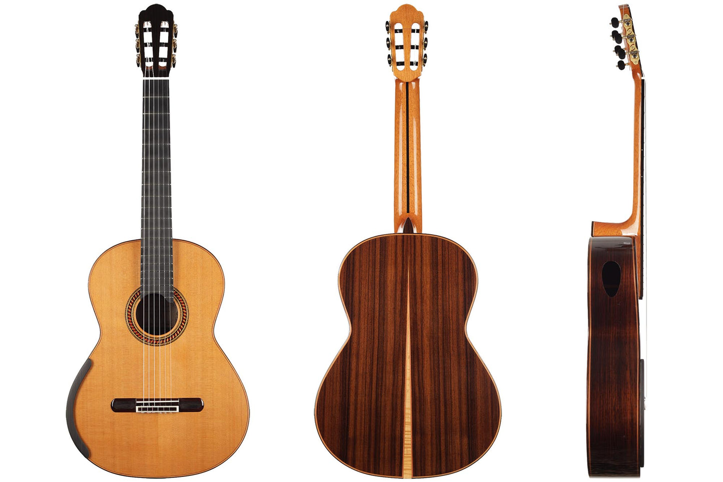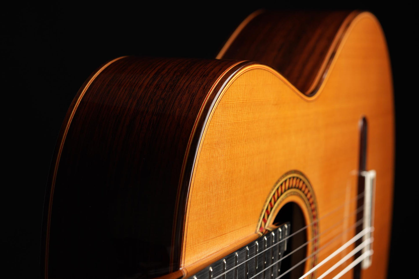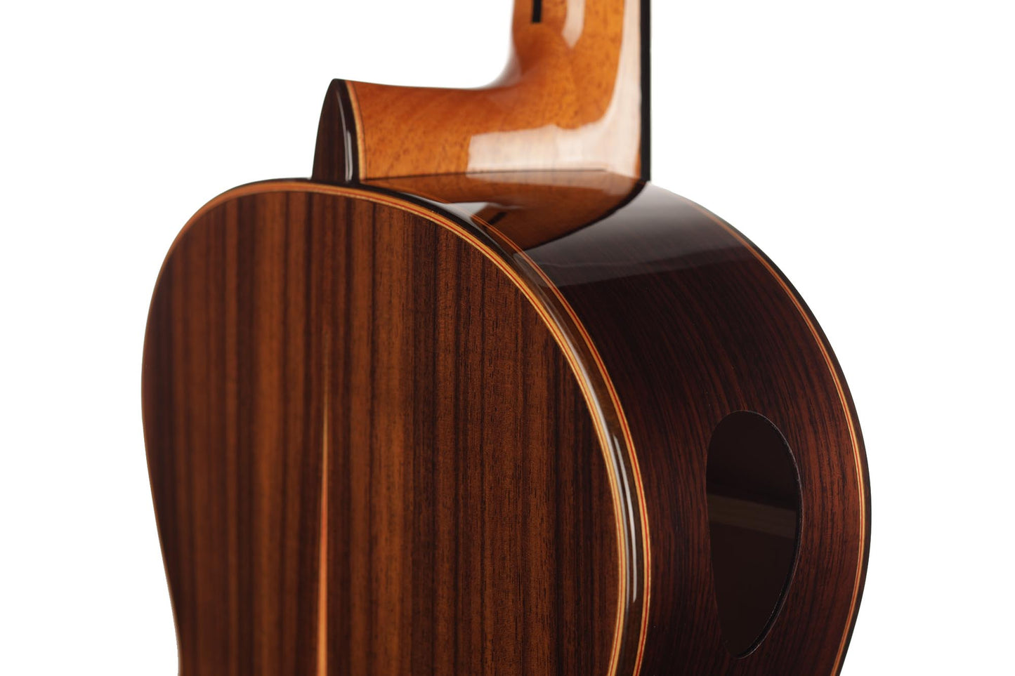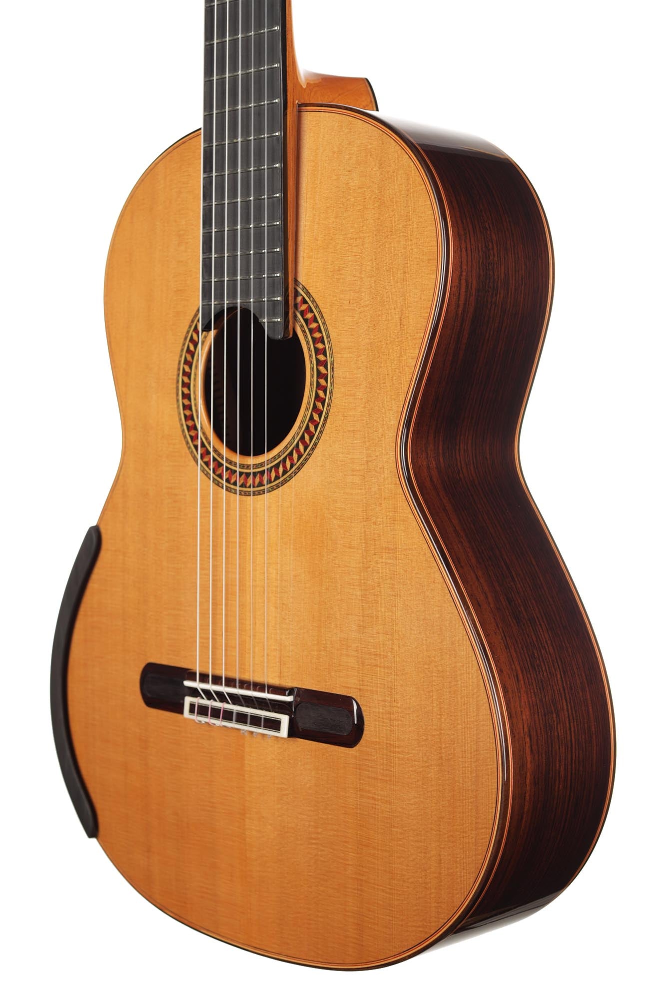For this Chamber Concert model, the latest classical guitar technology was used: double-top with two ultra-thin layers of first-class cedar on either side of a layer of Nomex to give the strength needed for the durability of the top. Using this technique also reduces the soundboard’s weight, and therefore enhances the guitar’s sound volume and responsiveness by far. Back and sides are made of Indian Rosewood, arched in the manner of the violin. This technique gives the guitar an amazing sound projection and volume, making it ideal for concert performances. Moreover, the upper bout of the body is sloped to provide a ‘raised fingerboard’ in the style of Humphrey guitars. Thanks to this slight change in the height of the fretboard, the playability of the trebles in high positions is greatly improved. A techwood armrest, ultra-smooth frets along with an extra sound port on the side, and a low string action make the Chamber Concert model exceptionally easy and comfortable to play.
