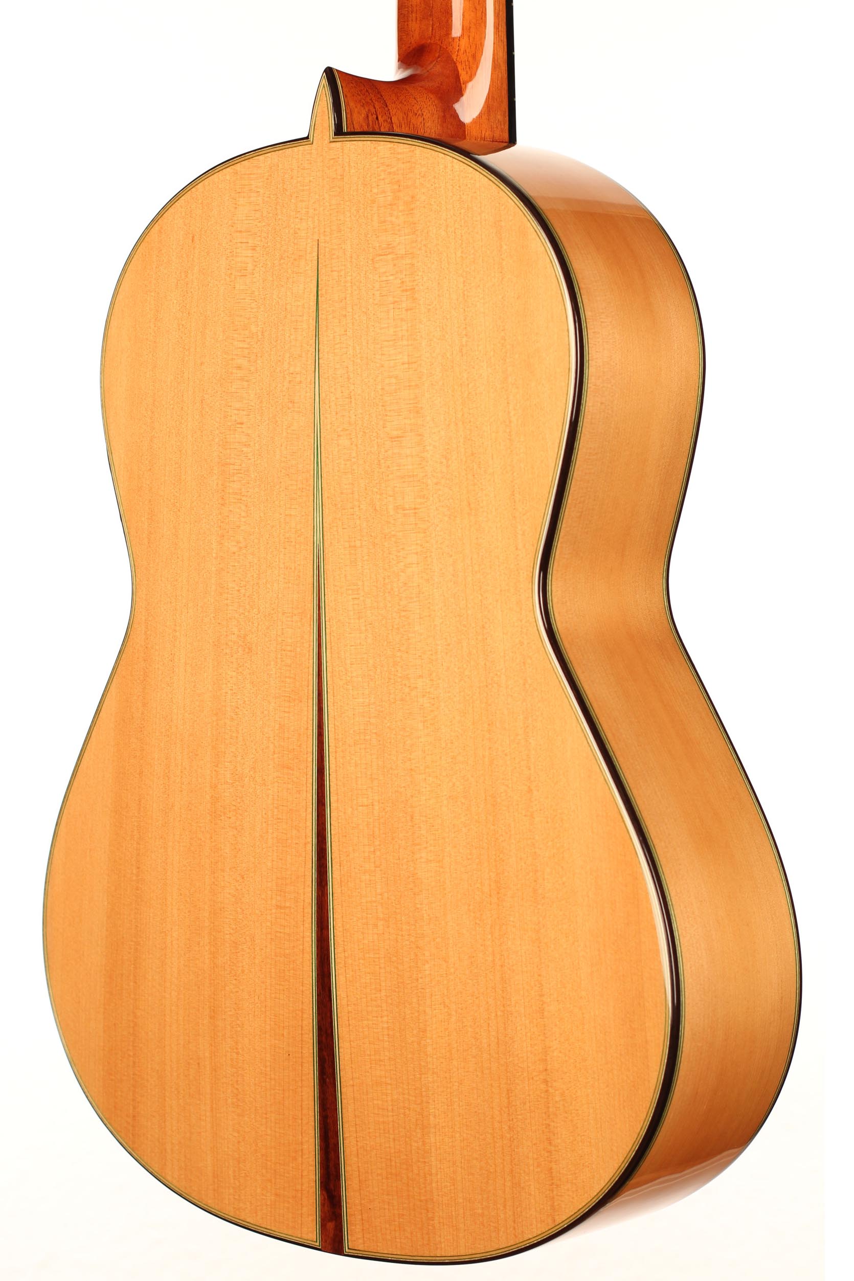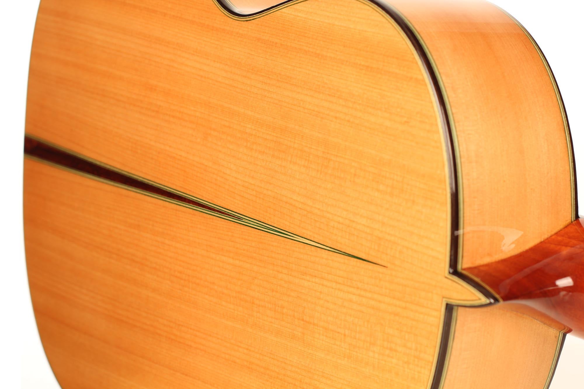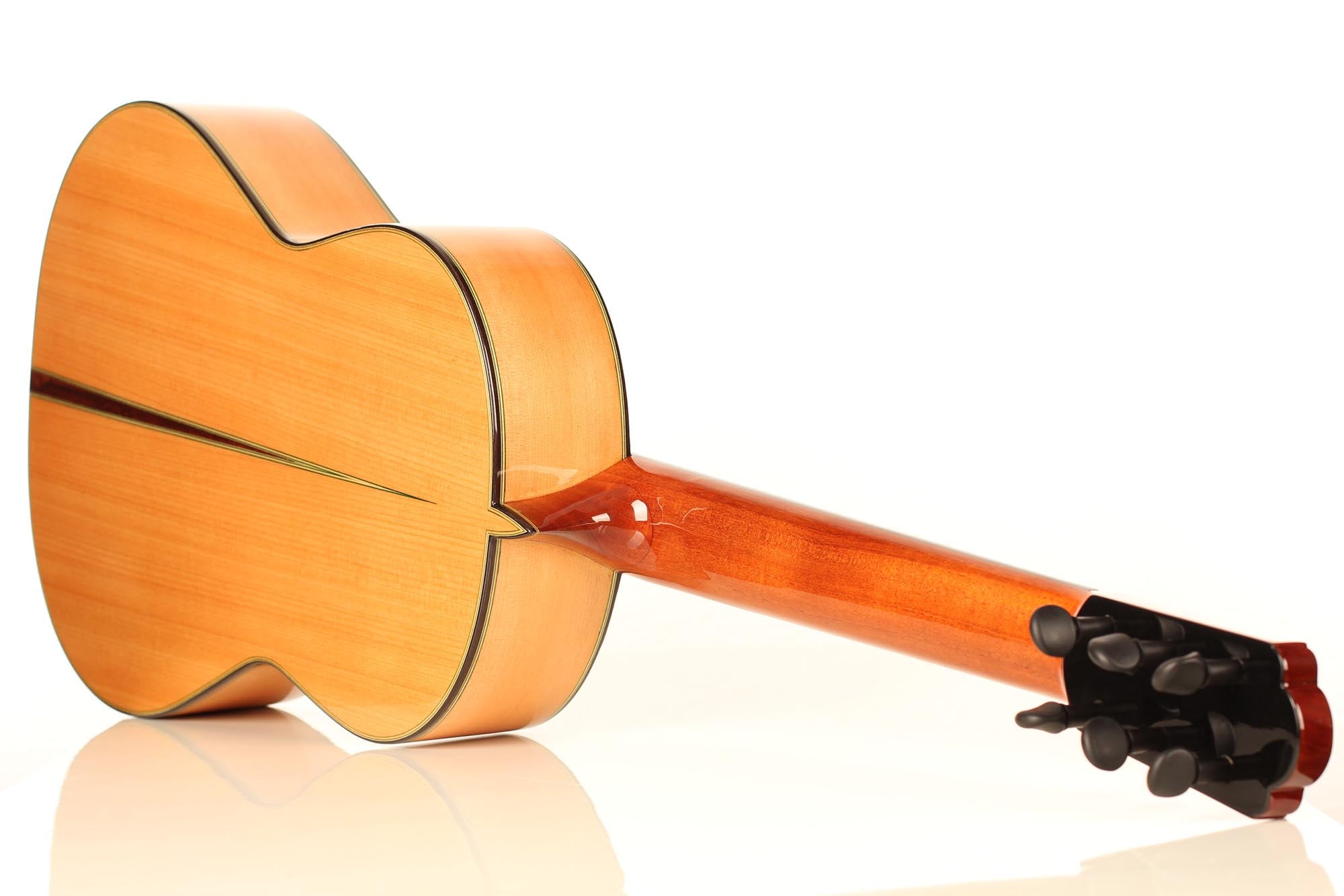 This modern flamenco guitar was hand made by the renowned Chinese luthier Yulong Guo. It is a very special flamenco instrument as the modern technology of the double top was implemented in the construction under the system of a partly hollow spruce top, which is reinforced by light spruce and cedar fans. It has a huge volume and is incredibly comfortable to play. The immediate response and the direct incisive attack of the tones show the true flamenco character of this instrument. The deep basses have a very impressive warmth and give a great body to melodic bass lines.