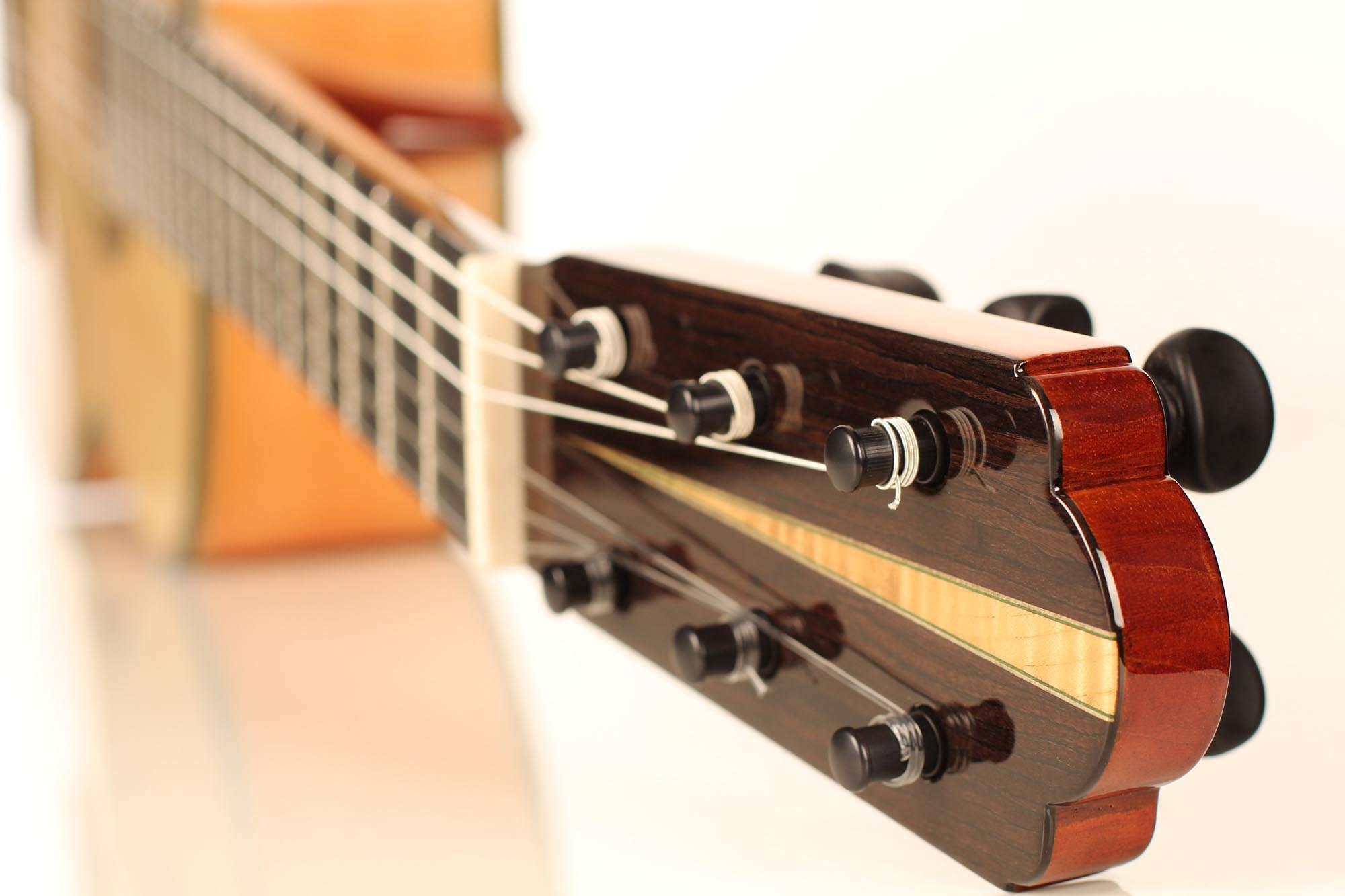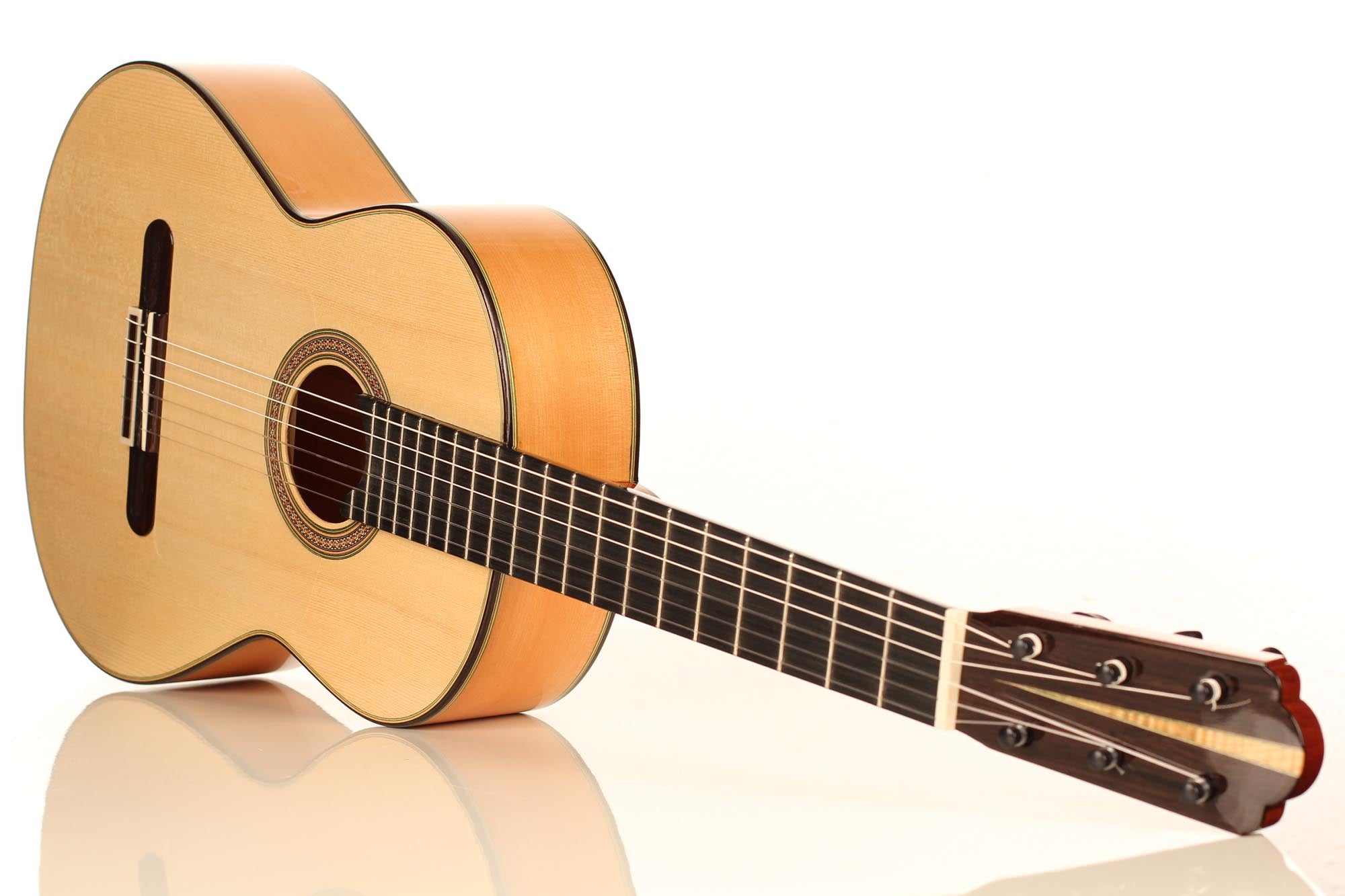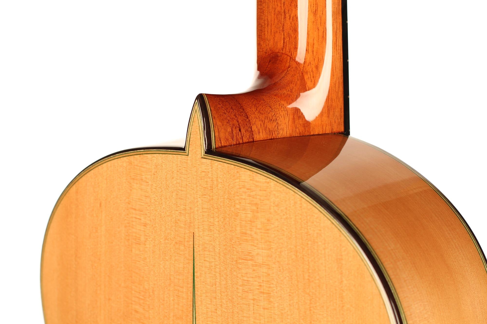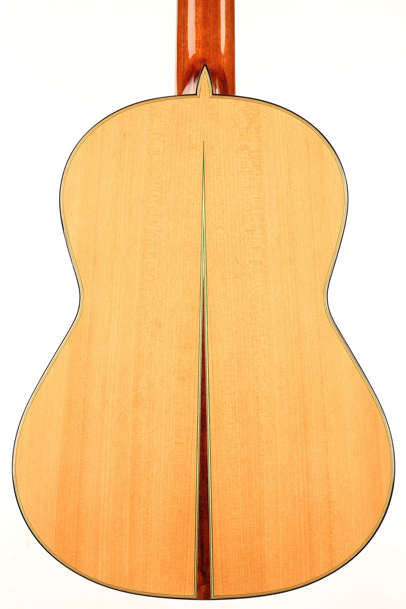 This modern flamenco guitar was hand made by the renowned Chinese luthier Yulong Guo. It is a very special flamenco instrument as the modern technology of the double top was implemented in the construction under the system of a partly hollow spruce top, which is reinforced by light spruce and cedar fans. It has a huge volume and is incredibly comfortable to play. The immediate response and the direct incisive attack of the tones show the true flamenco character of this instrument. The deep basses have a very impressive warmth and give a great body to melodic bass lines.