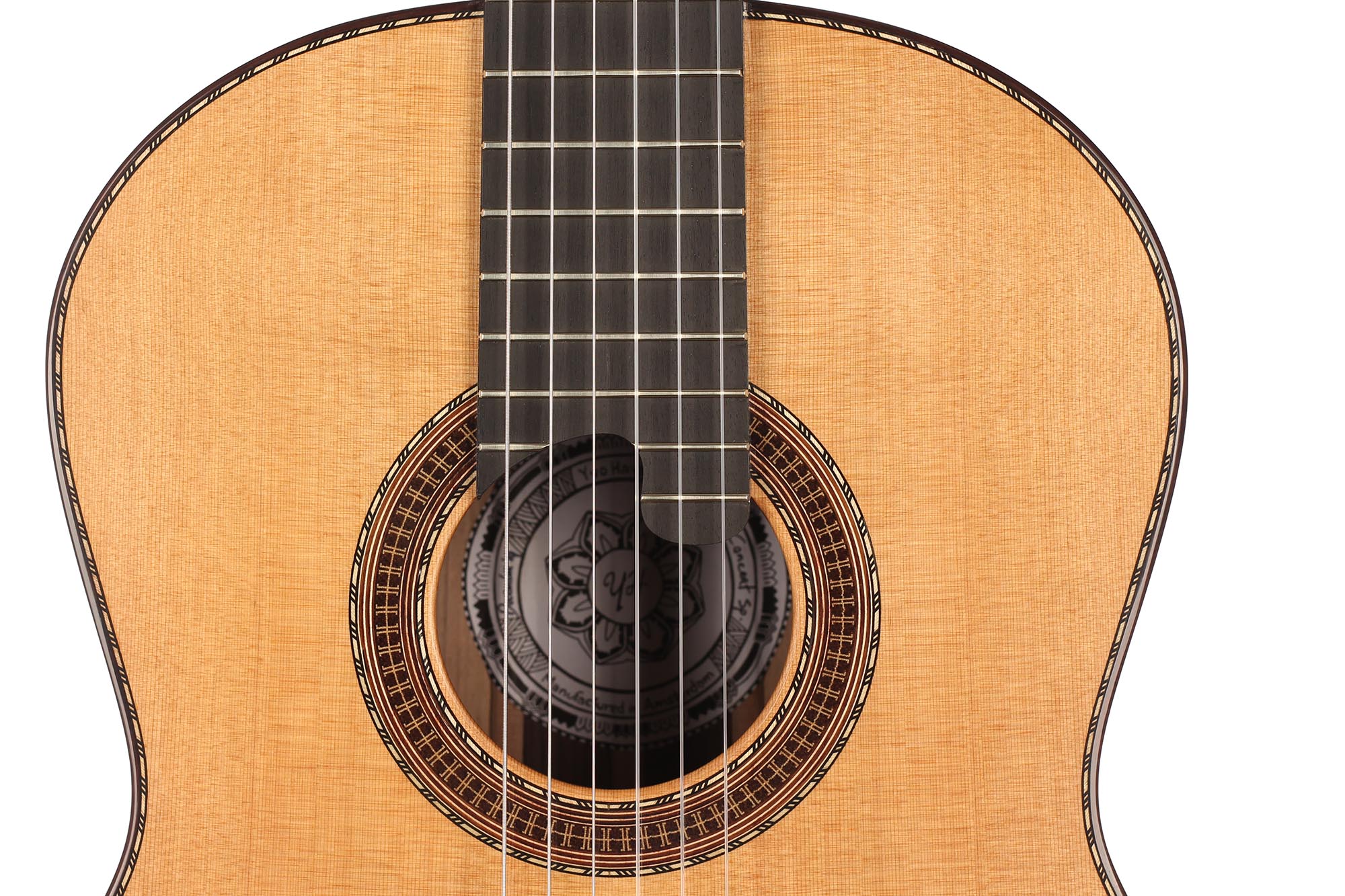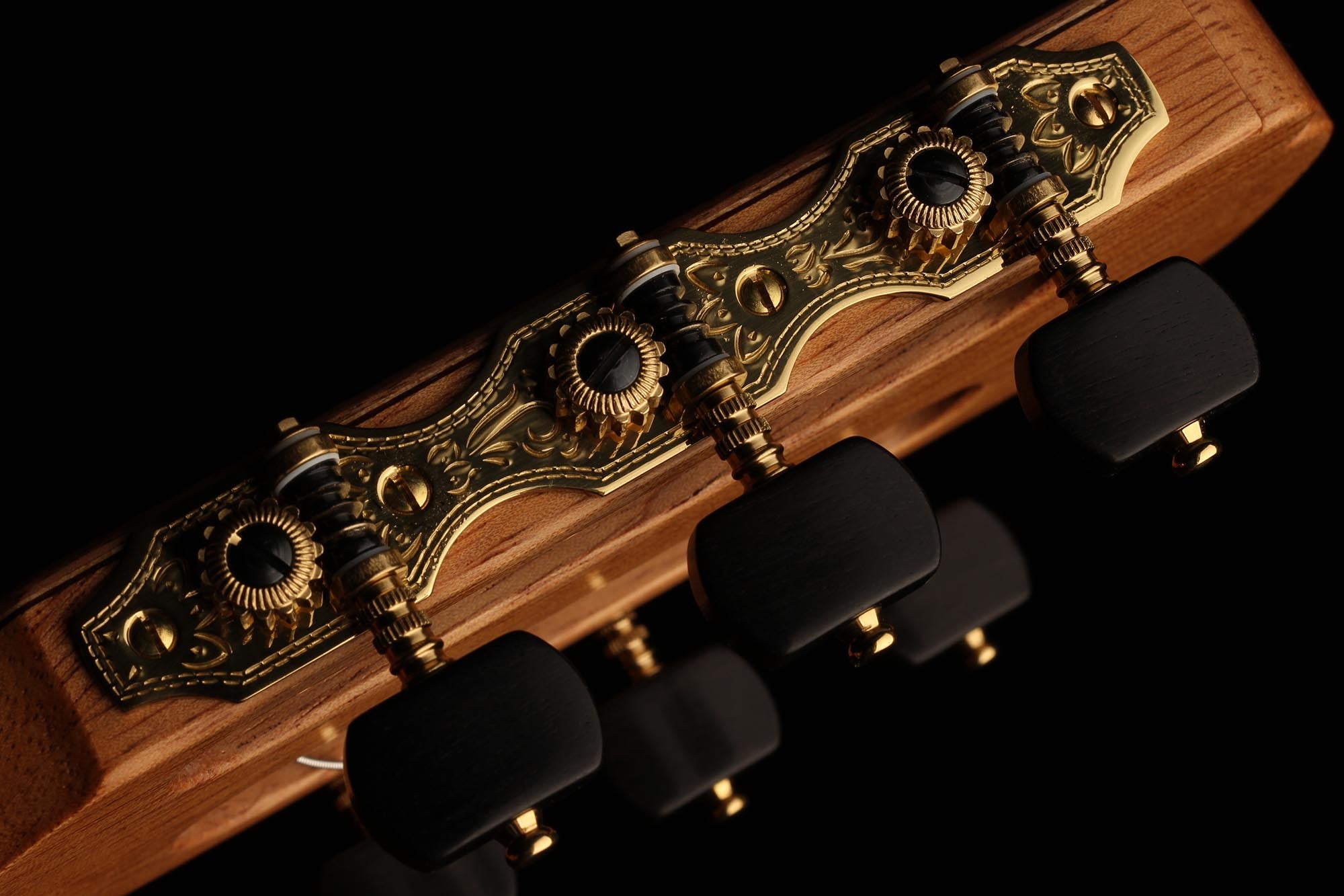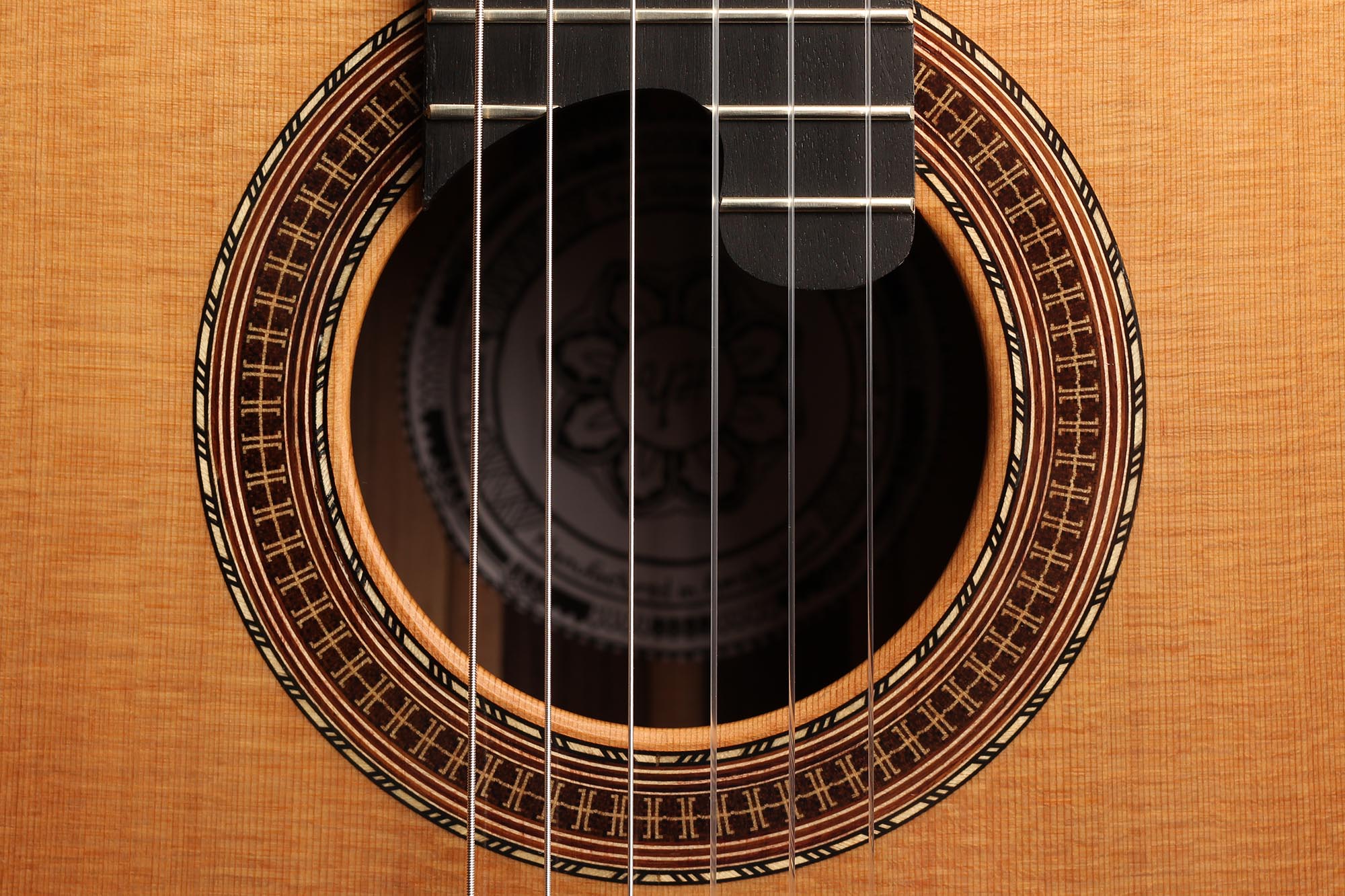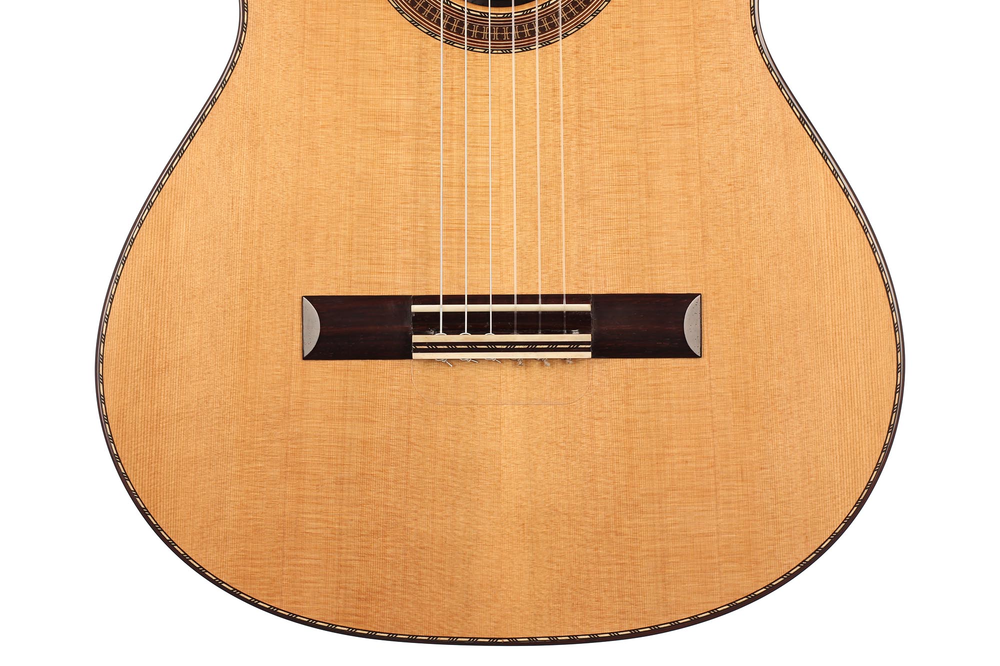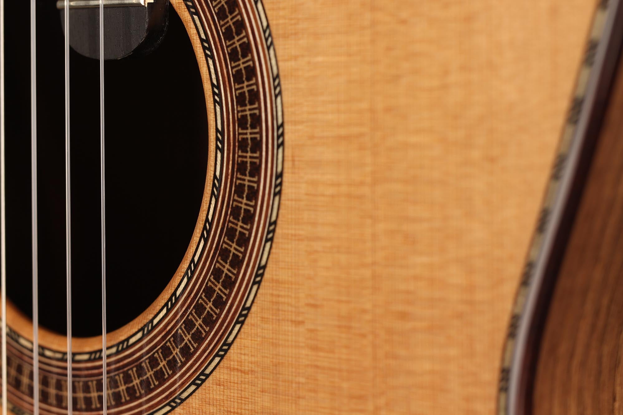 The combination of a cedar soundboard and a spruce traditional bracing gives the instrument a great softness and a clear precise sound at the same time. The playability is splendid for both the left and right hand. This instrument leaves the guitarist great freedom allowing to approach all the repertoires. Moreover, the sound volume is generous, and the general aesthetics absolutely charming.