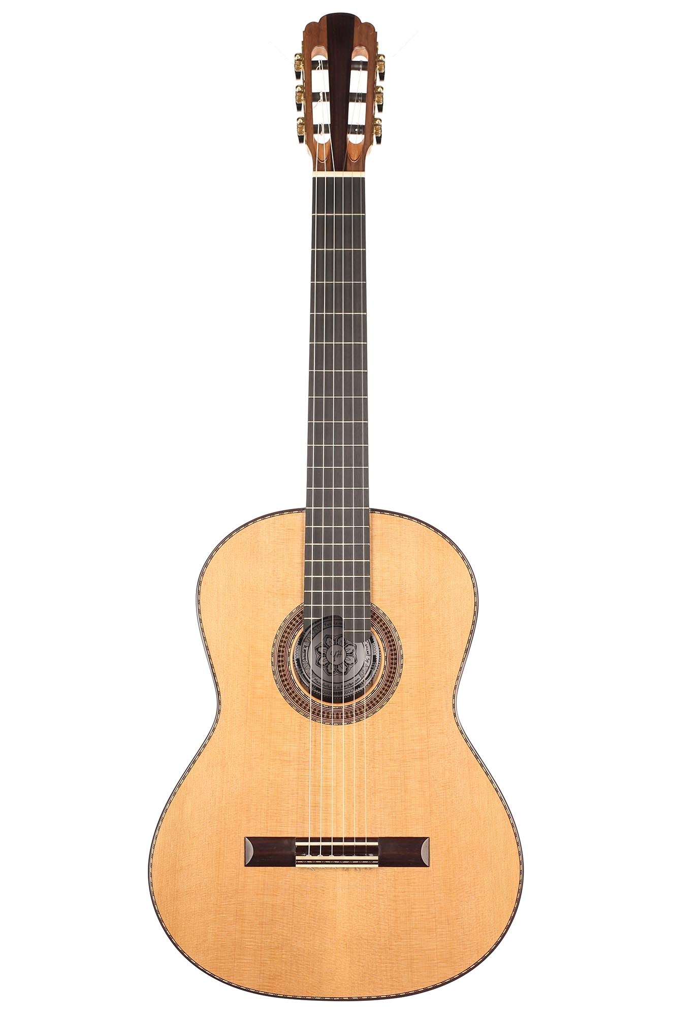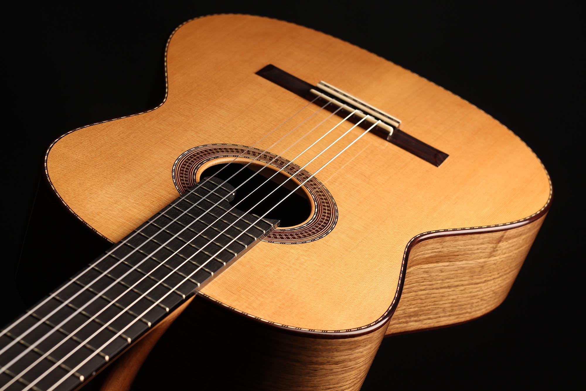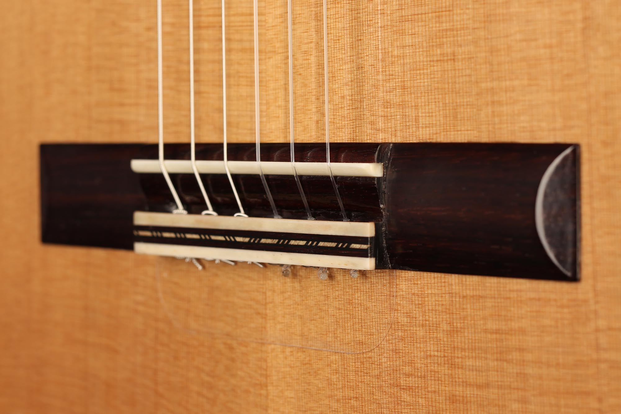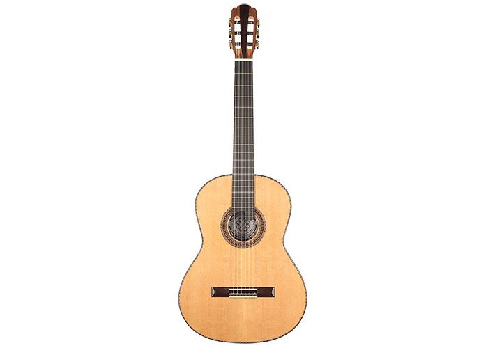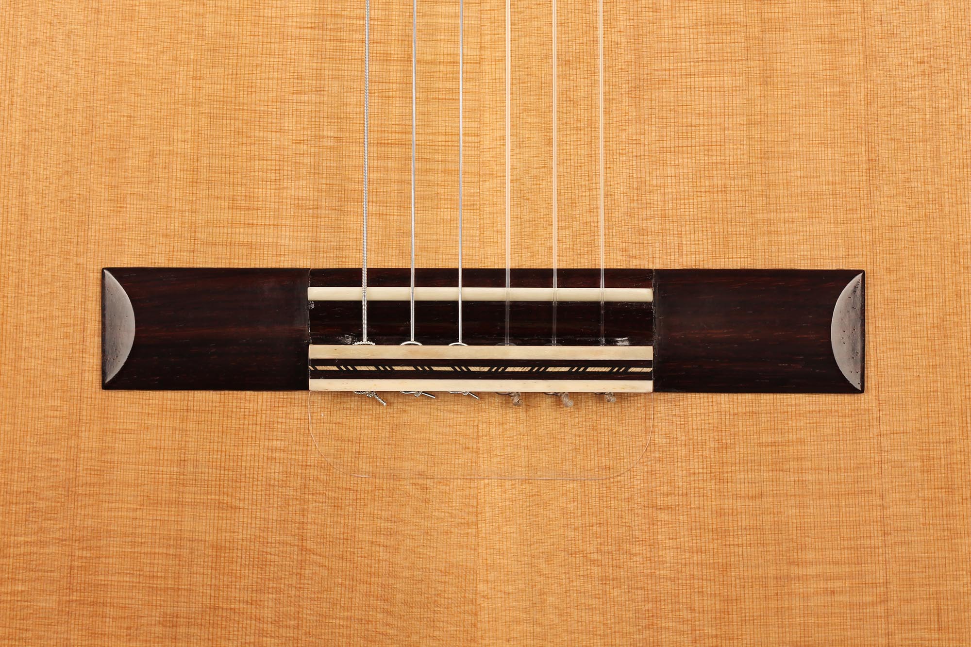 The combination of a cedar soundboard and a spruce traditional bracing gives the instrument a great softness and a clear precise sound at the same time. The playability is splendid for both the left and right hand. This instrument leaves the guitarist great freedom allowing to approach all the repertoires. Moreover, the sound volume is generous, and the general aesthetics absolutely charming.