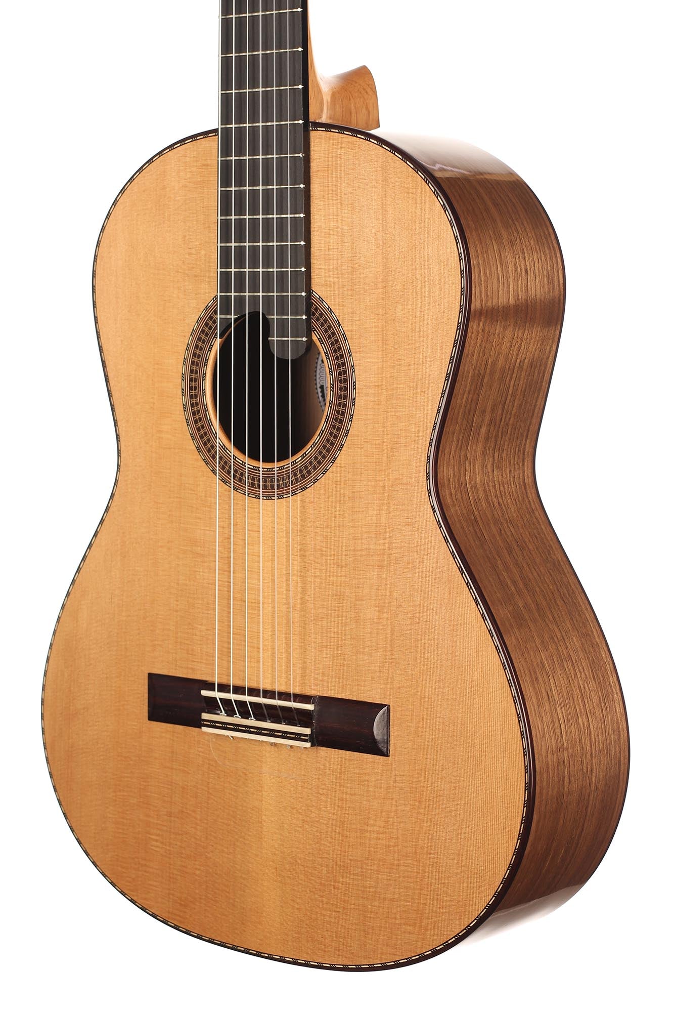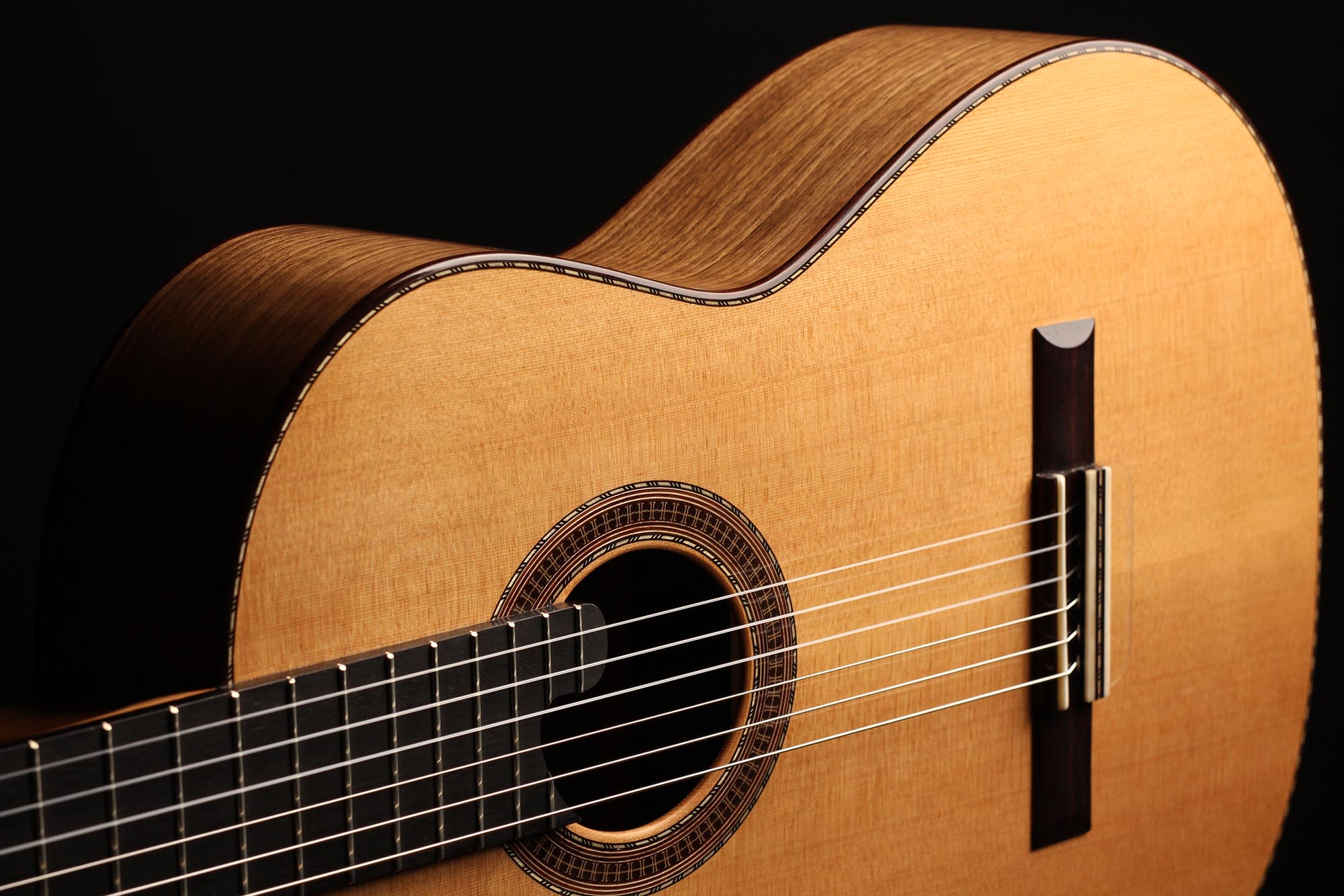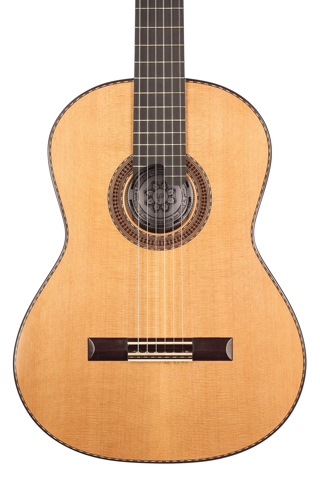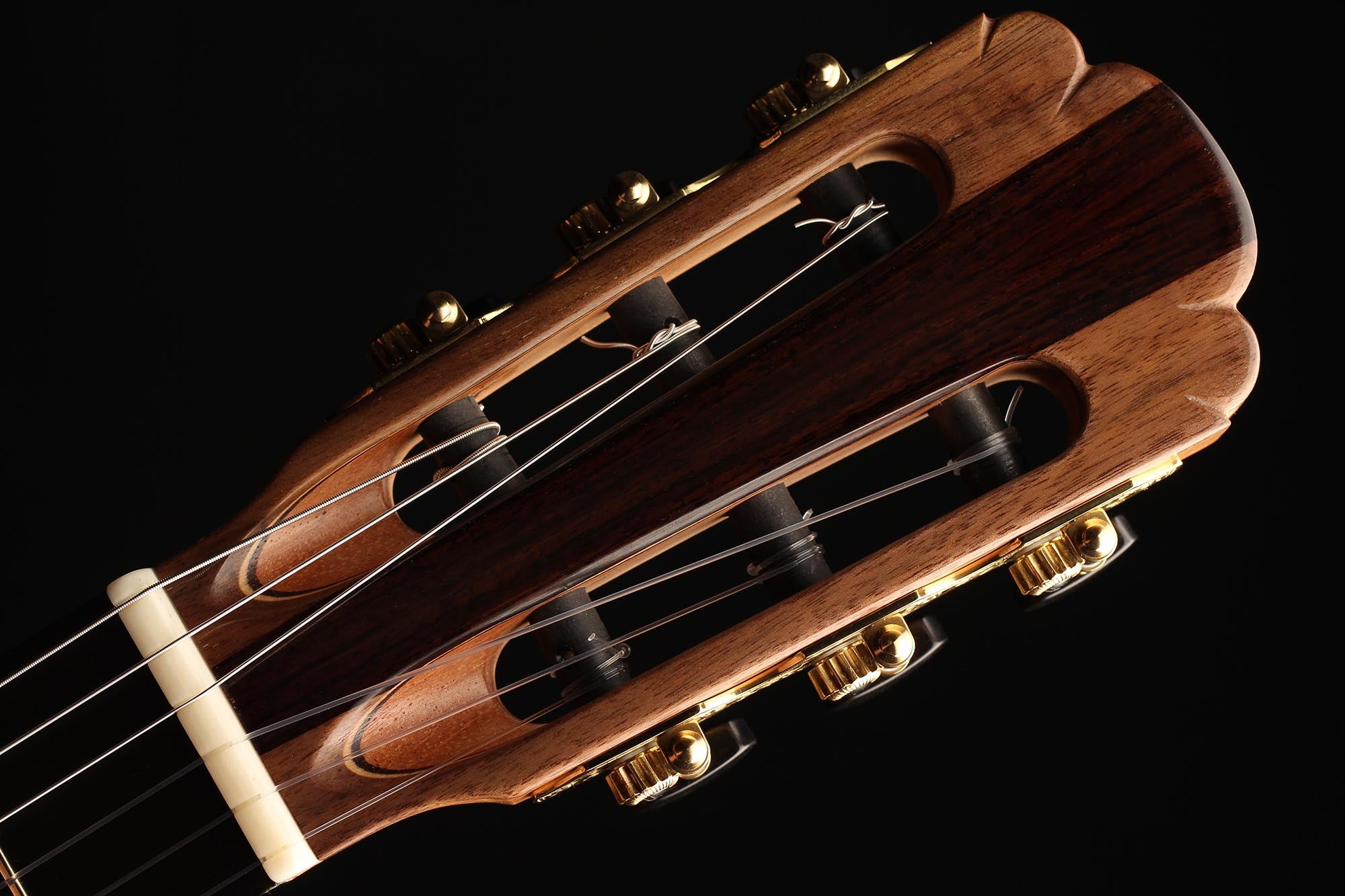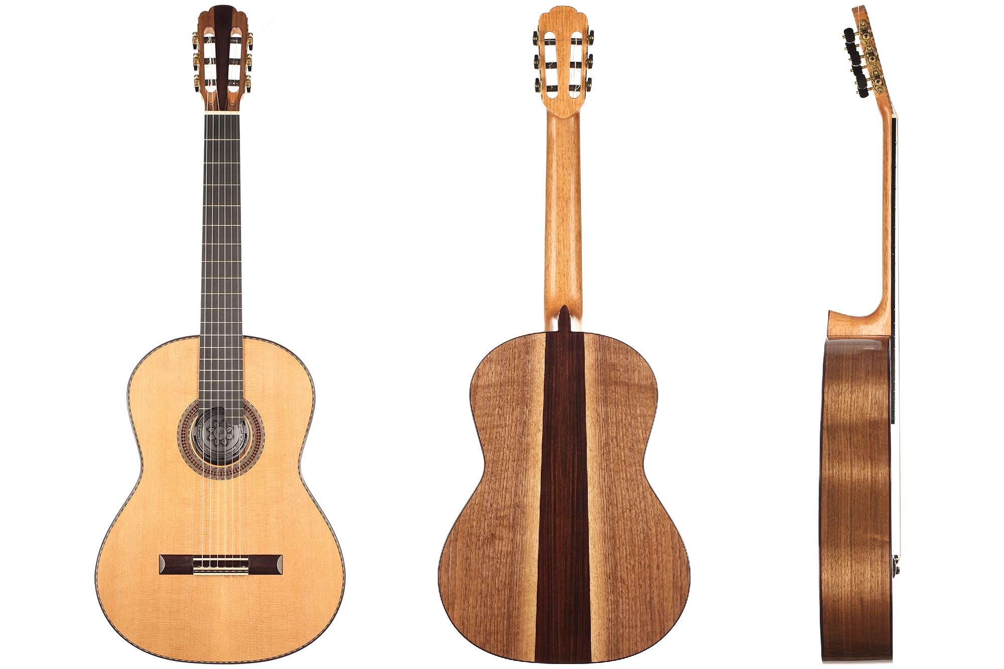 The combination of a cedar soundboard and a spruce traditional bracing gives the instrument a great softness and a clear precise sound at the same time. The playability is splendid for both the left and right hand. This instrument leaves the guitarist great freedom allowing to approach all the repertoires. Moreover, the sound volume is generous, and the general aesthetics absolutely charming.